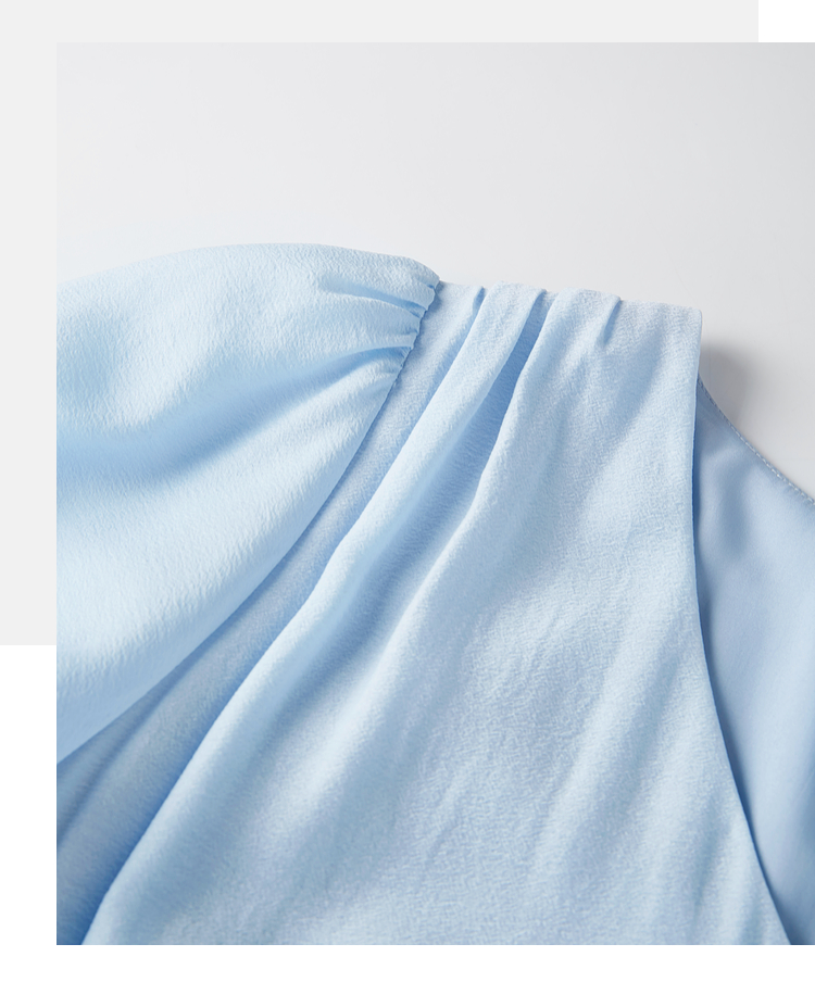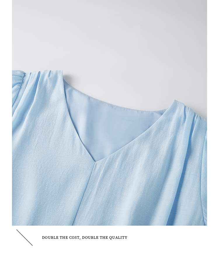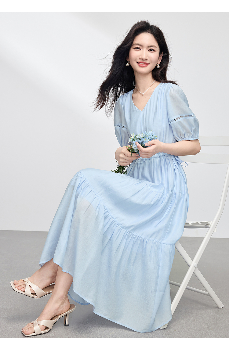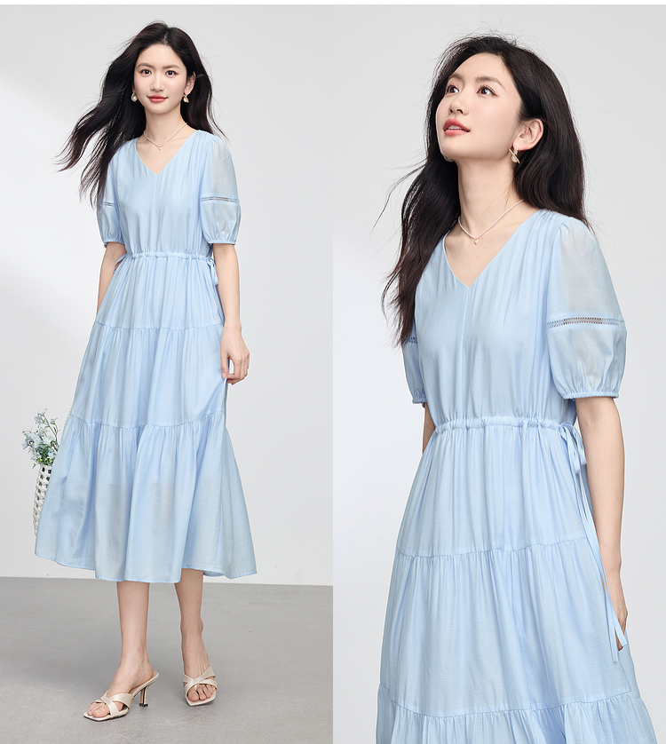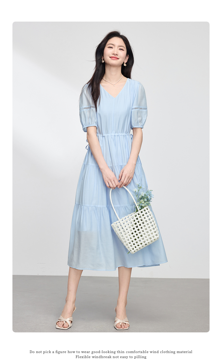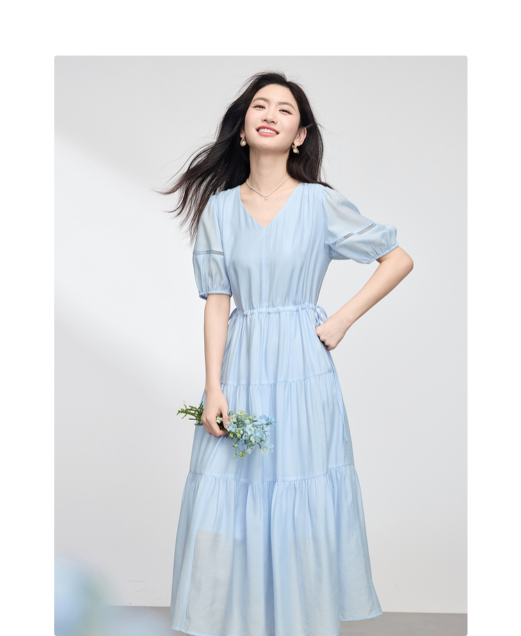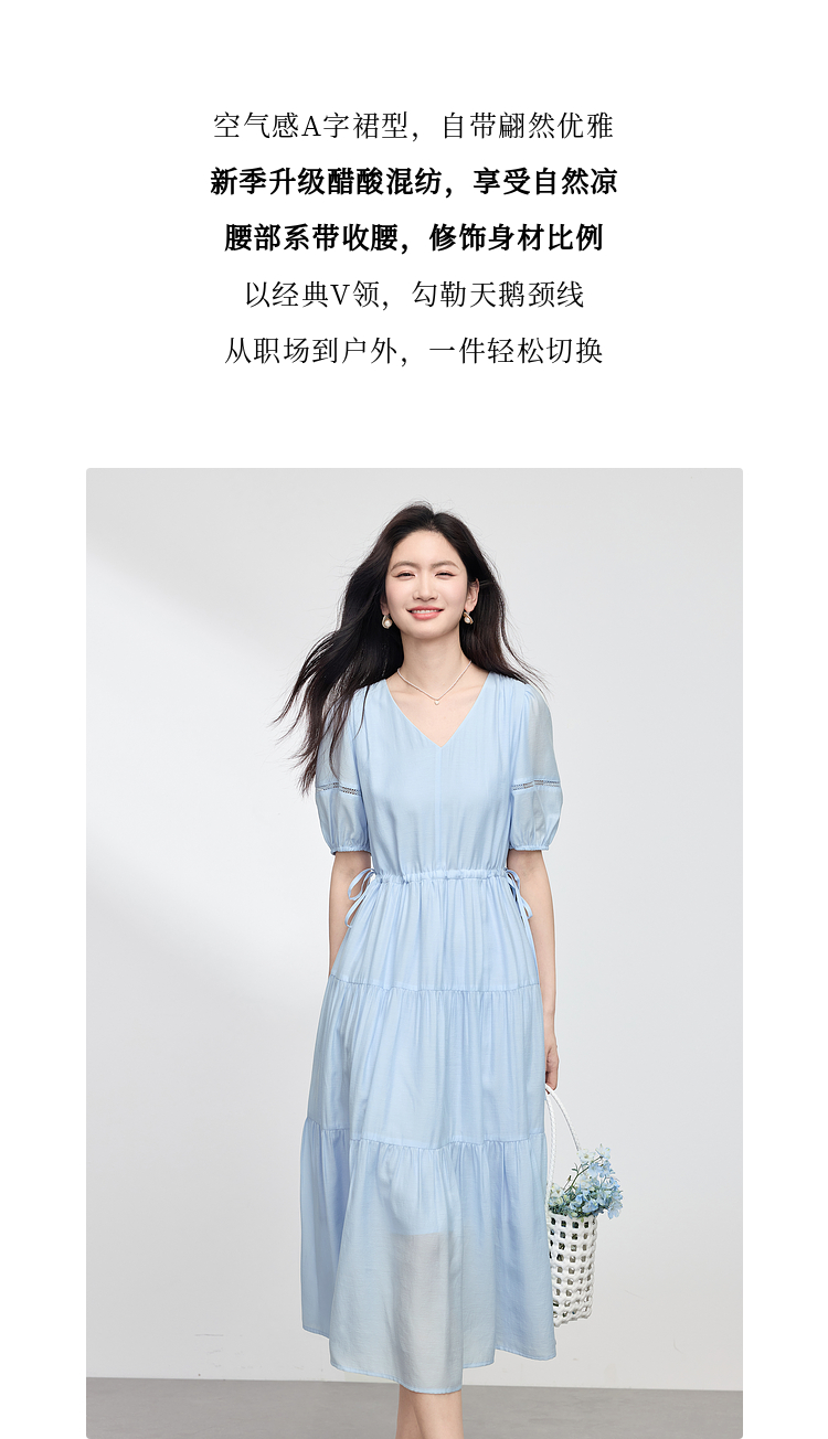 熙世界法式V领蓝色连衣裙女夏季气质收腰泡泡袖醋酸a字蛋糕裙子