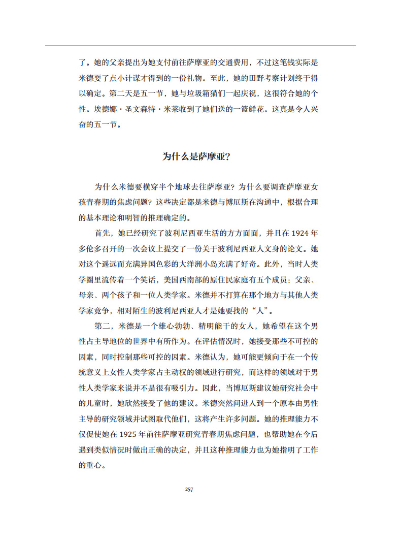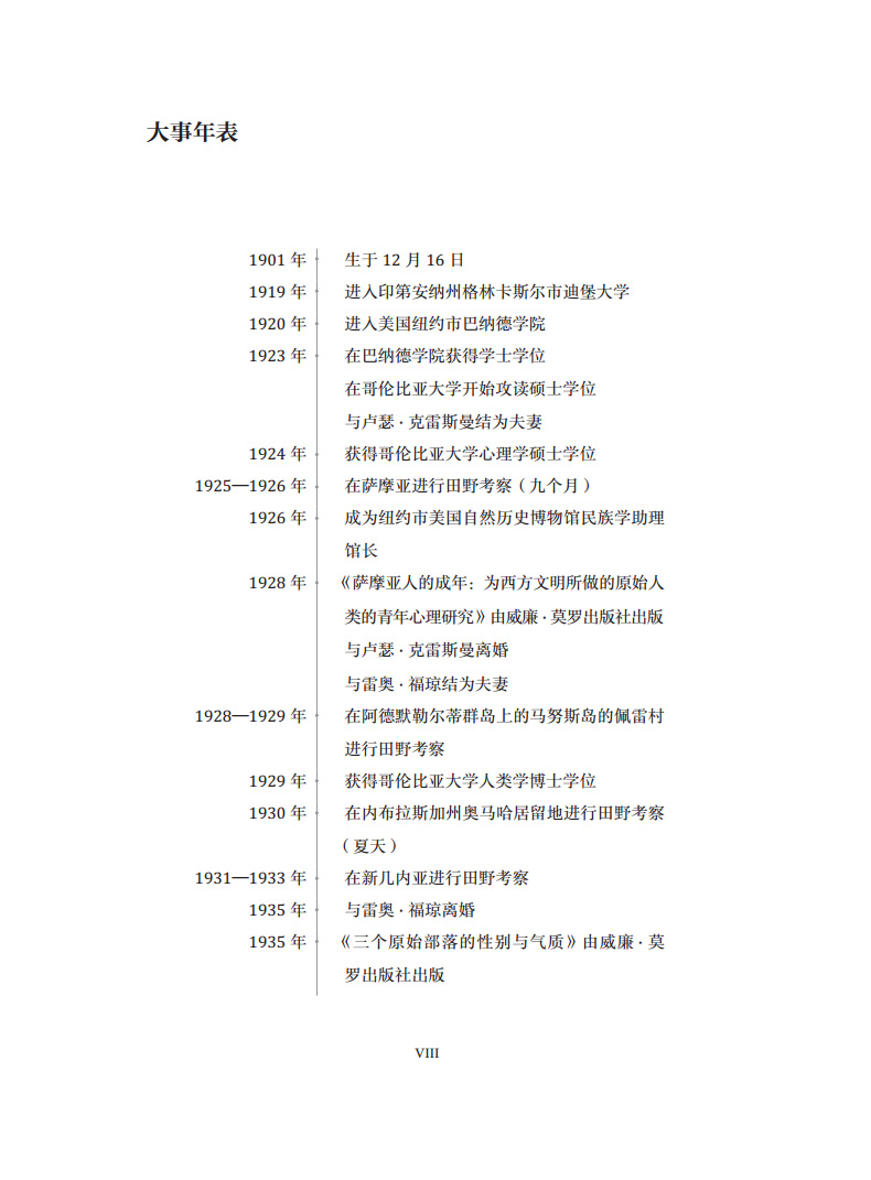 玛格丽特·米德的一生颇具传奇色彩:还未满 24岁,米德便独自前往南太平洋的美属萨摩亚进行田野考察;作为一名人类学家,她力排众难,在学术领域辟出自己的一片天地;作为一名独立女性,她不顾外界的眼光,勇敢追求爱情和幸福;作为一名母亲,她打破当时的惯例,坚持按需哺乳。玛格丽特·米德的思想和观念超越了同时代的很多人,也仍在影响着后世之人。