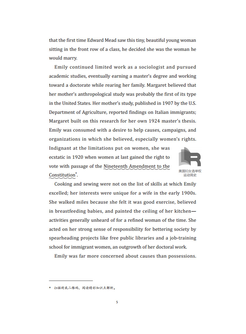 《人类学之母的传奇人生:玛格丽特·米德传》一书中既有原汁原味的英文,又有生动流畅的译文,书中还穿插了许多背景知识拓展,扫描封底二维码即可查看文内精彩知识点解析。玛格丽特·米德是美国的人类学家,美国现代人类学成形过程中最重要的学者之一。她提出的文化决定论与代沟理论对后世影响深远。本书客观记述了玛格丽特·米德的成长及她人类学研究的一生,她一次次跳出陈规,刷新了人类的自我认知。她活出了自己的精彩,也把独立质疑的精神传递给了后人。
