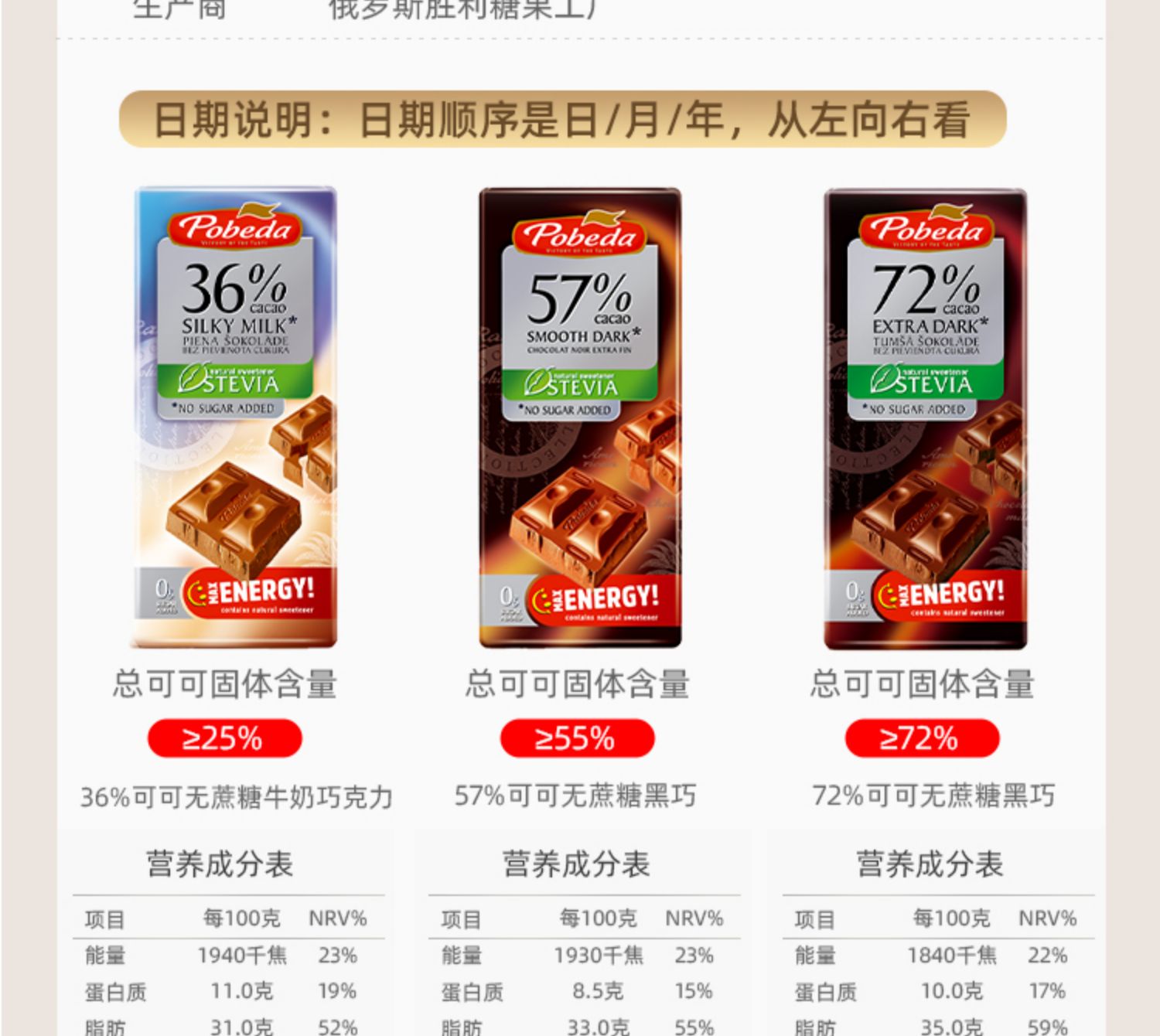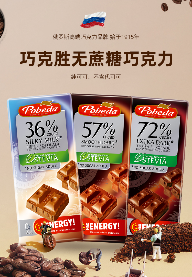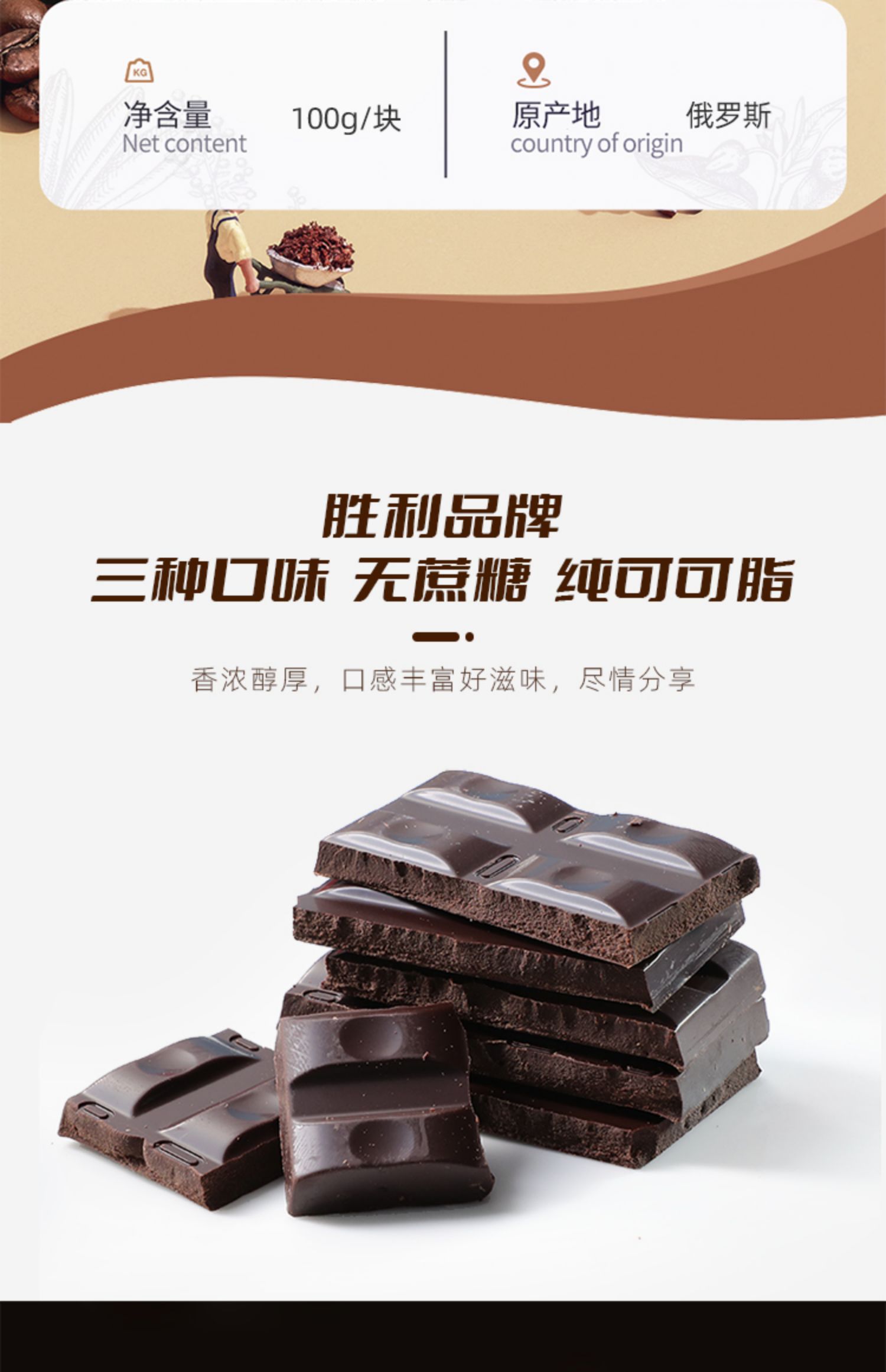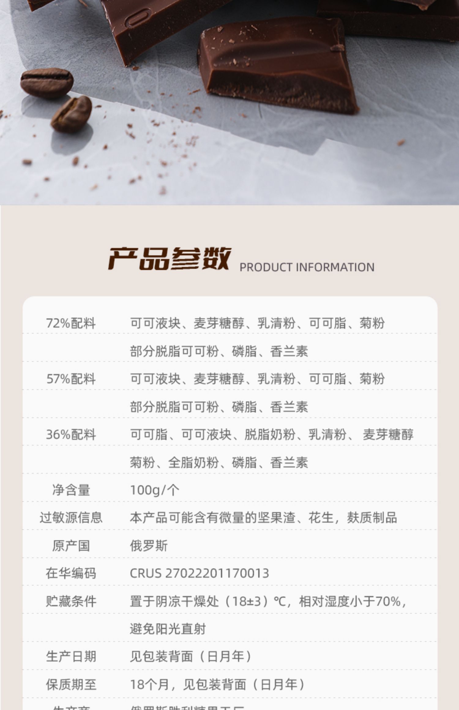 俄罗斯巧可胜72% / 36% / 57%特级黑巧克力制品100g 蜂窝状非蔗糖巧克力 045482/045484/045483