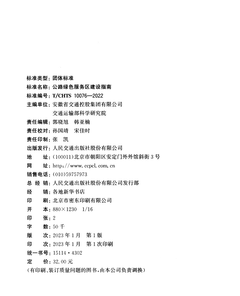书名:公路绿色服务区建设指南(T/CHTS 10076—2022)