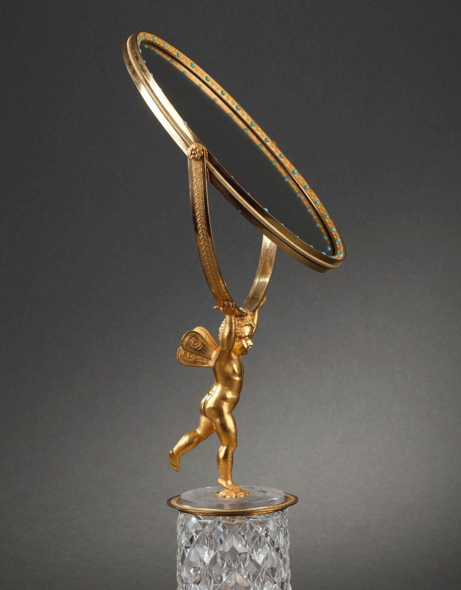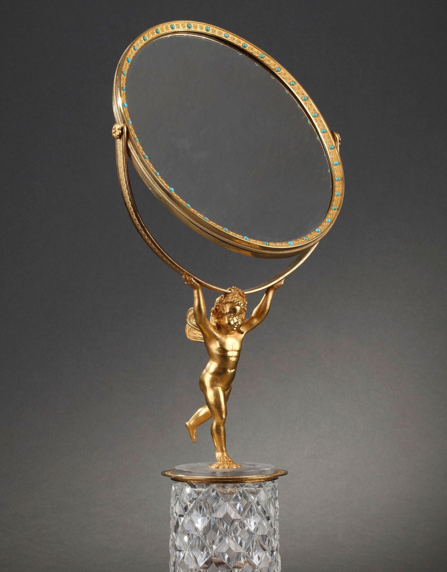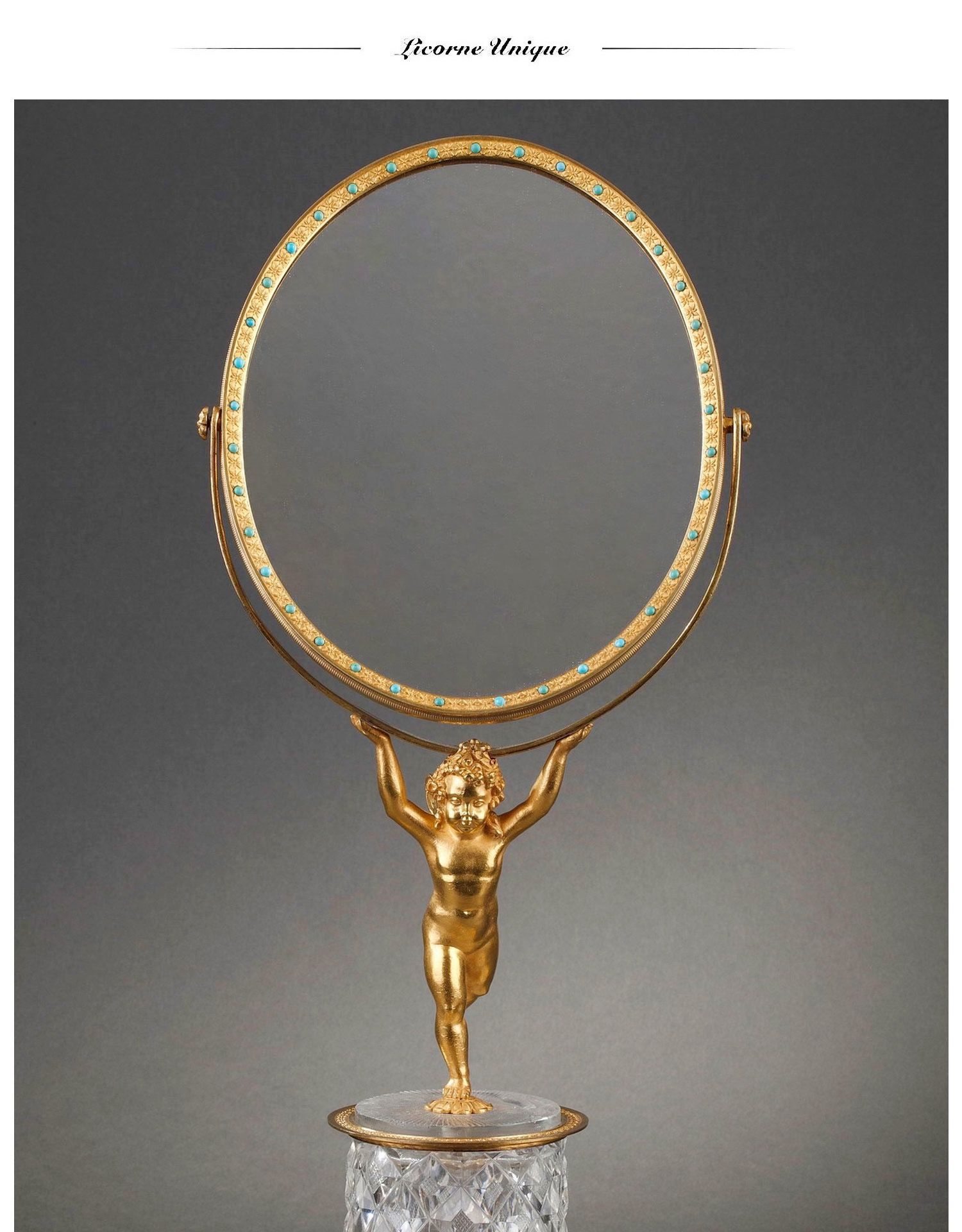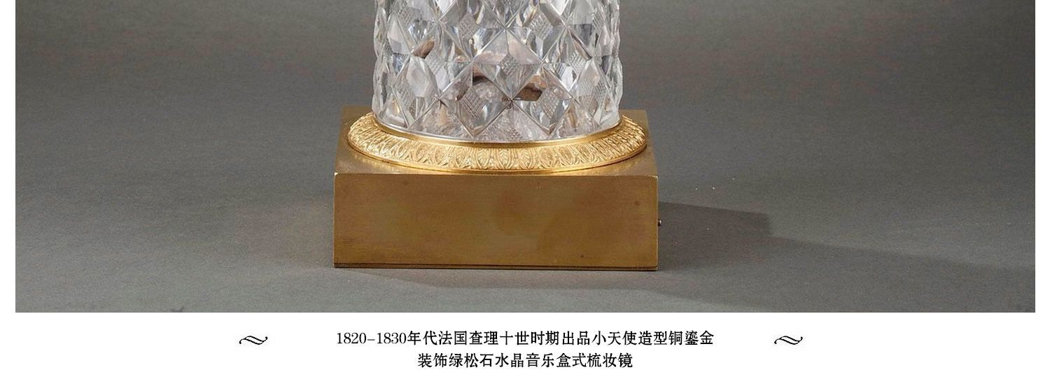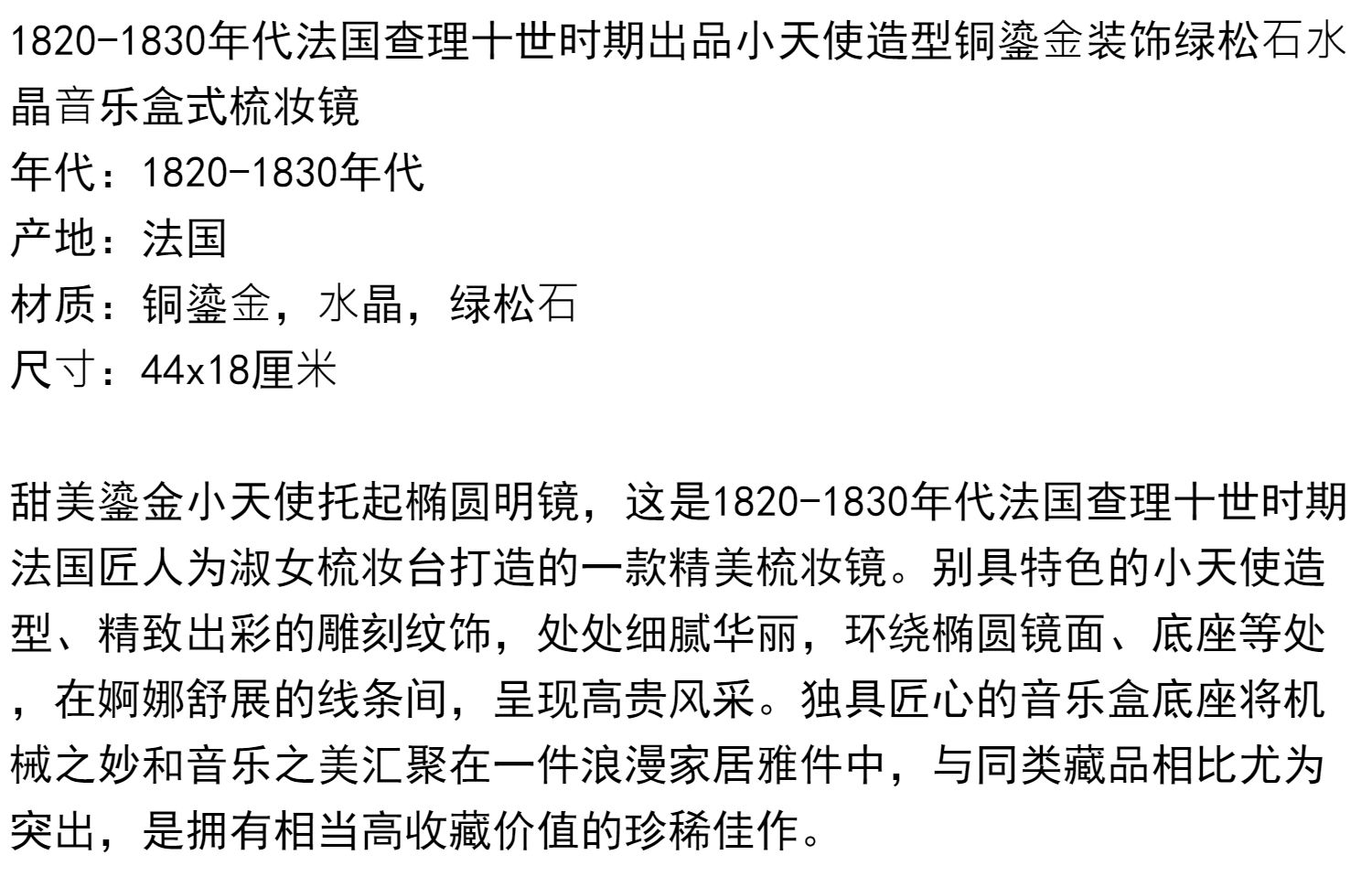独角鹿西洋古董法国小天使造型铜鎏⾦绿松⽯⽔晶⾳乐盒式梳妆镜