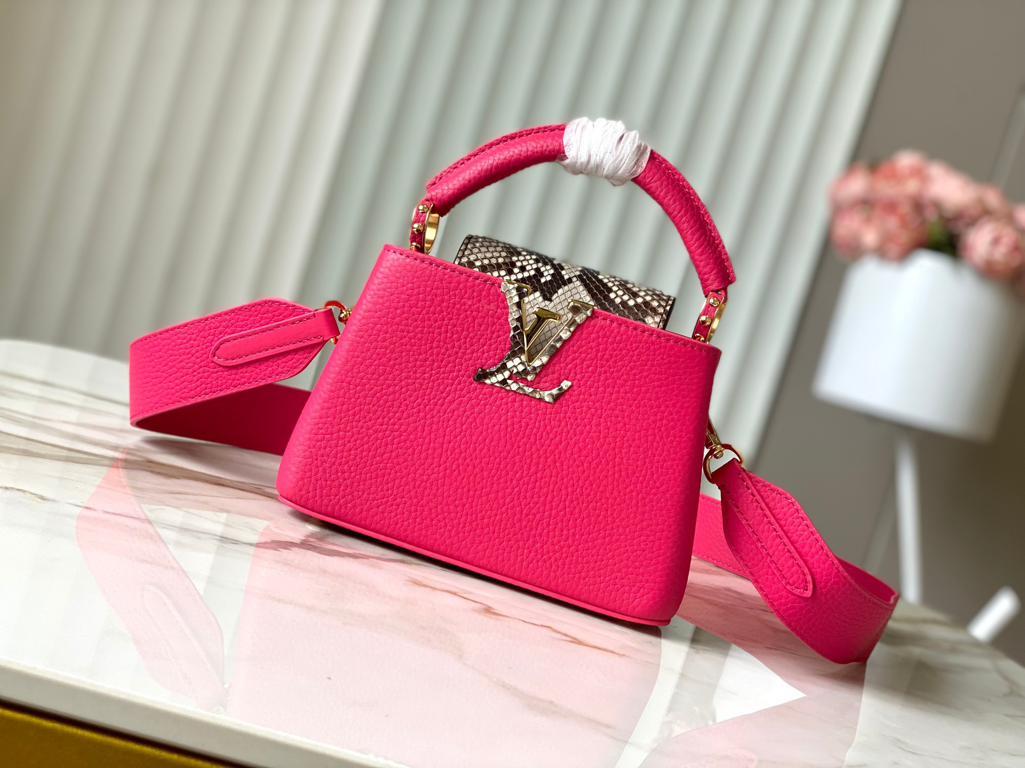 秋冬特惠💰1550 渠道级LV 新品 te级LV 全套包装 N81209/M48865玫红 本款 Capucines 迷你号手袋以全粒面 Taurillon 皮革塑造精巧构型 搭配ding部手柄、两式翻盖及莹泽蟒蛇皮勾勒的 标识 成就昼夜皆宜的华美之选 可拆卸宽肩带令肩背或斜挎展露前卫气息 Size: 21 * 14 * 8 cm