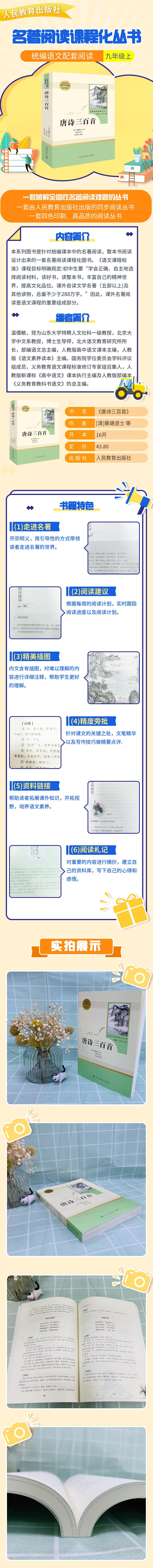 《唐诗三百首》是清代蘅塘退士孙洙想借此代替“工拙莫辨”、体例不严的《千家诗》,从唐诗中择要三百余首,编成的就学儿童“训蒙”读物。因此,所选作品大多明白易懂,艺术性强,配有注释和评点,且朗朗上口,符合了广大读者的品味和要求。本书诗人包括 “三教九流”,上至帝王将相,下至士子布衣乃至僧侶、歌女、无名氏。另外,所选作品从古风到近体,包括五言古诗、乐府、七言古诗、七言乐府、五言律诗、七言律诗、五言绝句、七言绝句等,体裁完备。这些诗既能体现诗人的风格特色及诗人在唐代诗坛中的地位,又能反映出唐诗的基本风貌和发展水平。