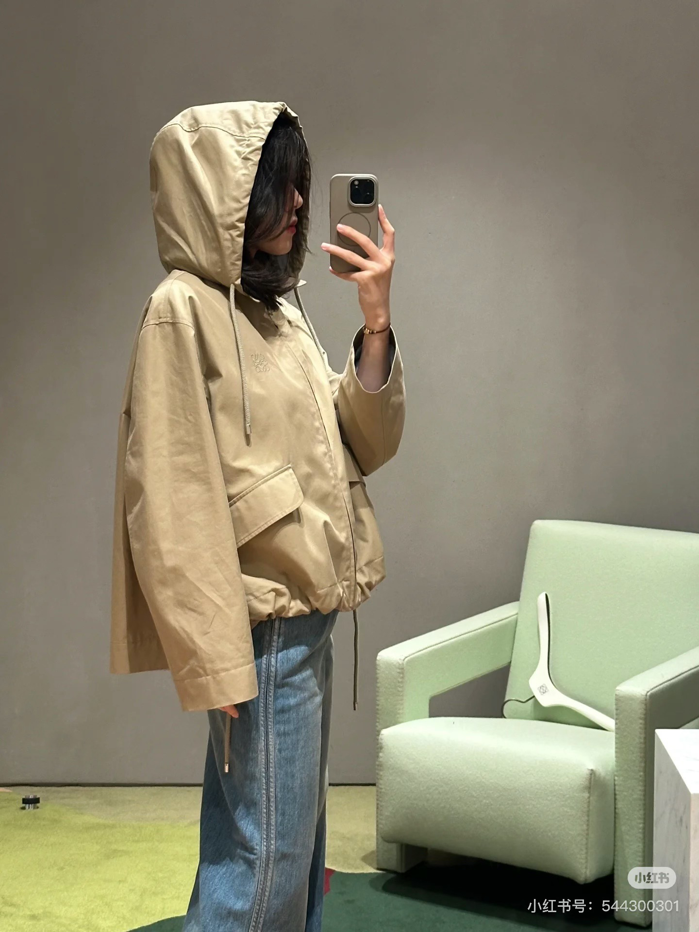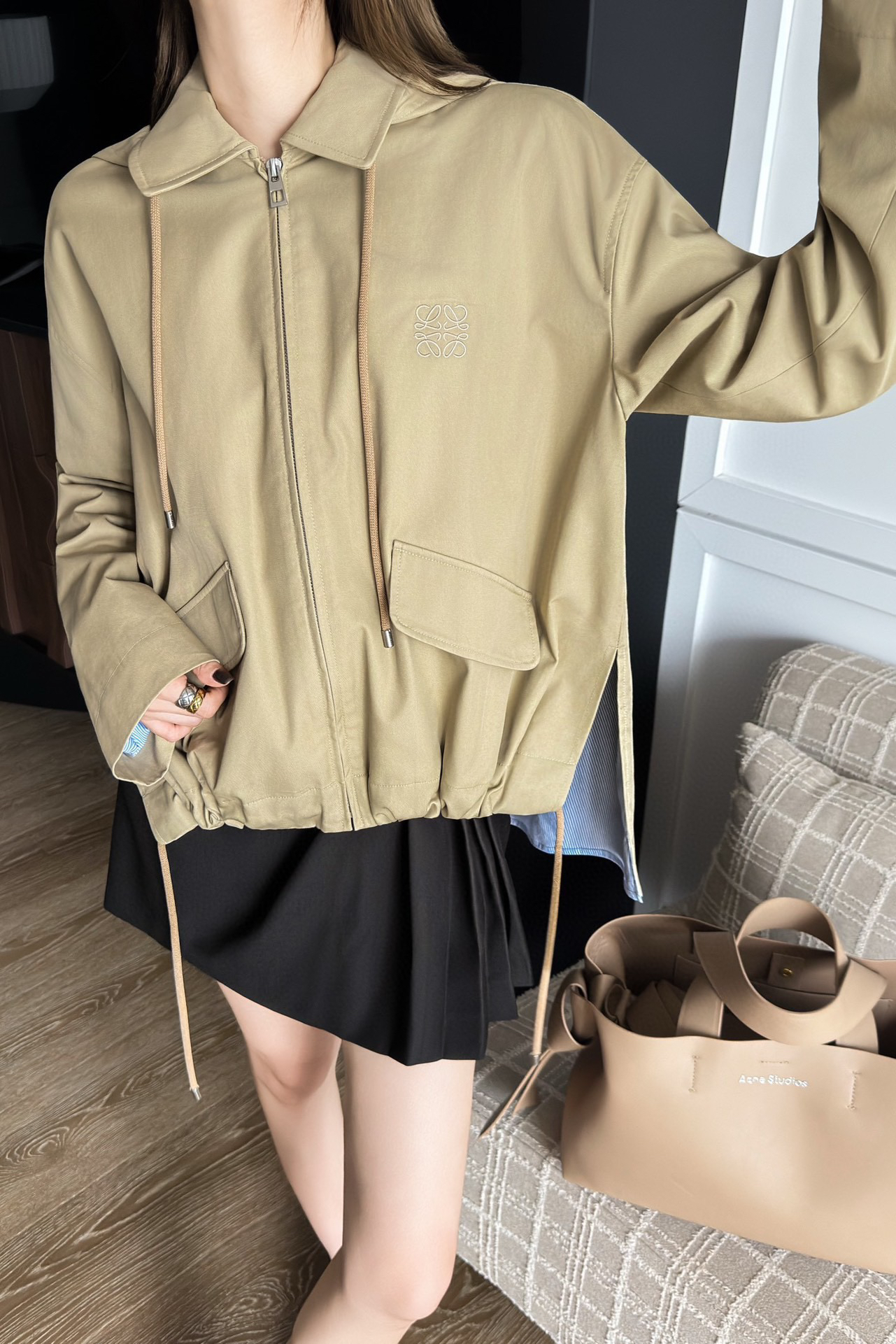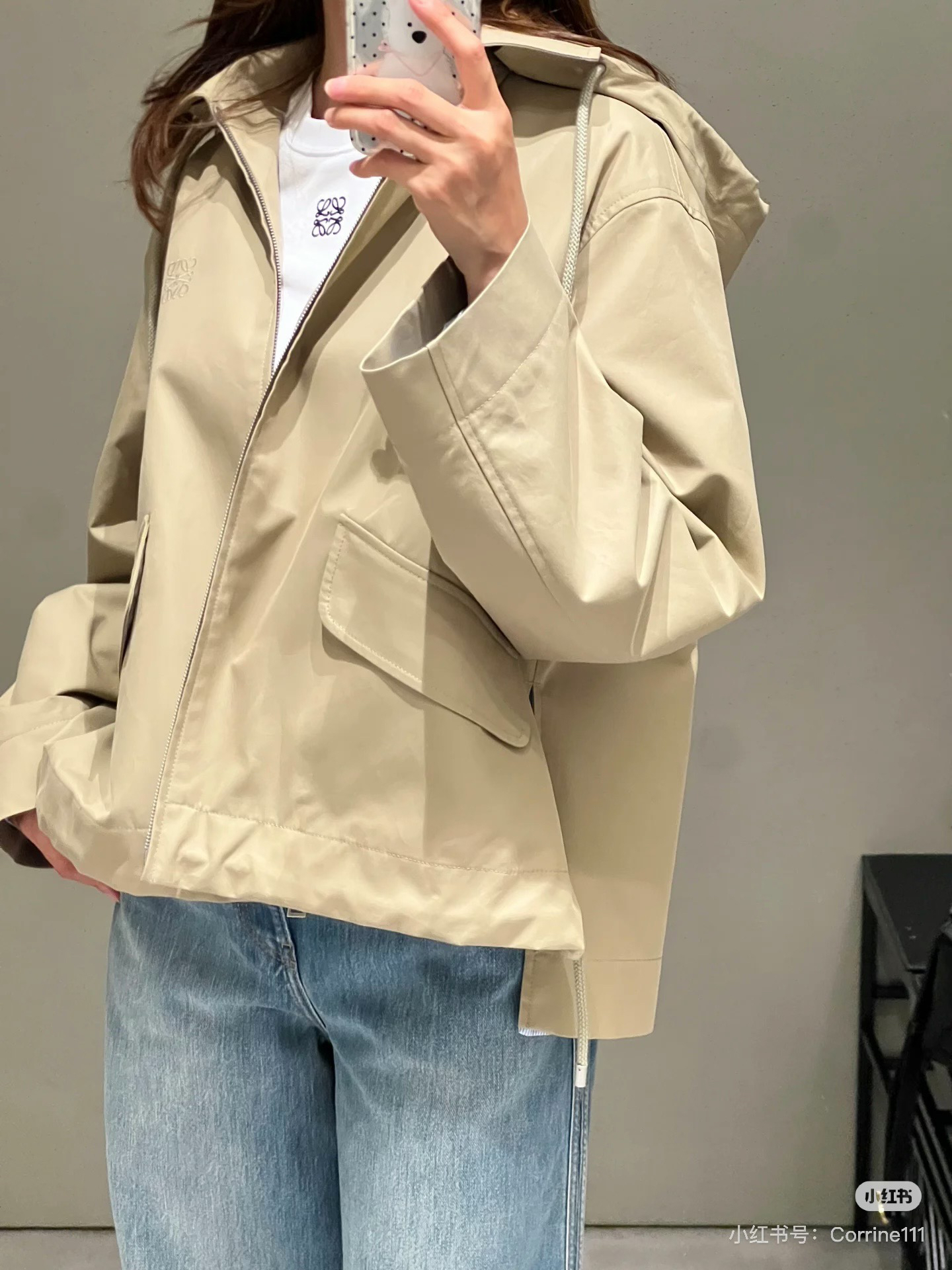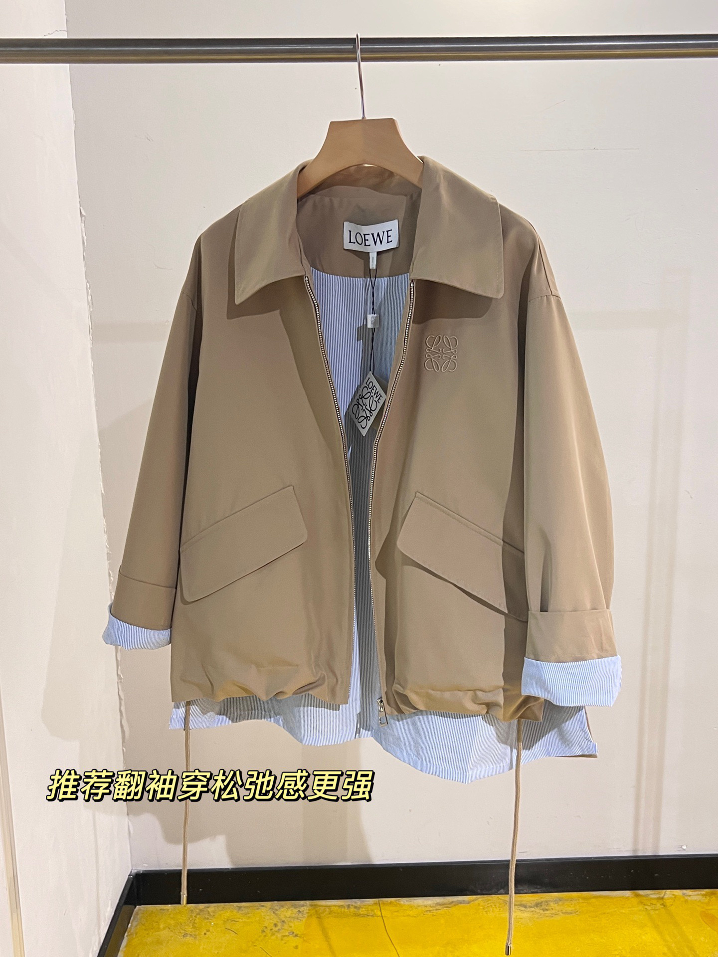 一眼就是心动款LOEWE外套自带工装酷感,卡其色连帽外套自带慵懒滤镜