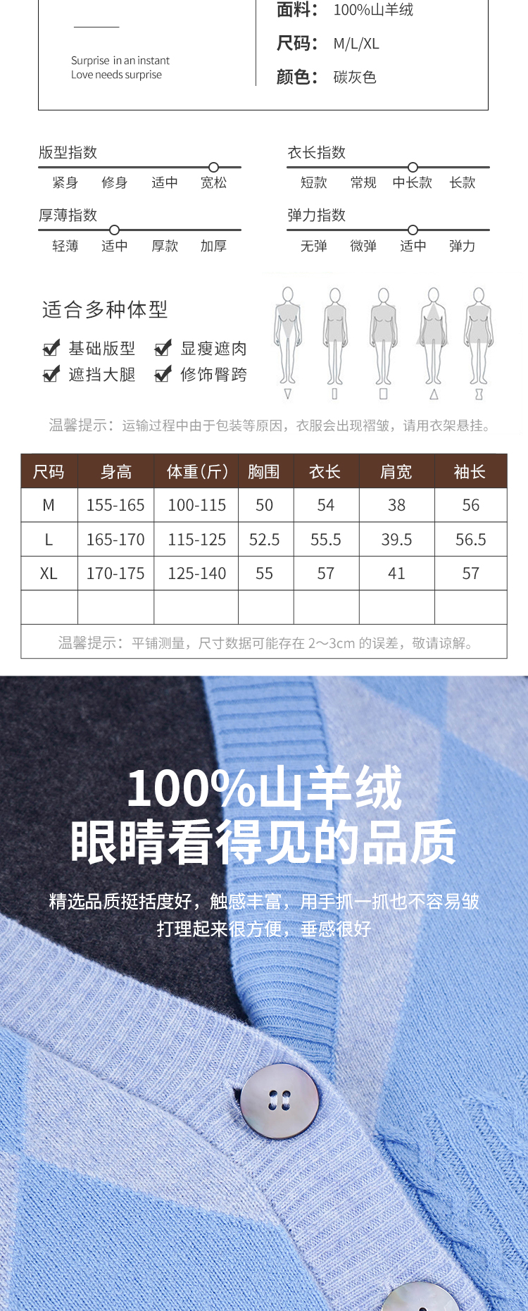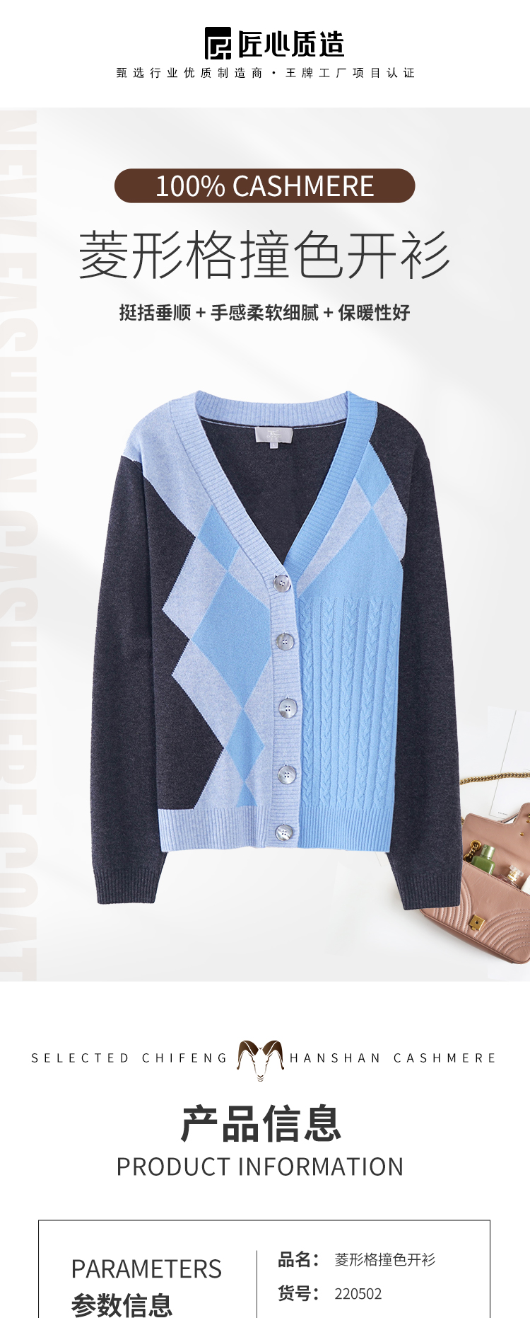 DONGLI&张继成 联名款 女士春秋针织V领羊绒开衫菱形格撞色绞花 220502