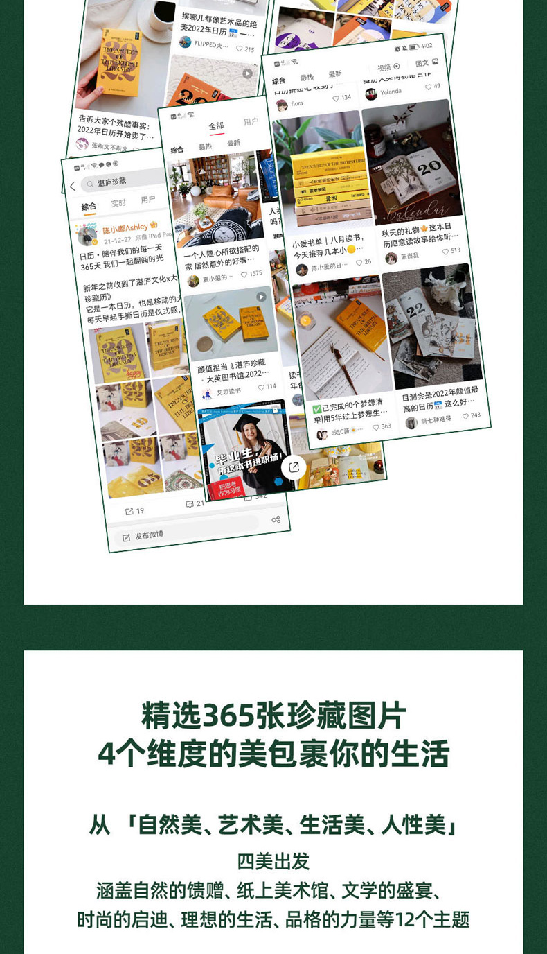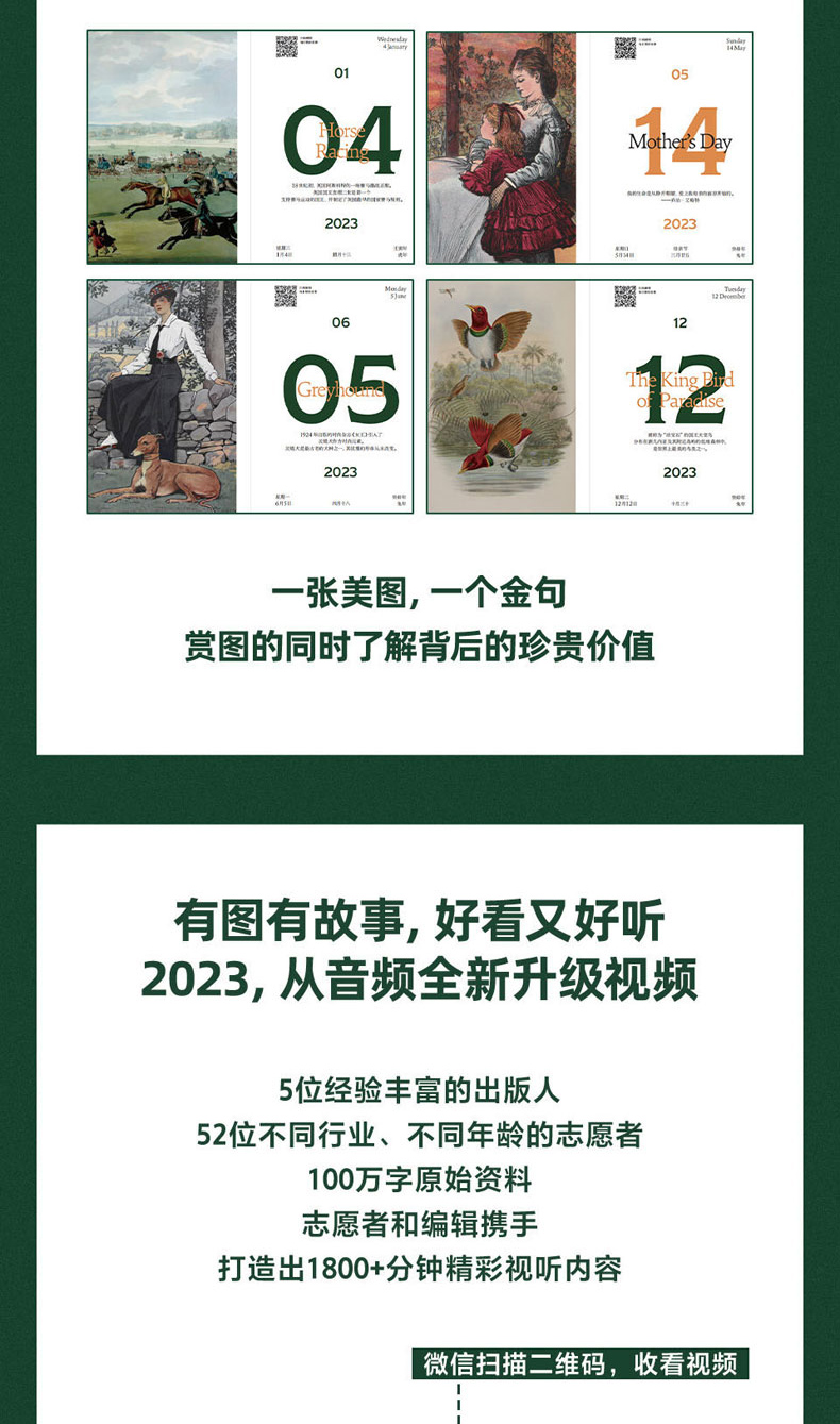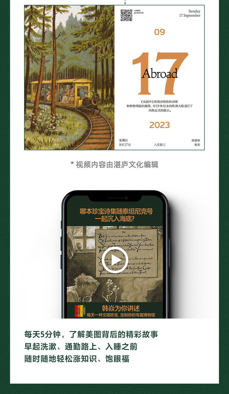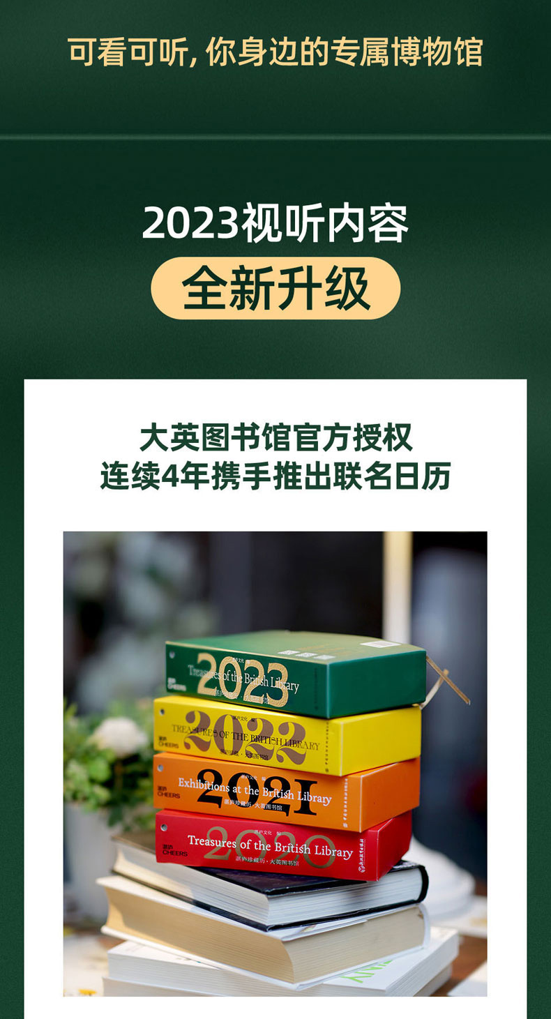 湛庐文化遍寻全世界的高品质内容和思想,并用多元的方式将其传递给中国3000万精英读者。大英图书馆的馆藏珍品超过2亿件,跨越了数千年的人类文明长河。2023年,湛庐文化再次携手大英图书馆,打造专属联名日历《湛庐珍藏·大英图书馆.2023》。·跨越千年的艺术大赏。穿过2亿件藏品,为你寻到了365张旷世美图。《湛庐珍藏·大英图书馆.2023》从「自然美、艺术美、生活美、人性美」四美出发,选取了12个主题(自然的馈赠、万物的奥秘、美好的家园、纸上美术馆、表演的艺术、文学的盛宴、时尚的启迪、美食的秘密、理想的生活、蕞美的感情、品格的力量、蕞好的自己),集科学、文化、艺术于一体,内容丰富,时间空间跨越大,每一天选取一张颜值高且内涵丰富的珍贵馆藏。·好看又好听的日历,2023视听内容全新升级。5位经验丰富的出版人、52位不同行业、不同年龄的志愿者,100万字原始资料,1800+分钟视听内容,覆盖旅行、文......