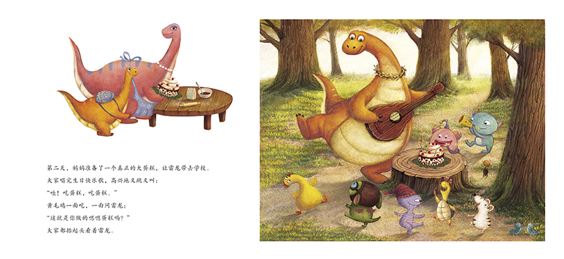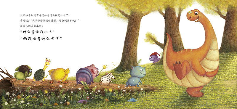 雷龙第一天上学,妈妈提醒他:“说话要文雅哦。”所以,雷龙很“文雅”地告诉小朋友,自己会做“嗯嗯蛋糕”。小朋友们都羡慕死了……经过小小的误会和真诚的沟通,最后,大家终于知道雷龙说的嗯嗯蛋糕是什么了!所有的动物一字排开,各做了一个嗯嗯蛋糕……