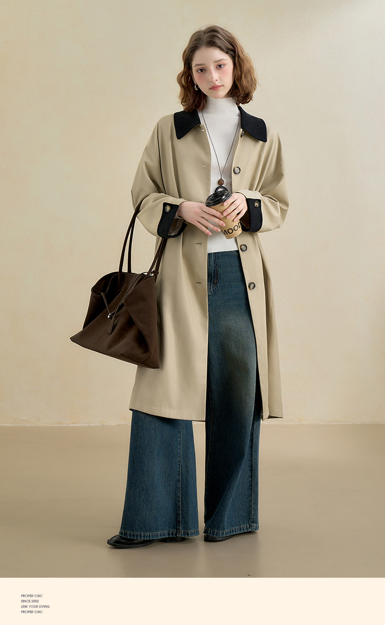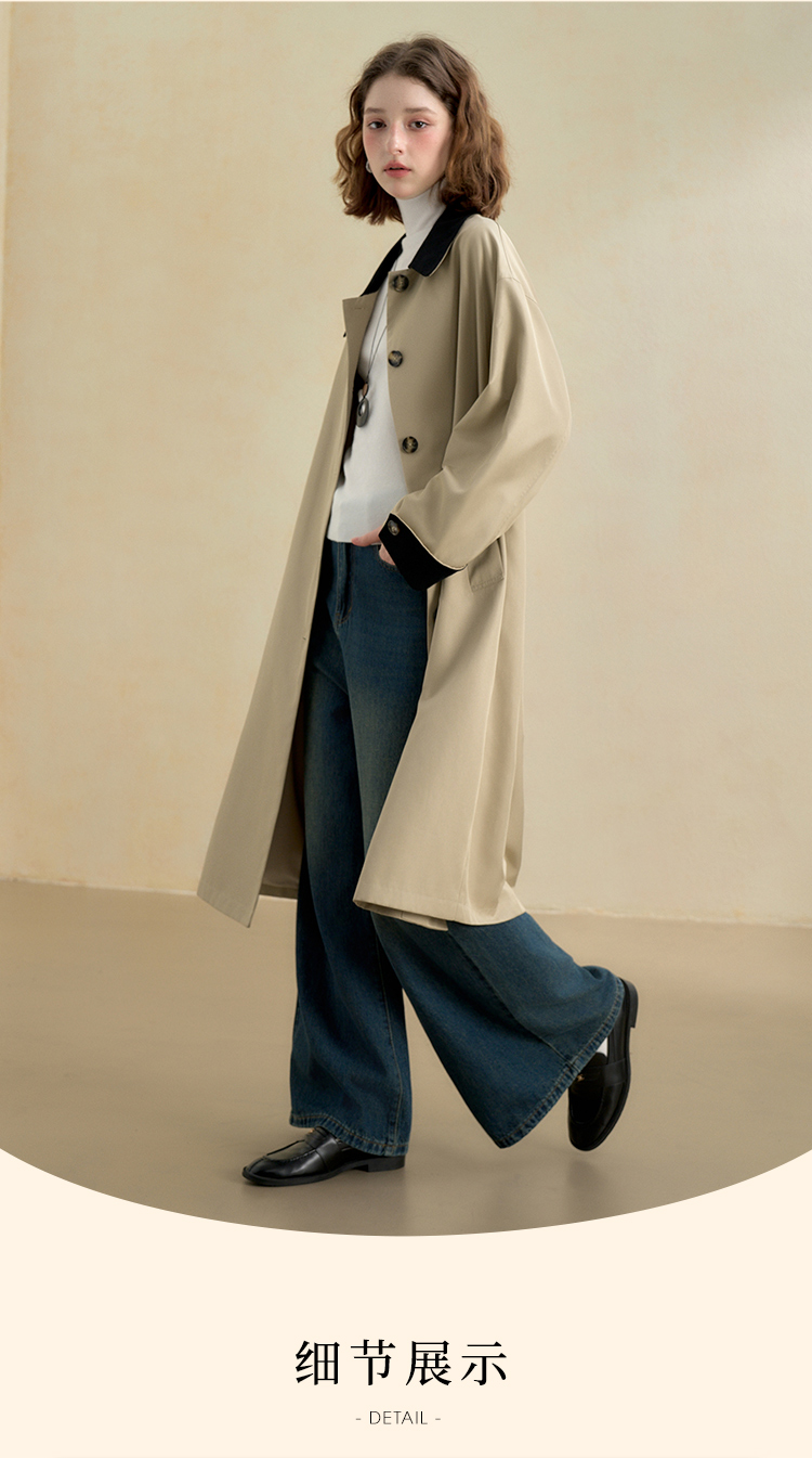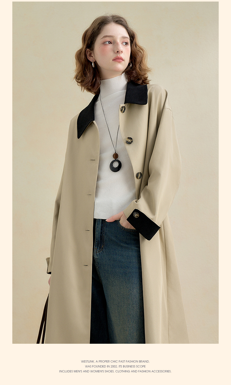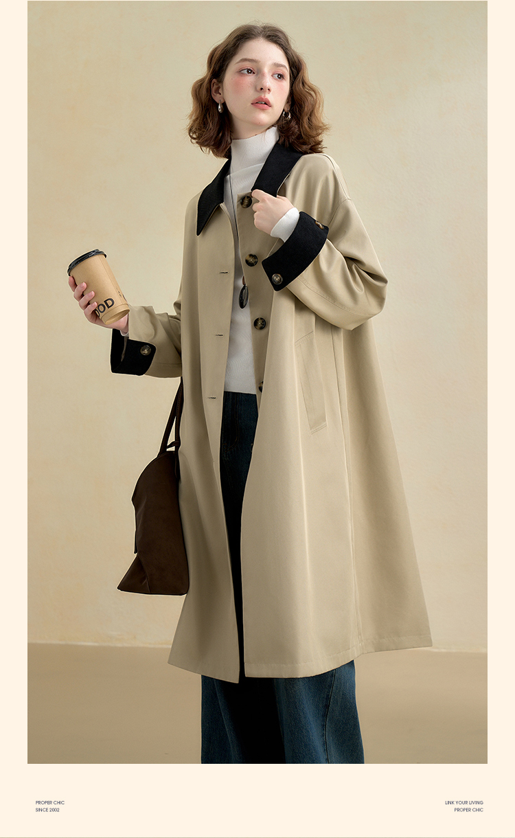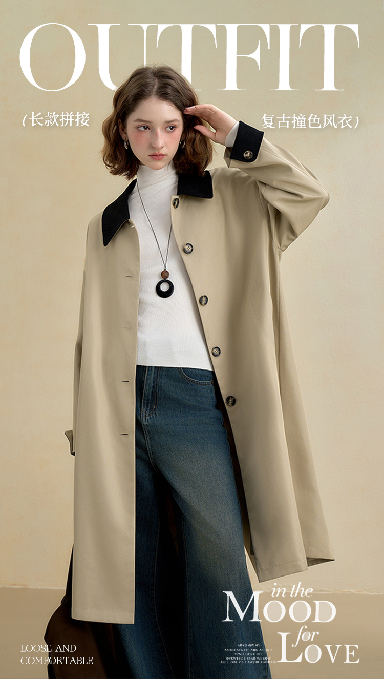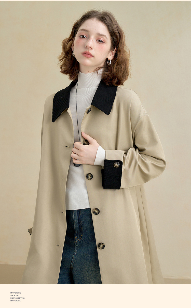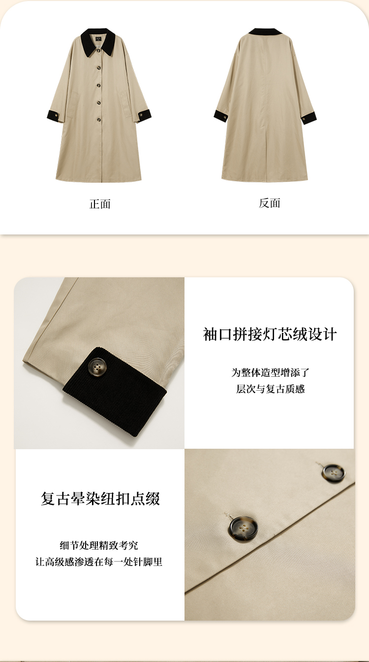 西遇复古灯芯绒拼接撞色风衣外套女秋季廓形宽松显瘦长款大衣V2951179