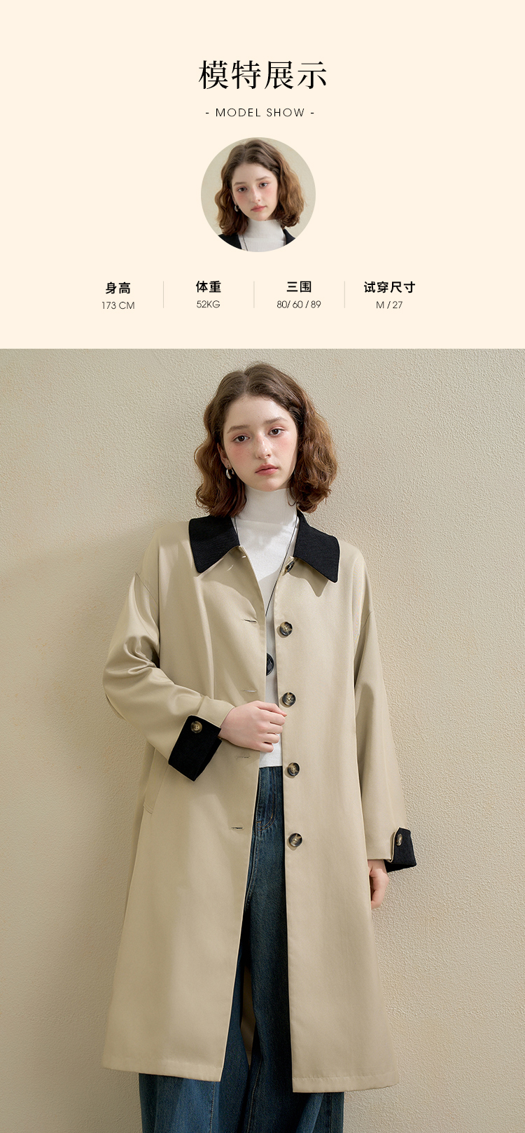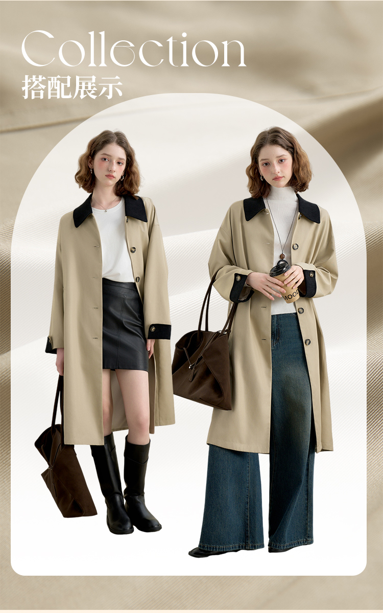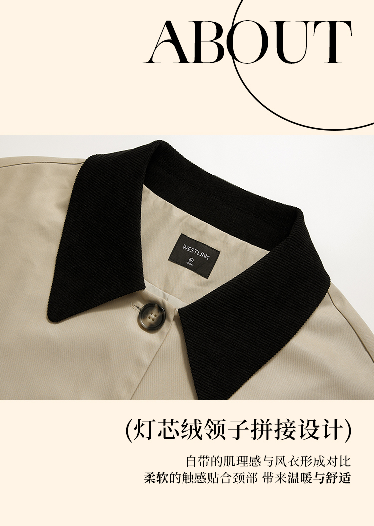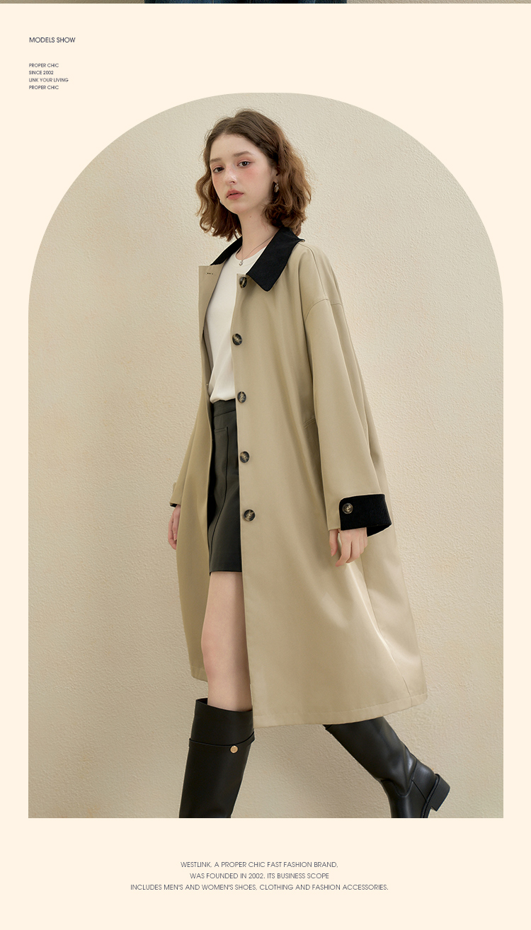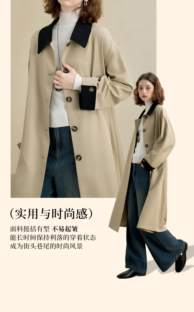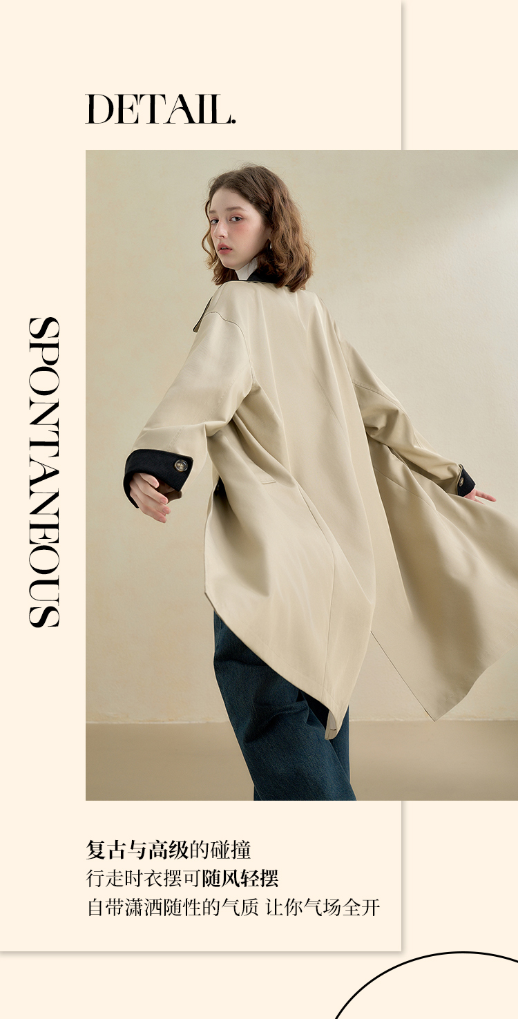 西遇复古灯芯绒拼接撞色风衣外套女秋季廓形宽松显瘦长款大衣V2951179