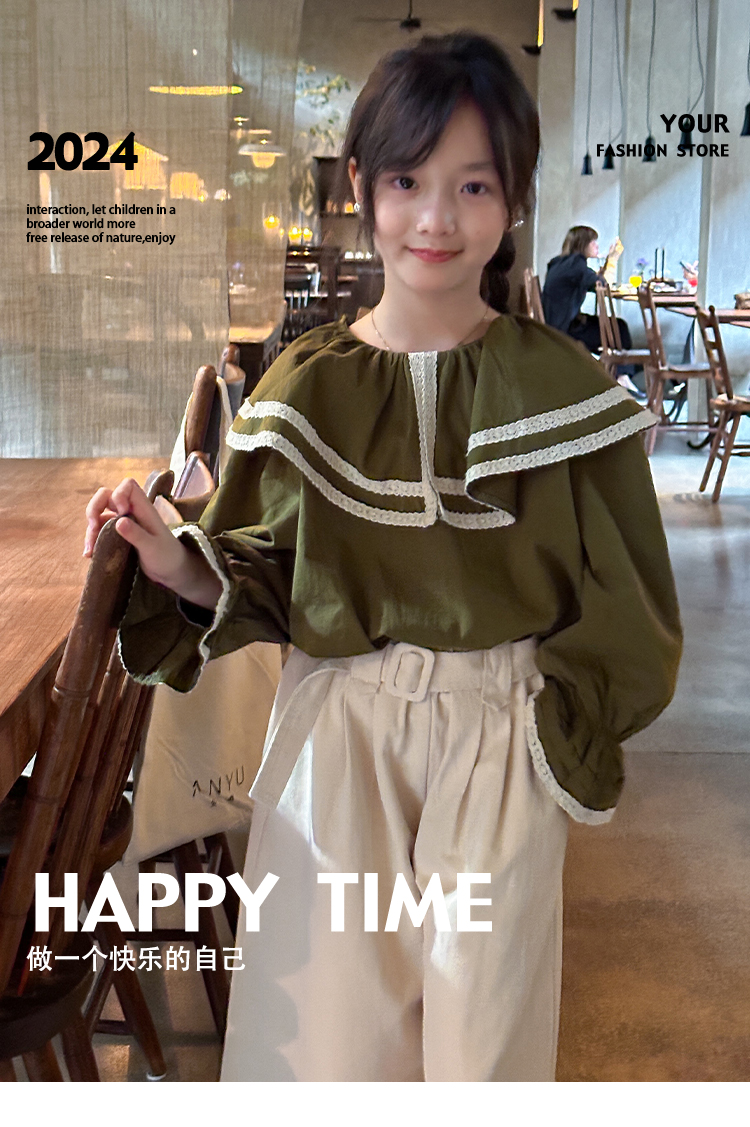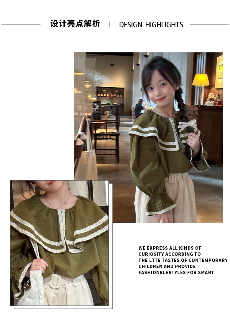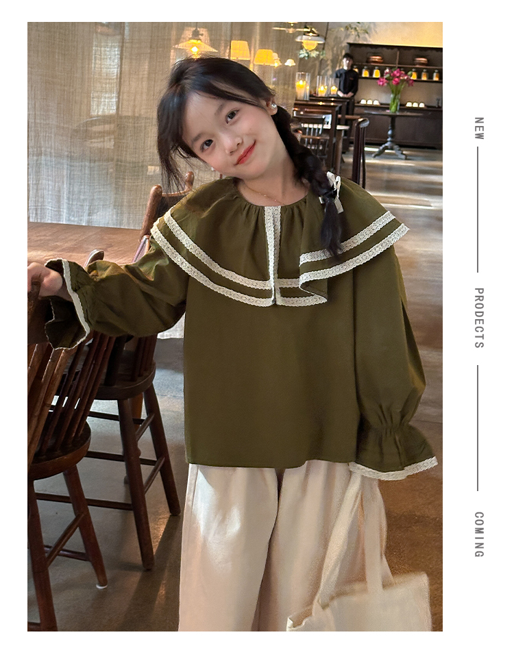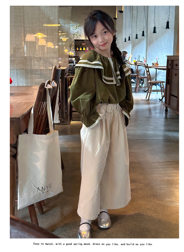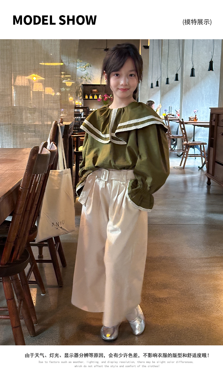 【麦乐拉 娃娃领芥末绿套装7095】儿童时尚套装 舒适韩系穿搭 上身不臃肿 蕾丝领设计 温柔风穿搭