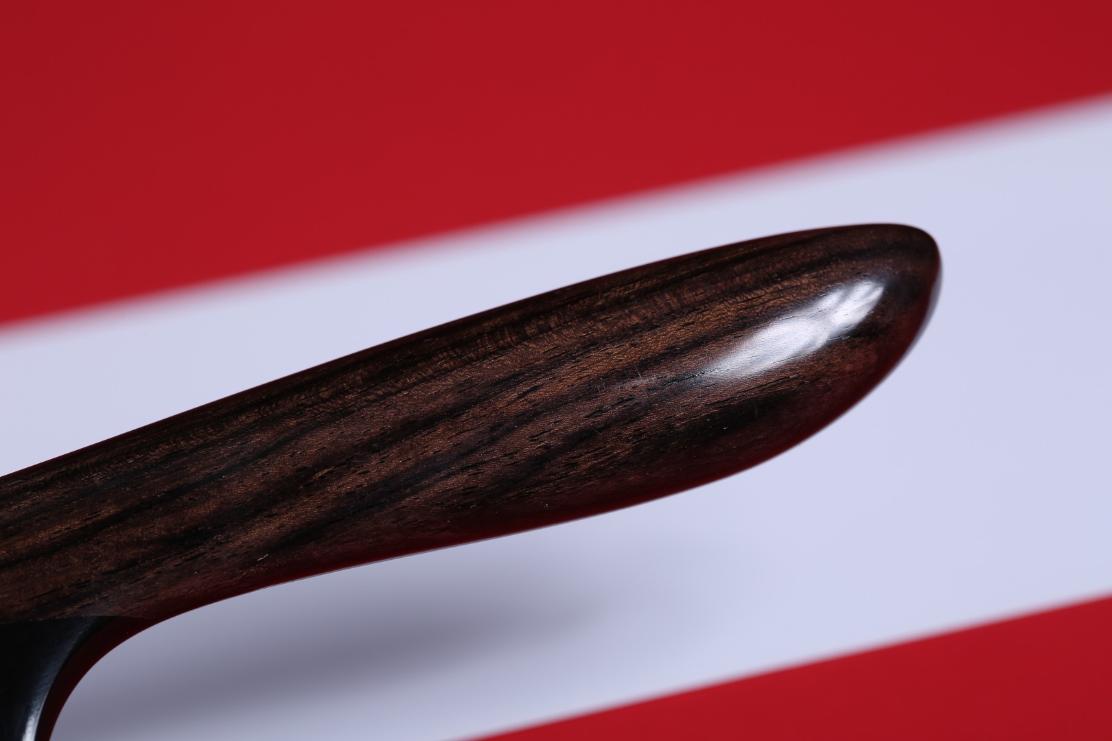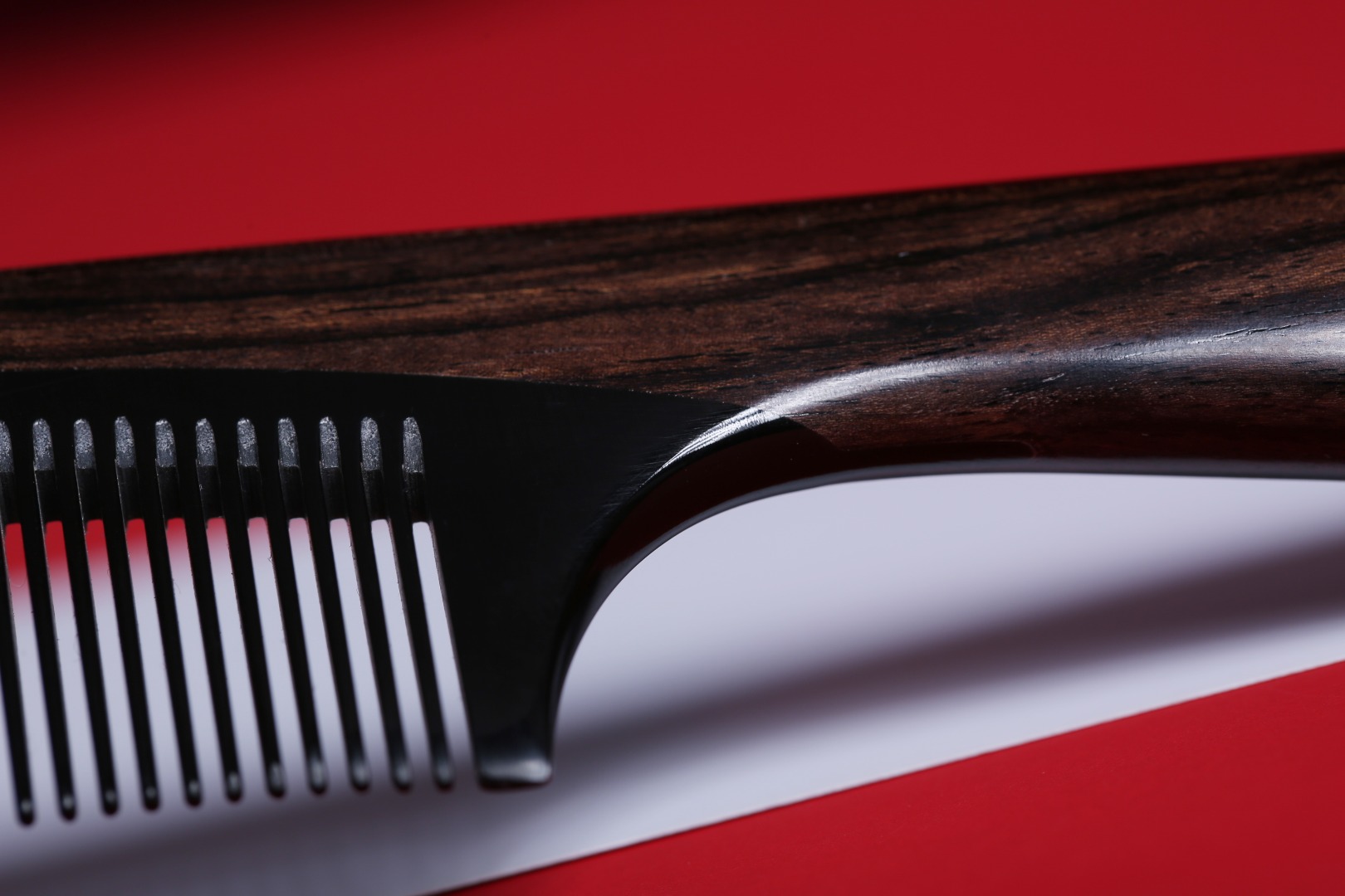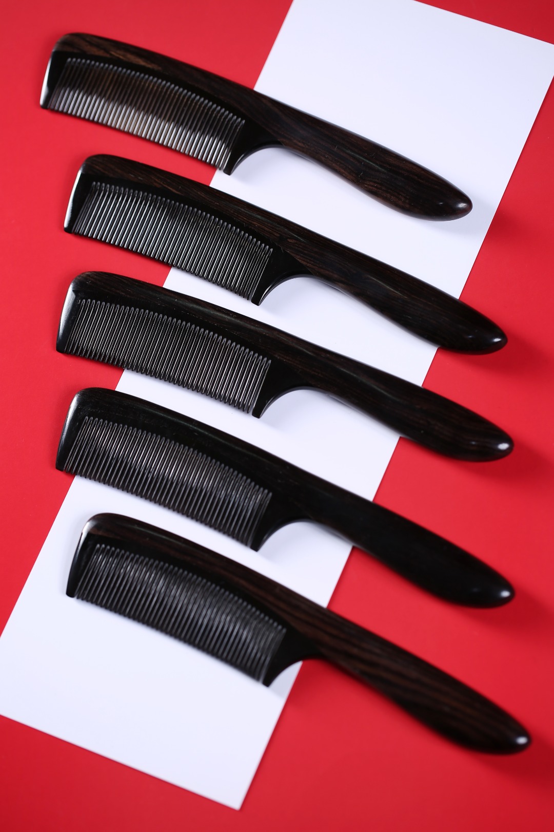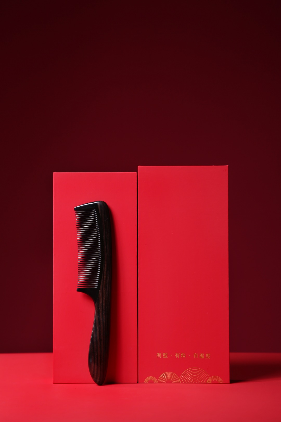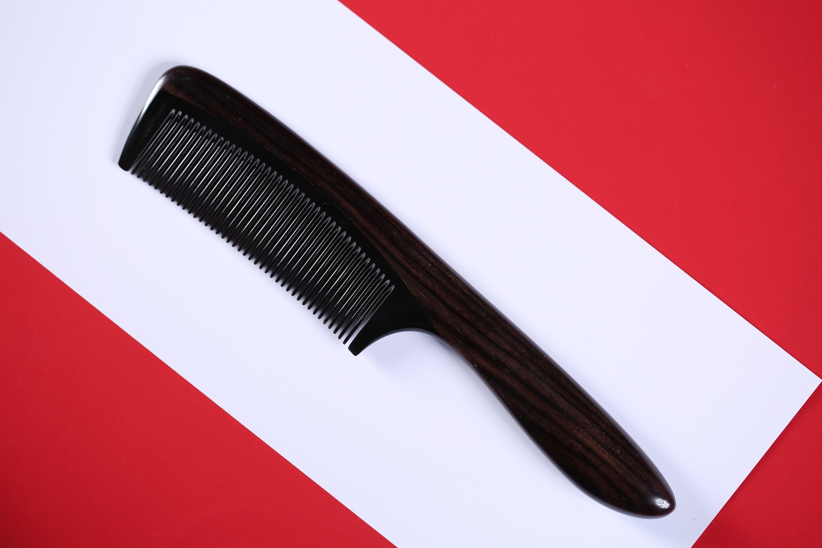 此梳梳柄处以紫光檀制,质感细腻,纹理出众,梳齿采用牛角为材,齿缝均匀,柄与齿之间为榫卯相接,结构紧凑,无缝平整。梳子整体厚实,手感好,每天梳头数次,有按摩头皮,促进血液循环等养生作用。