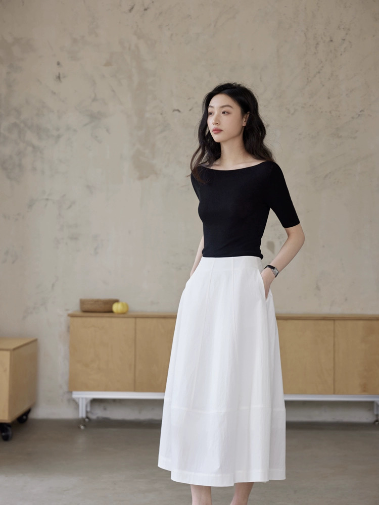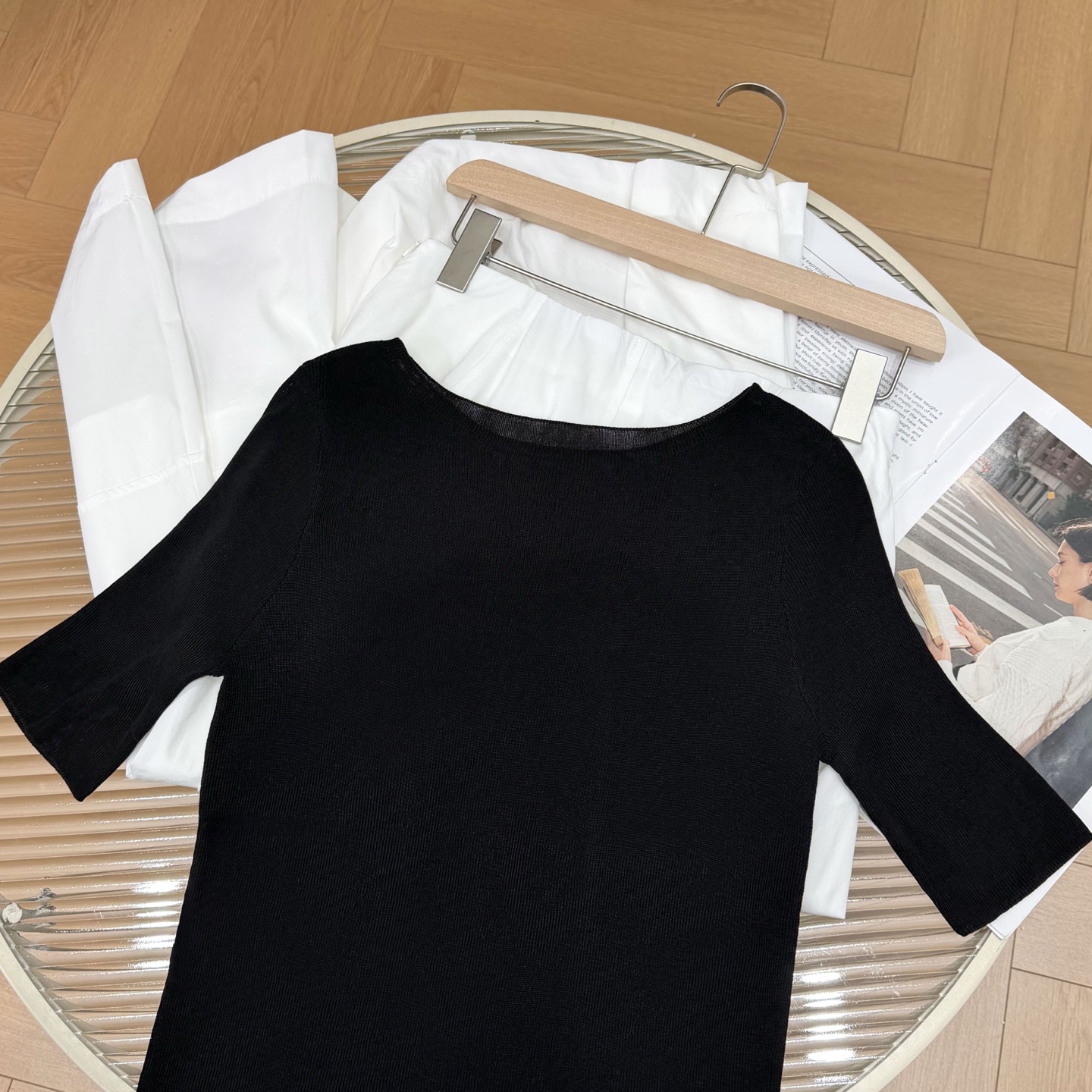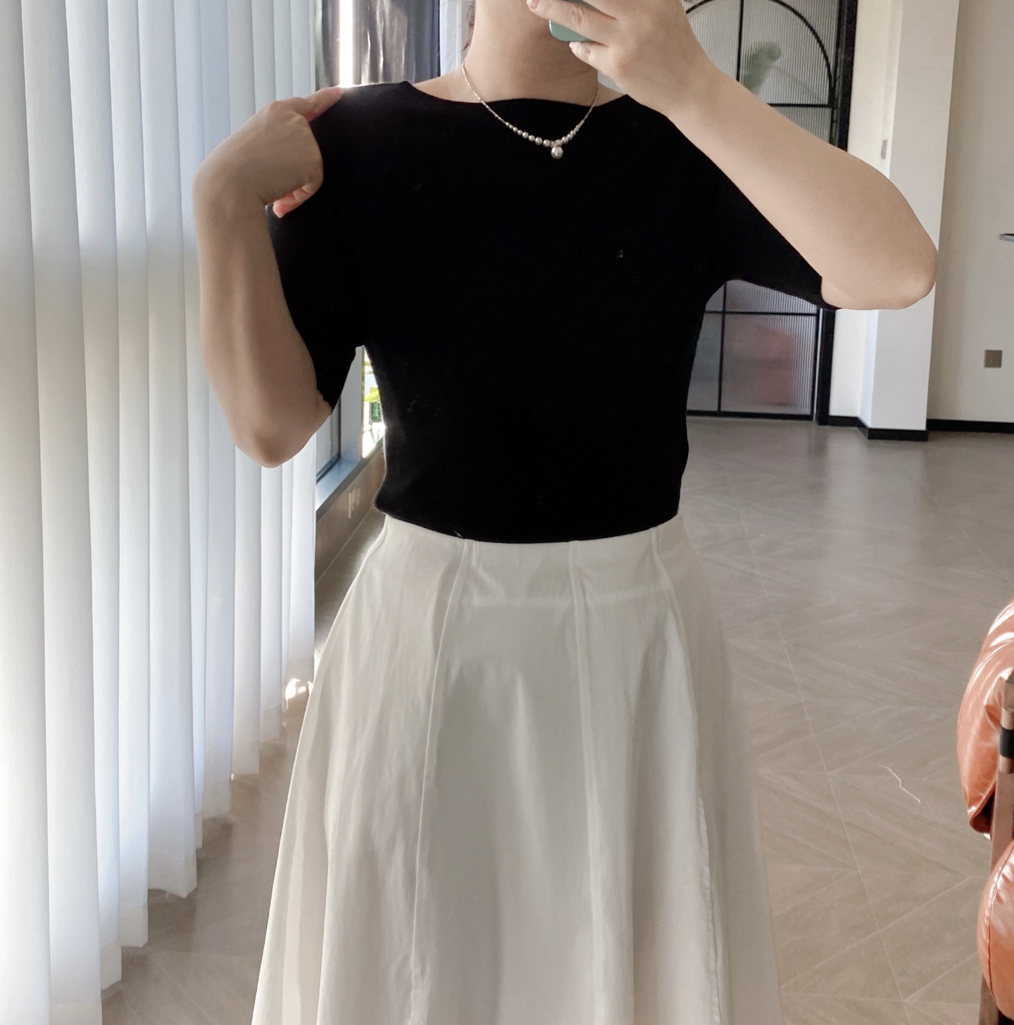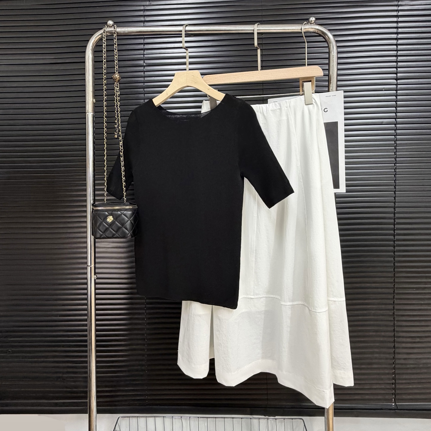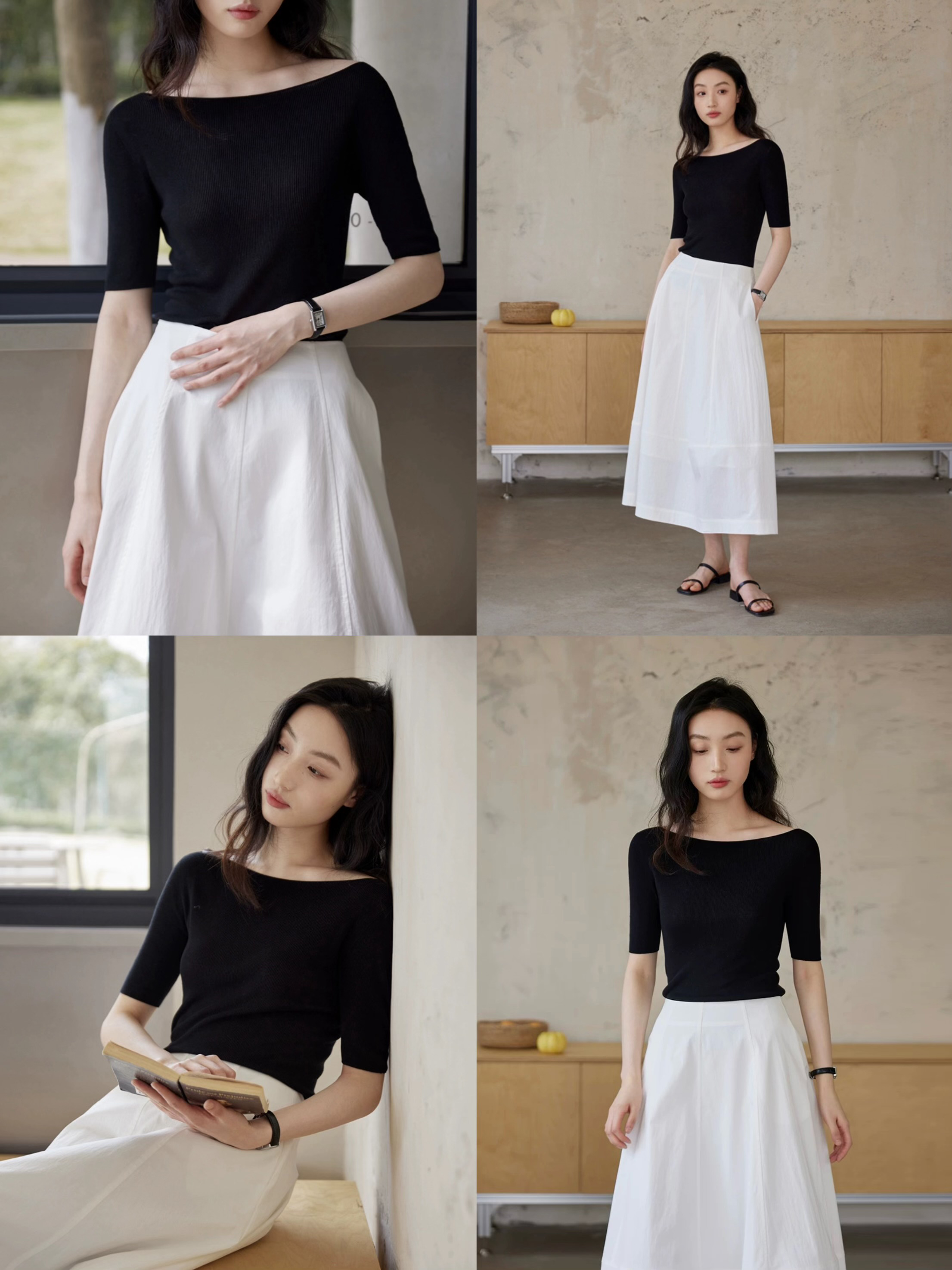💰上衣,M9360 上衣 价格79元包邮 💰3390 半身裙 价格109 巨显瘦!单一字领显瘦中袖针织衫+款八片立裁花苞裙液氨棉半身裙 经典的黑白配系列 显瘦,端庄又大气