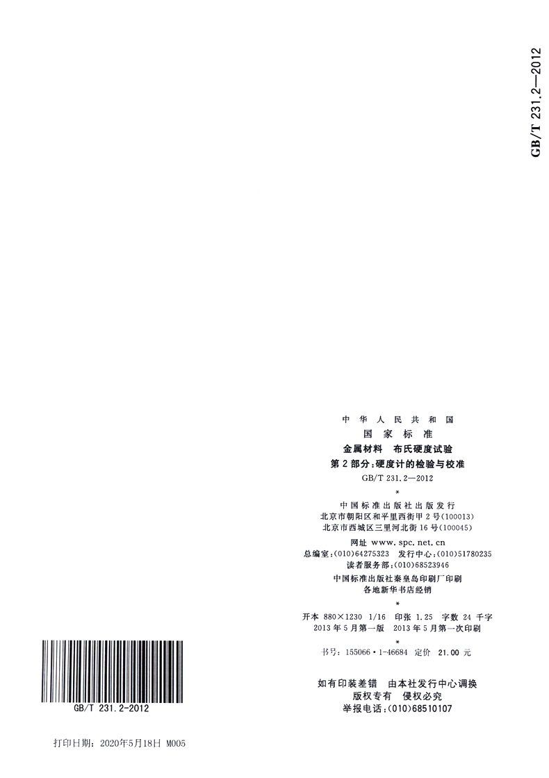 书名:GB/T 231.2-2012金属材料 布氏硬度试验 第2部分:硬度计的检验与