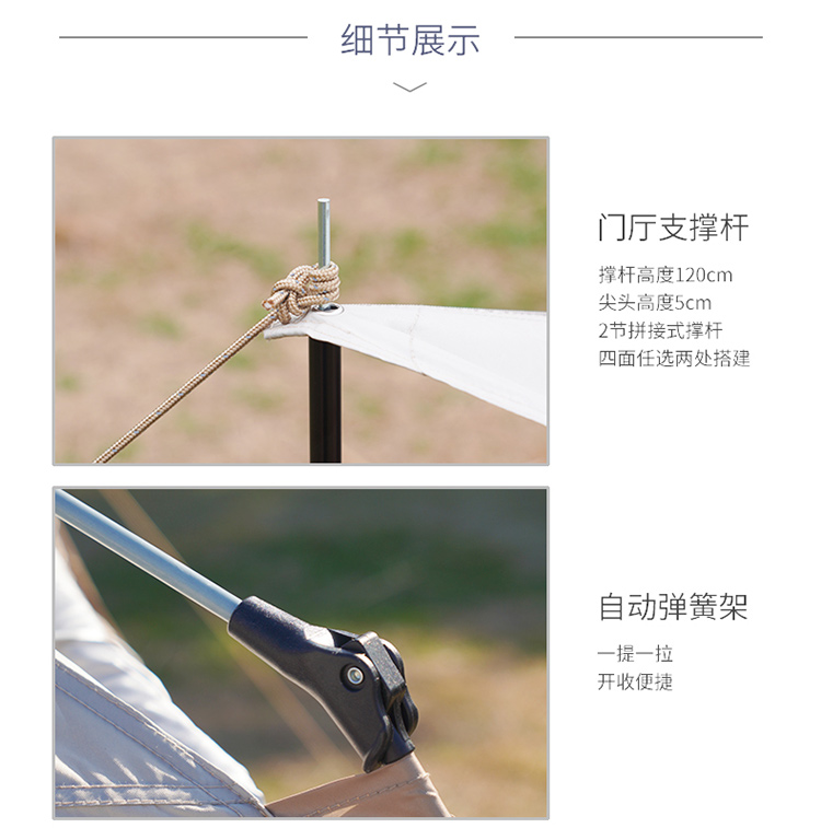4.一室两厅,配4节钢管撑杆,可自由搭配两门或两窗。