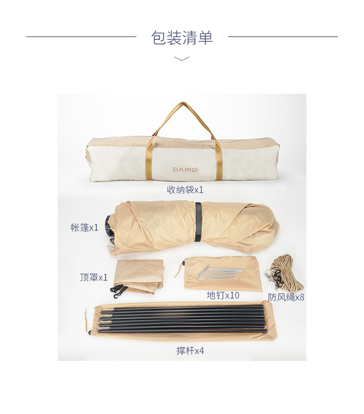 2.帐面防水PU500,顶帐+底帐防水PU2000,内涂银胶防晒UPF50+。