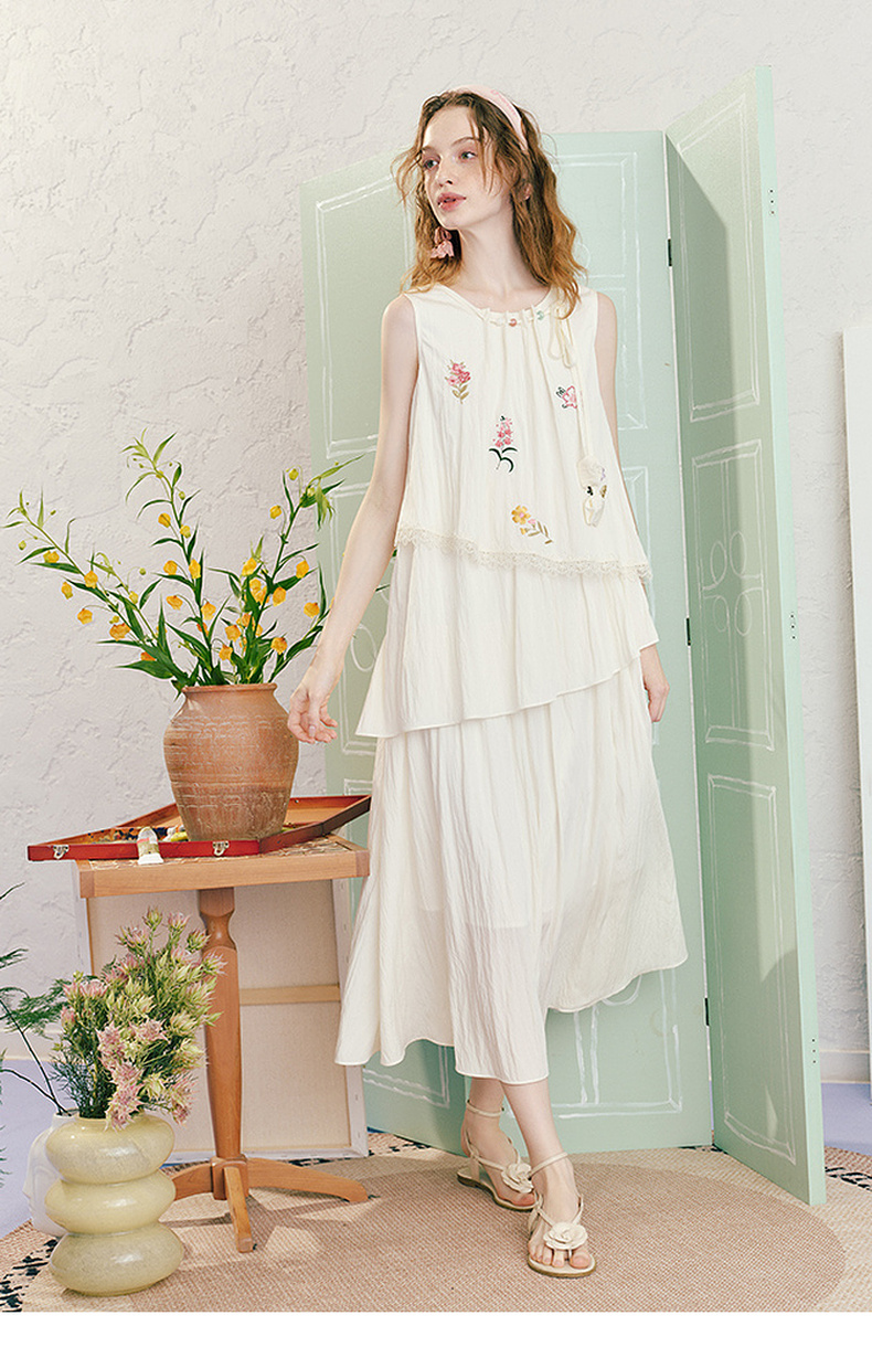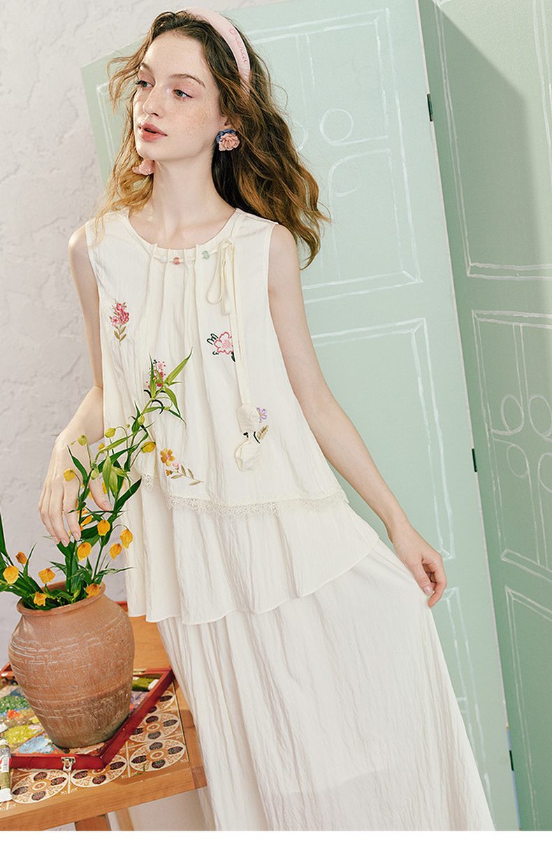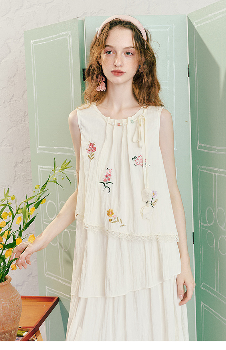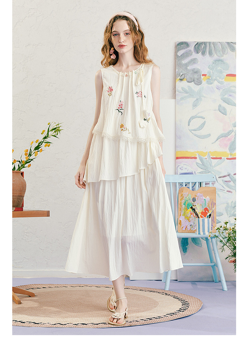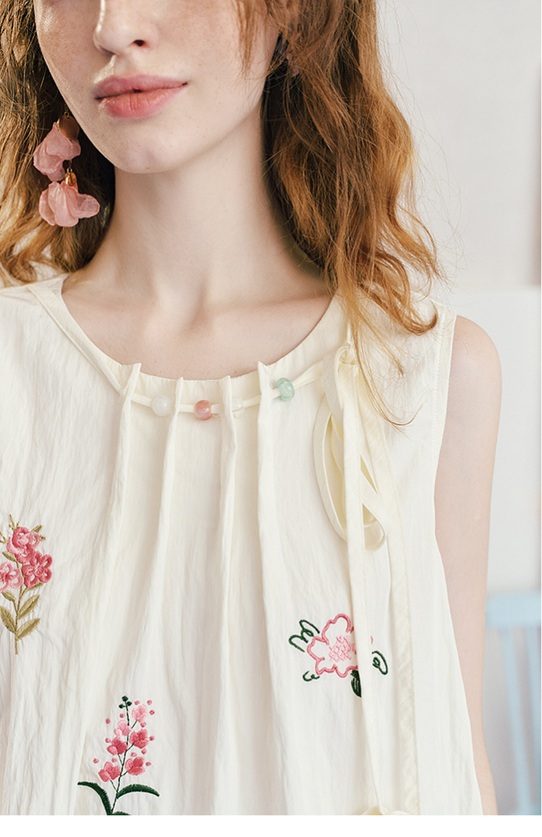 两三事垂云粉町2025夏季新款小清新串珠圆领绣花无袖背心裙连衣裙