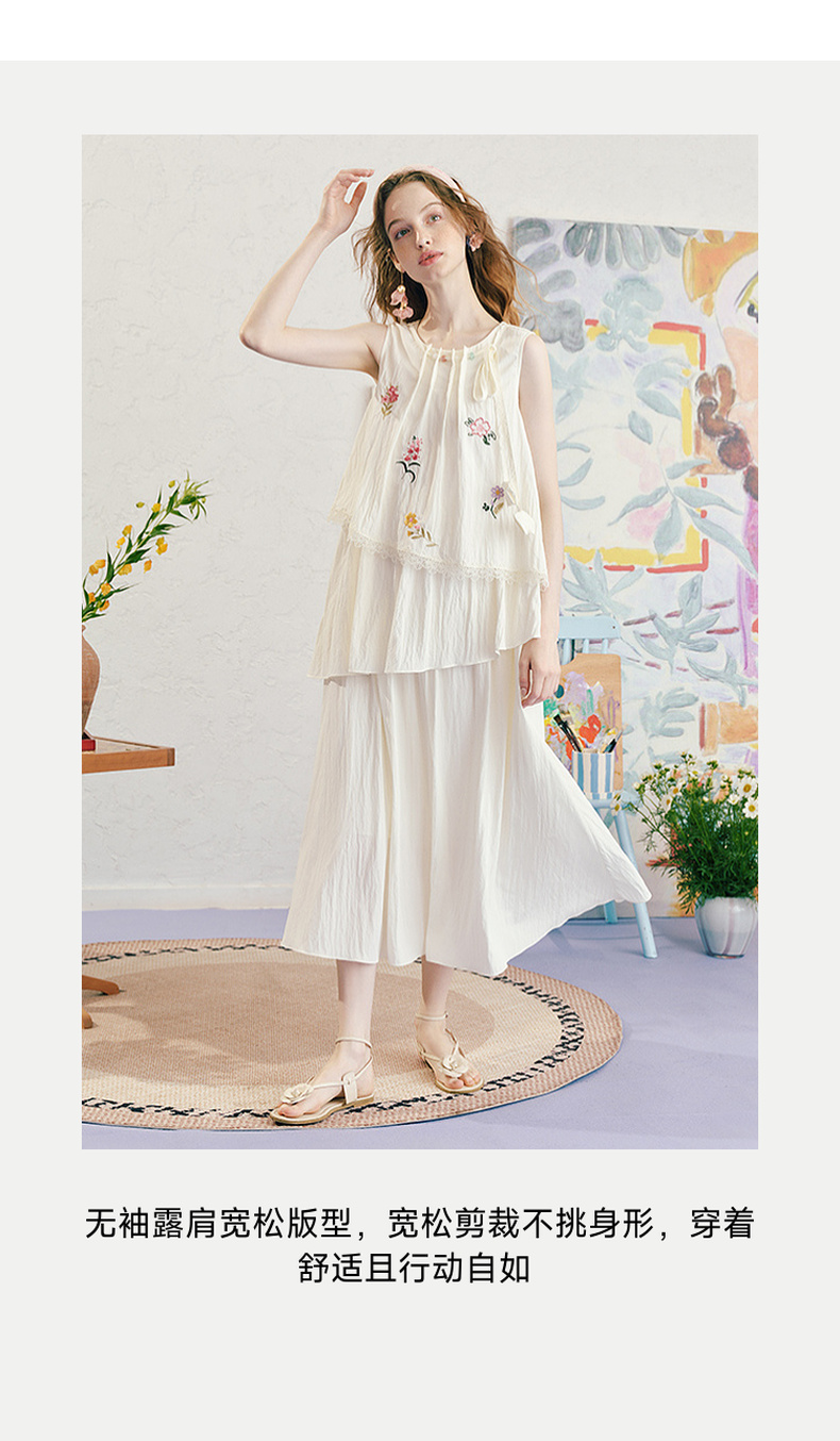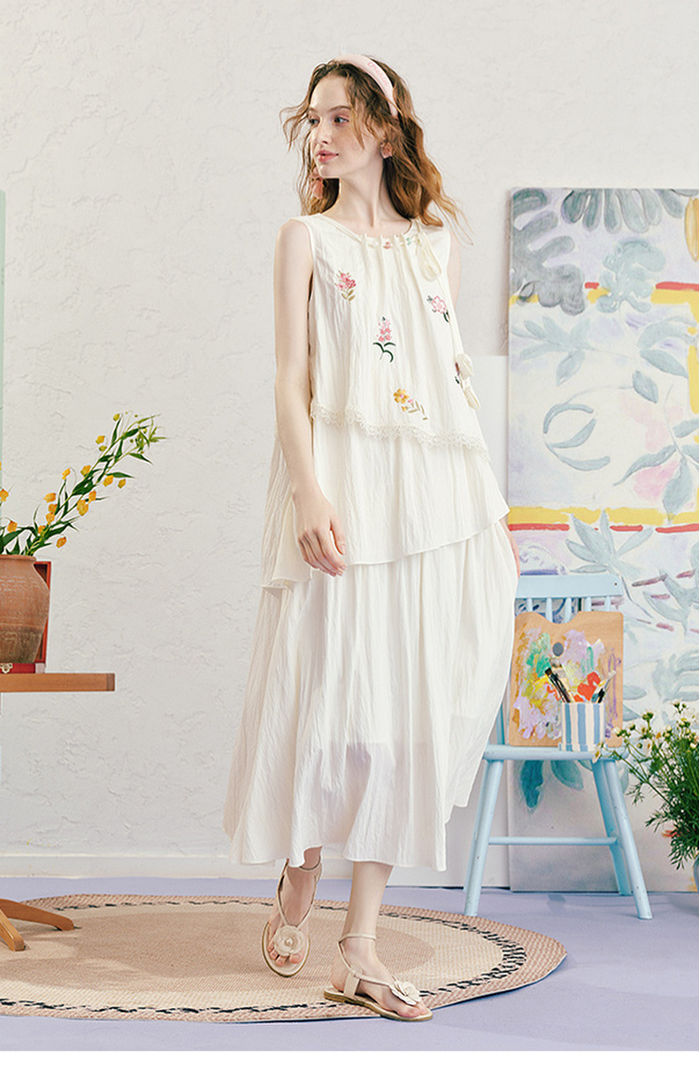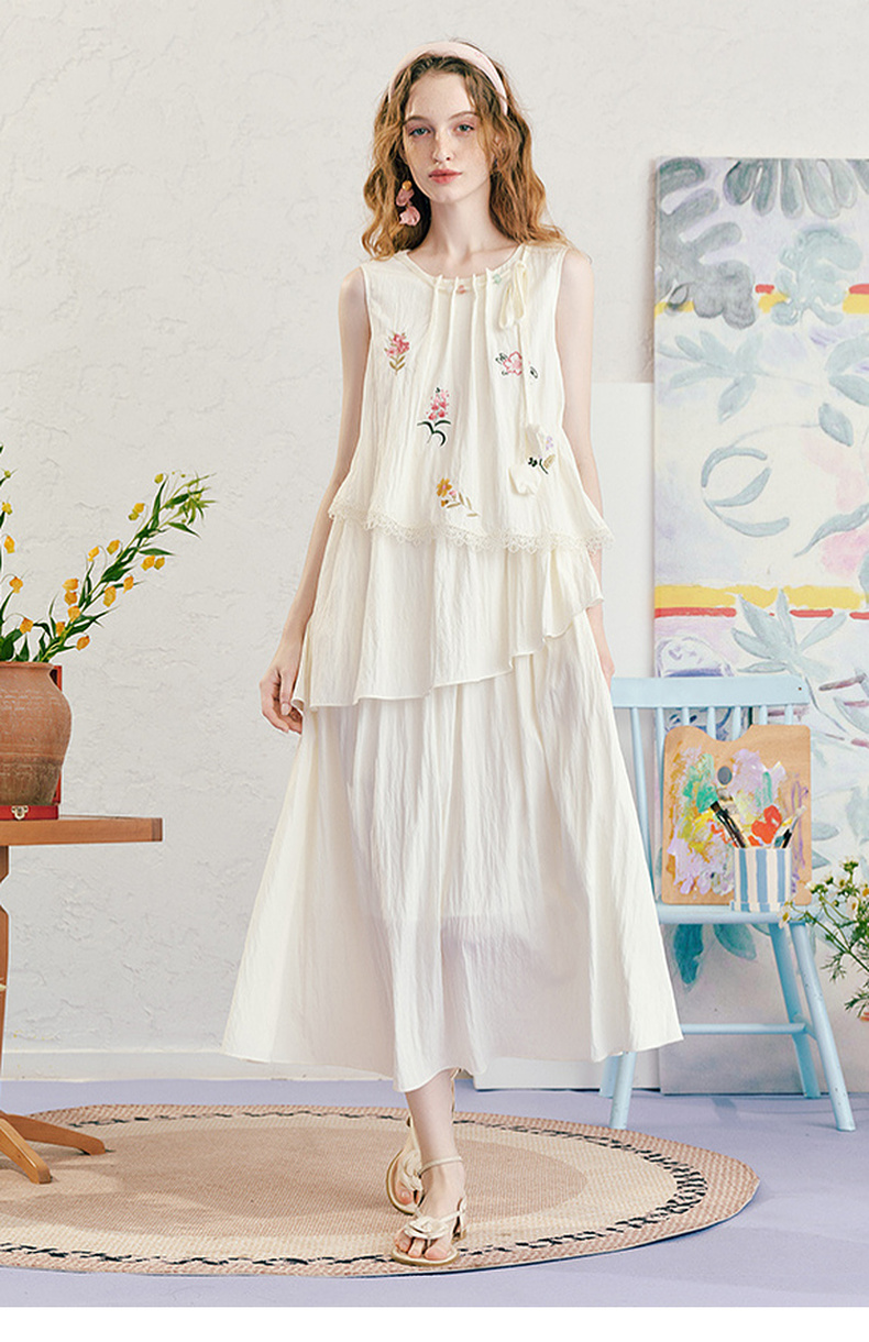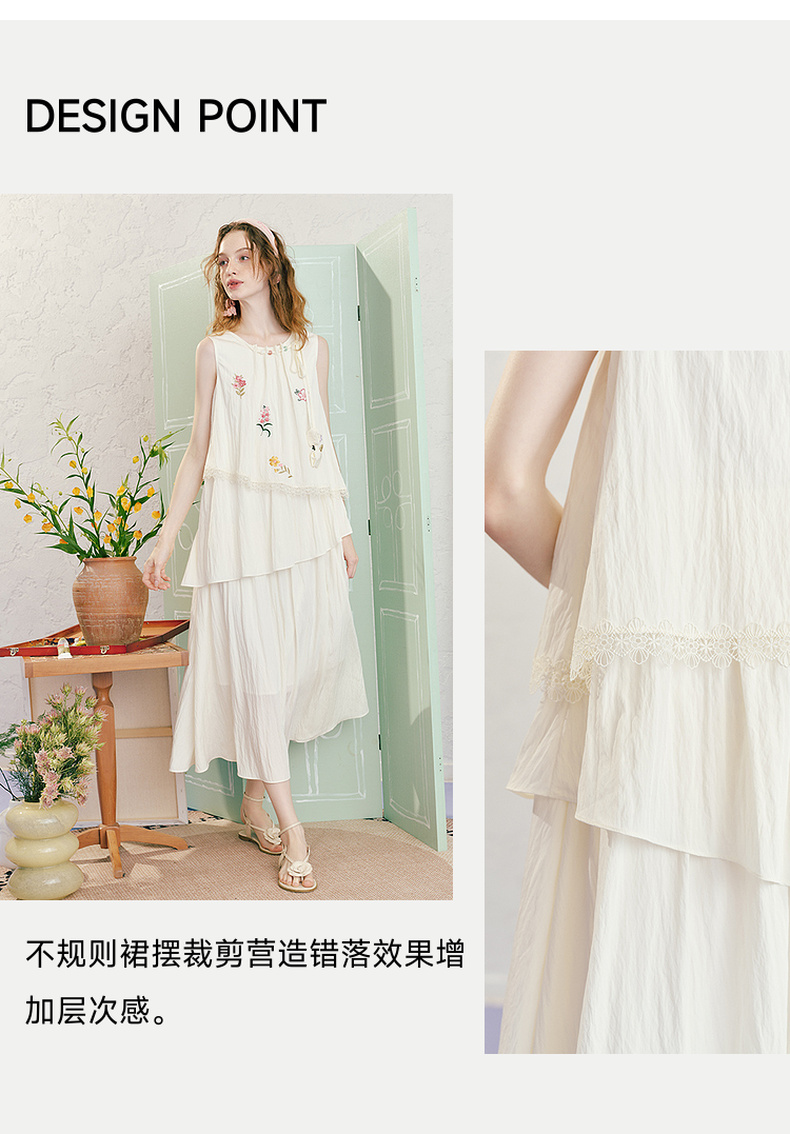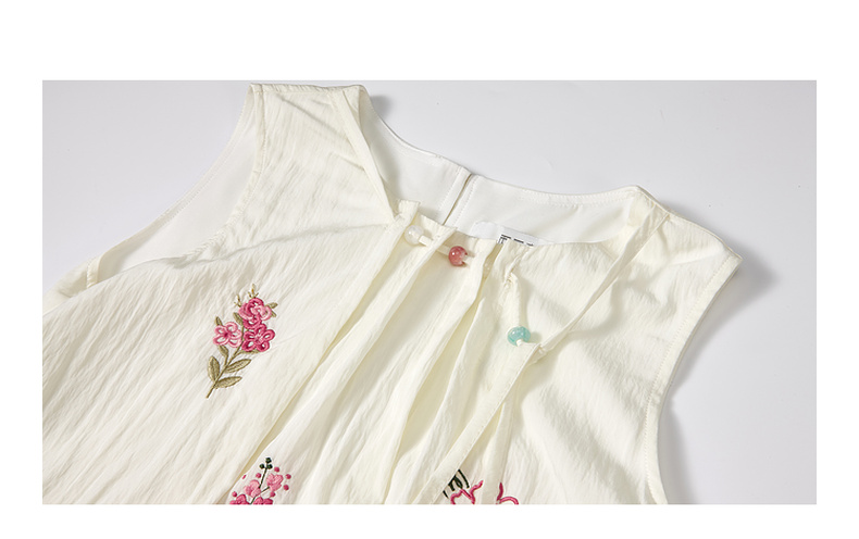 两三事垂云粉町2025夏季新款小清新串珠圆领绣花无袖背心裙连衣裙