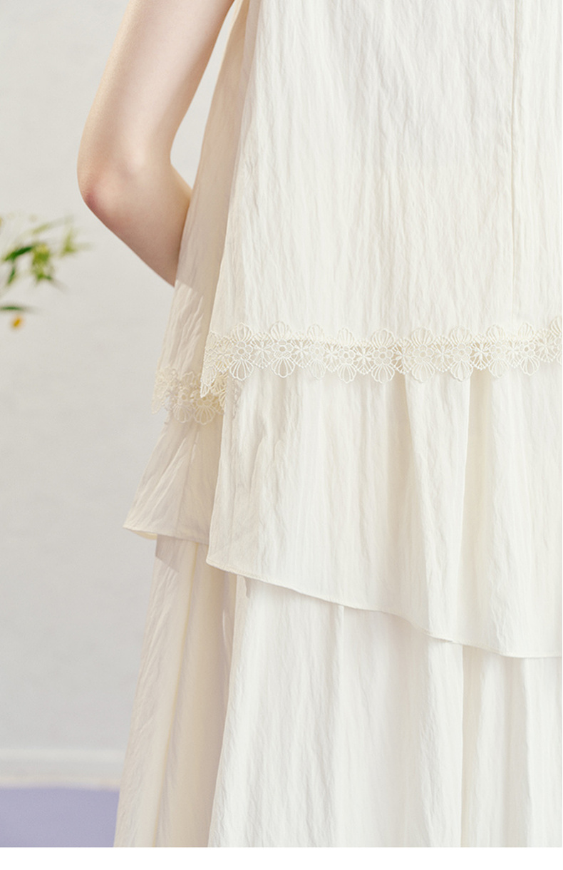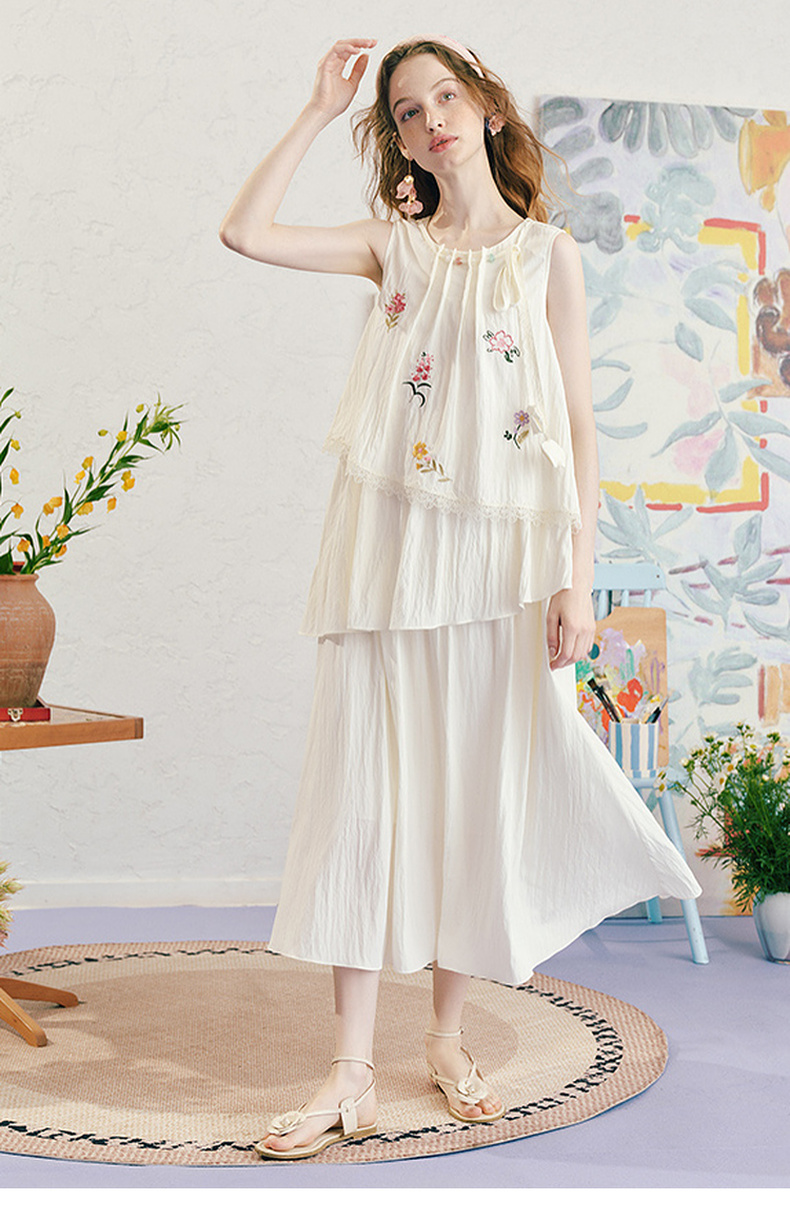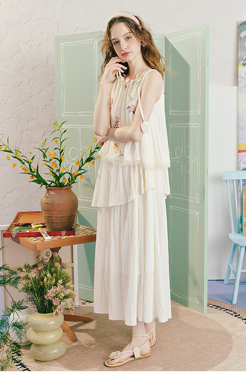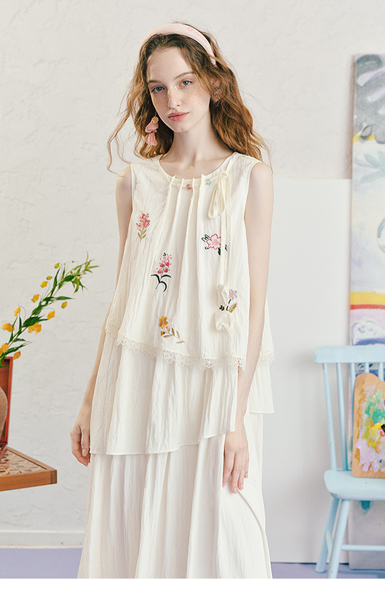 两三事垂云粉町2025夏季新款小清新串珠圆领绣花无袖背心裙连衣裙