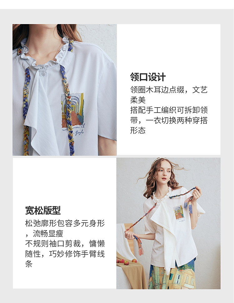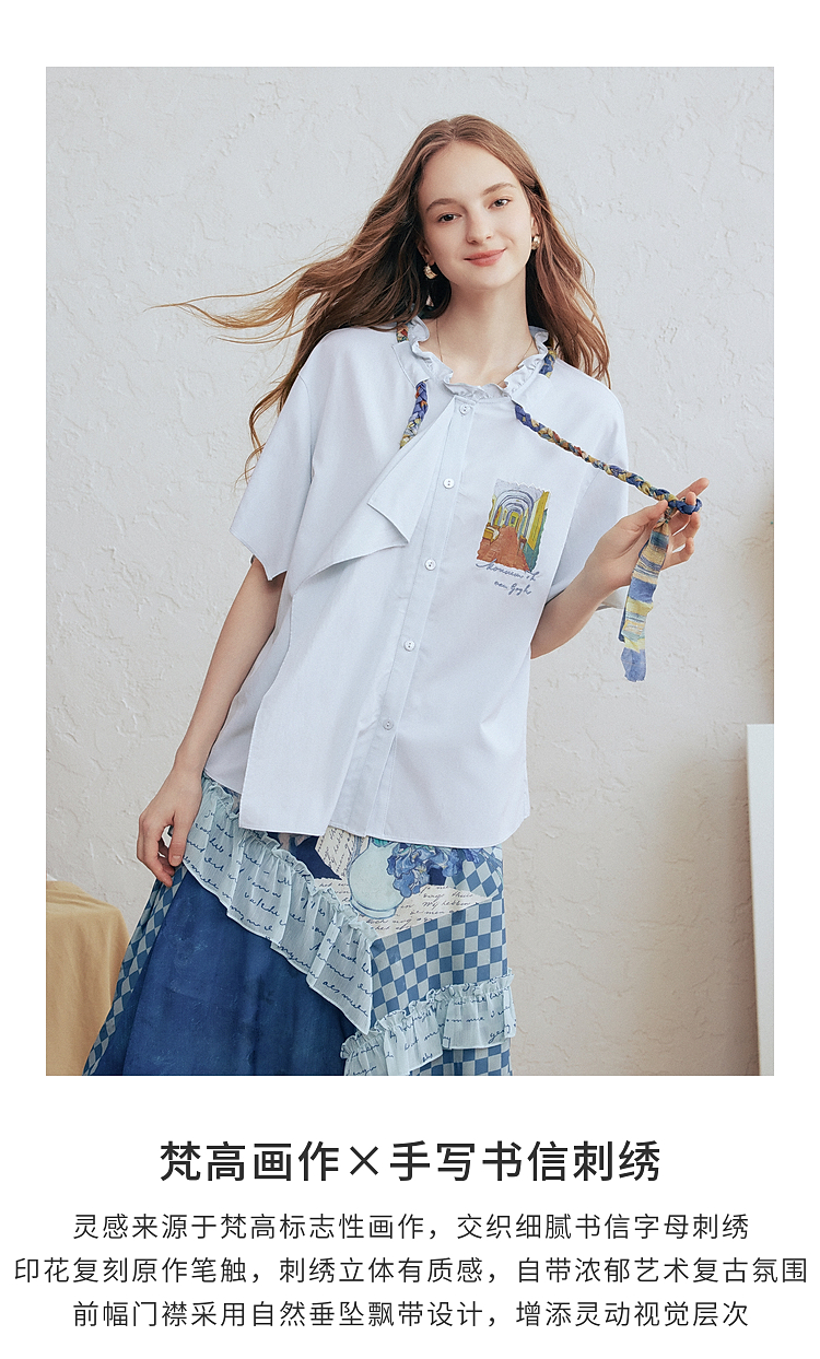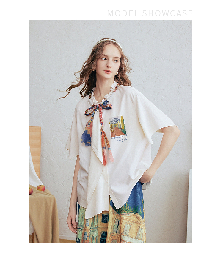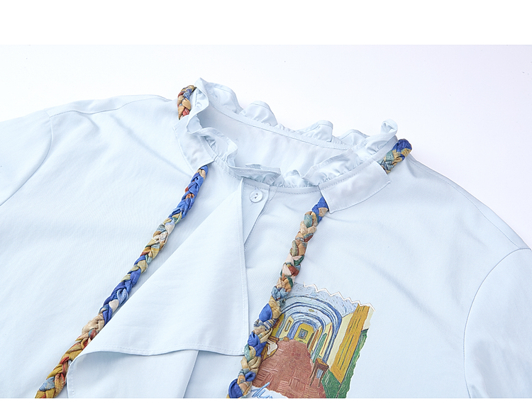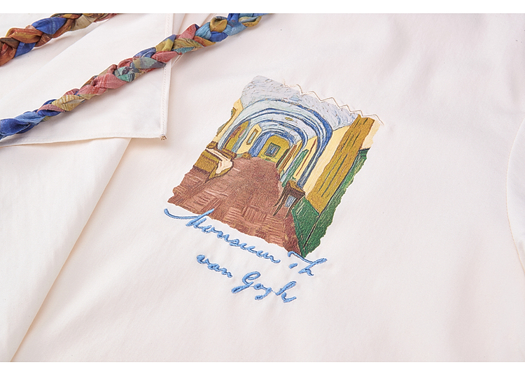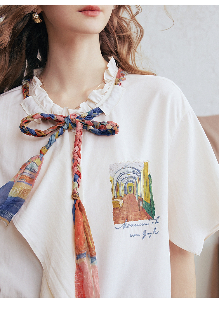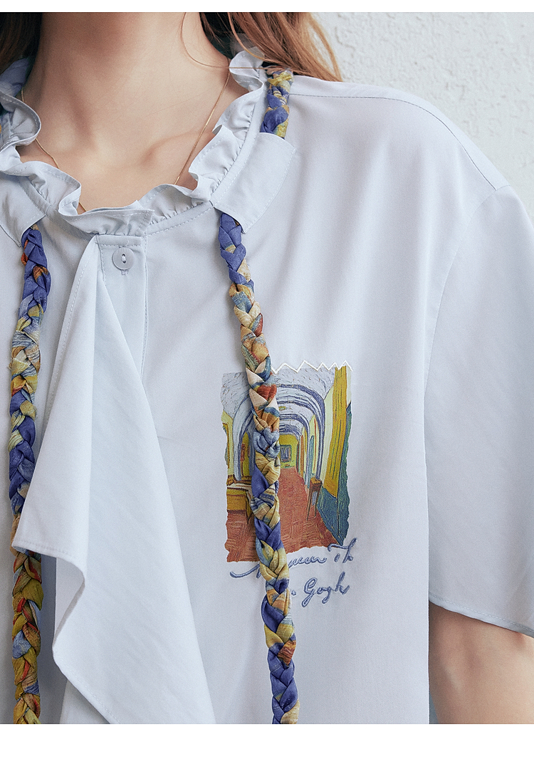 两三事梵高文艺薄翼断章2026春新款麻花辫绑带可拆领带印花衬衫女
