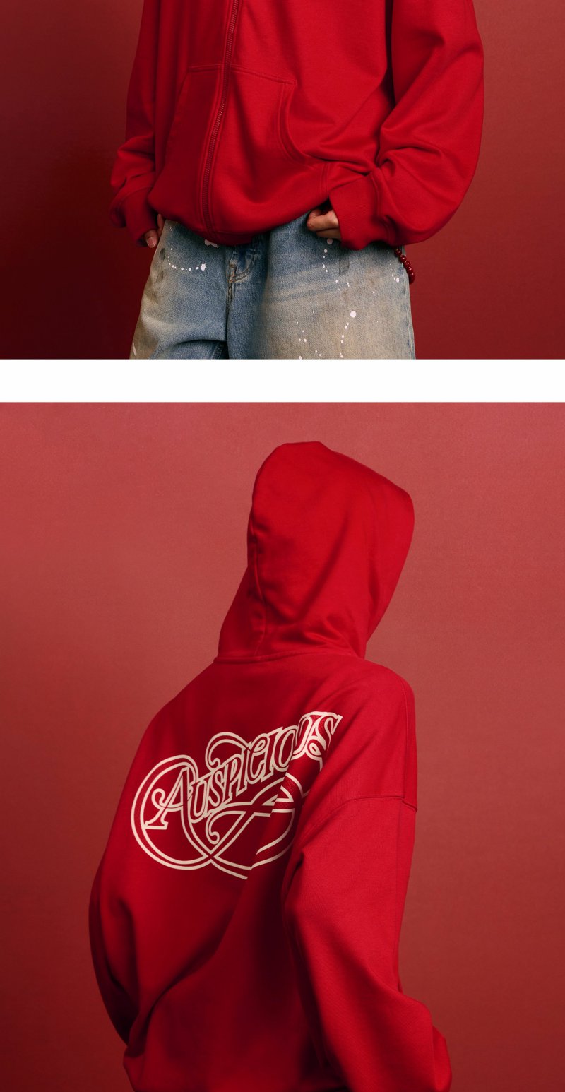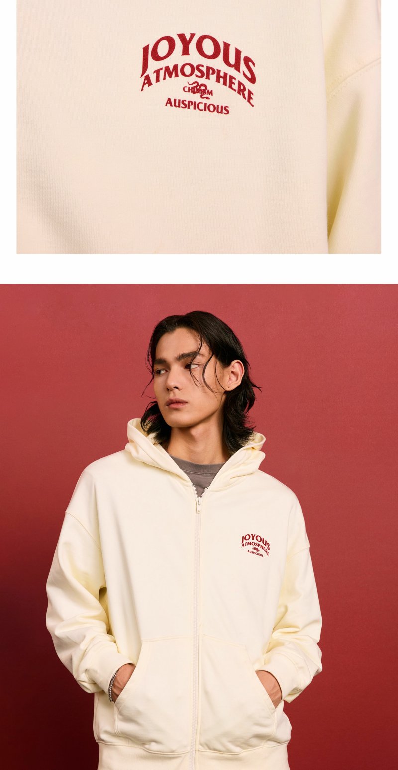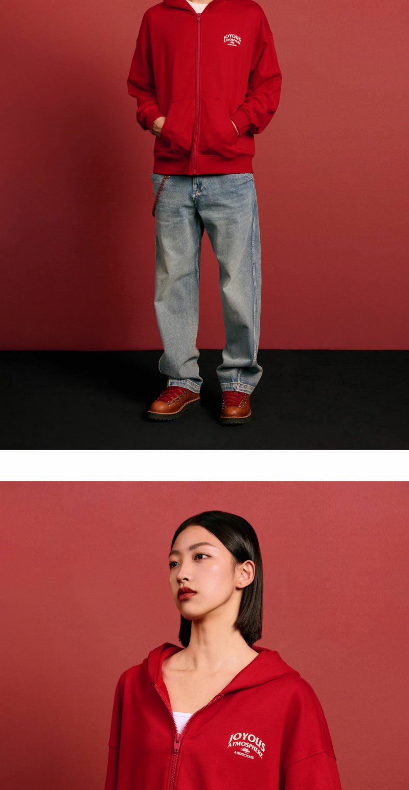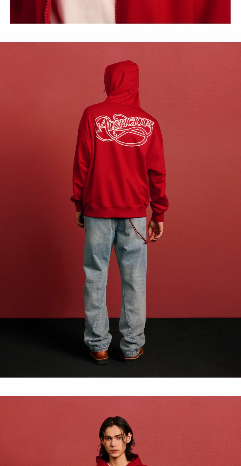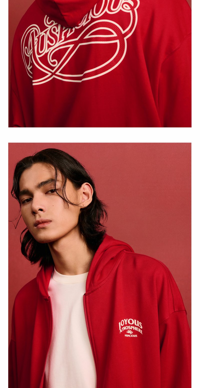 CHINISM折扣季 红色连帽开衫卫衣男秋季宽松发泡印花重磅拉链外套