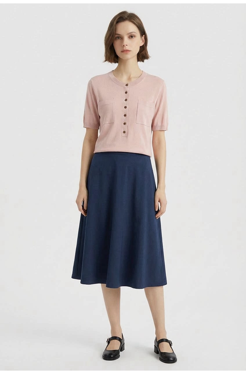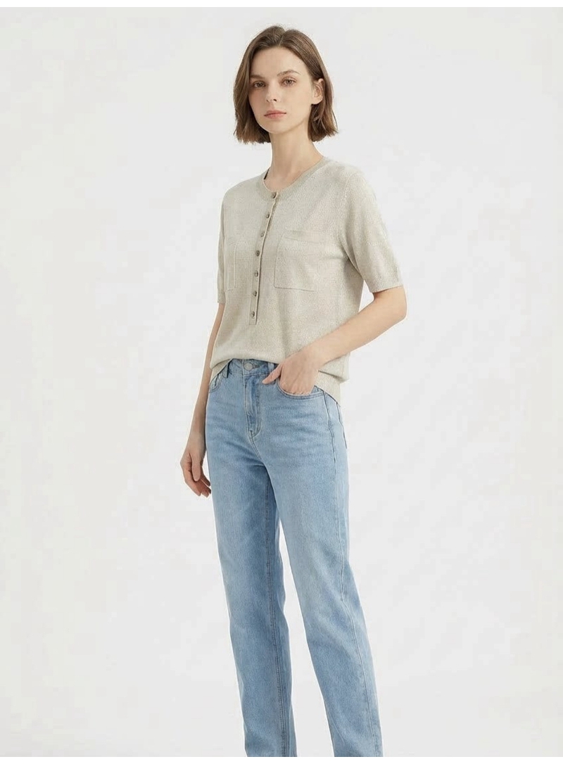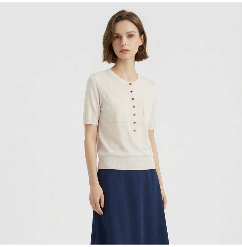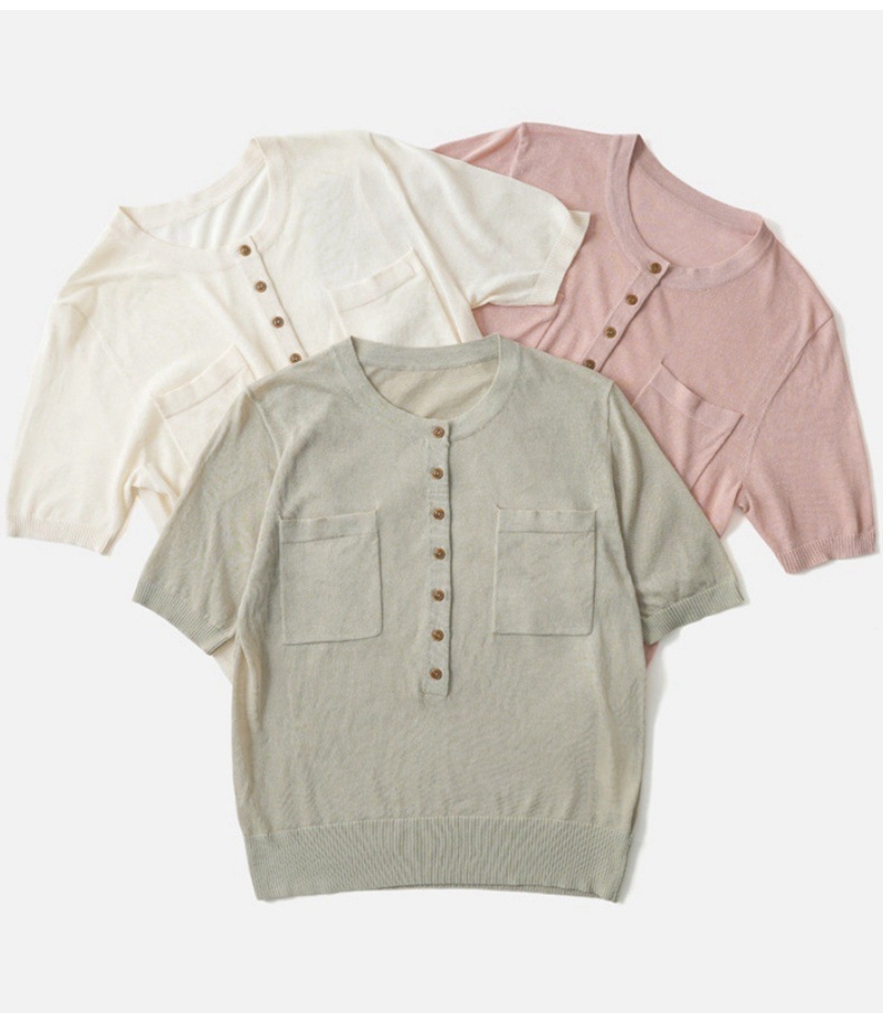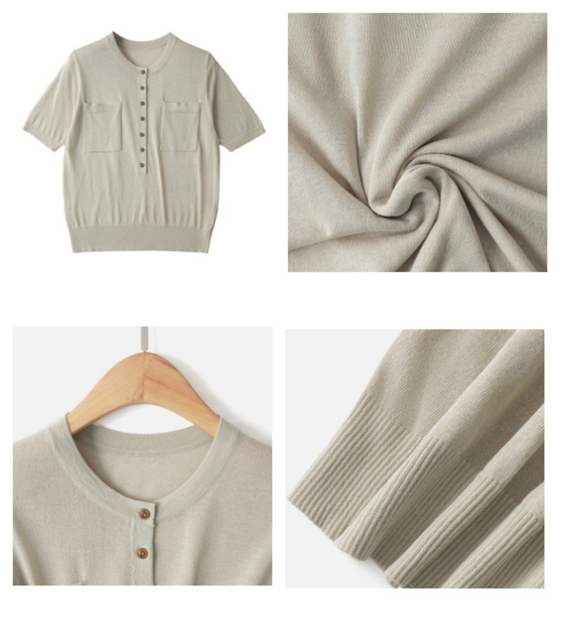 时尚圆领短袖半开胸单排扣修身针织上衣