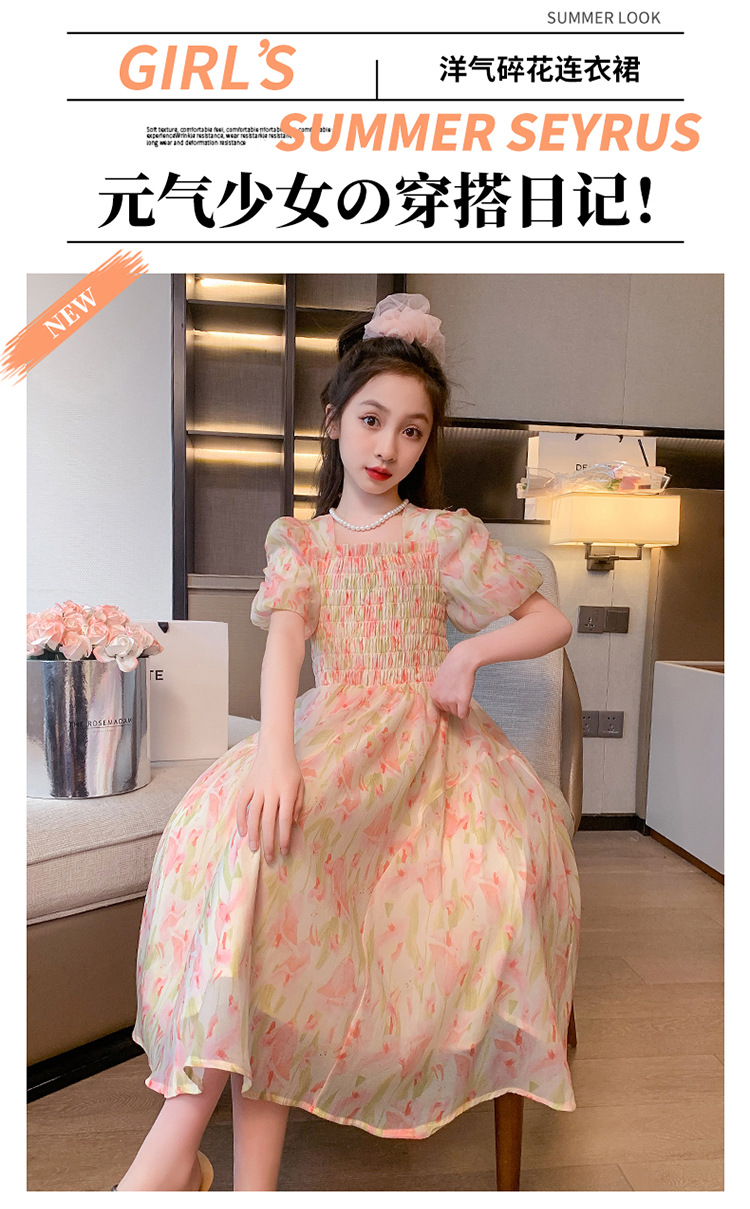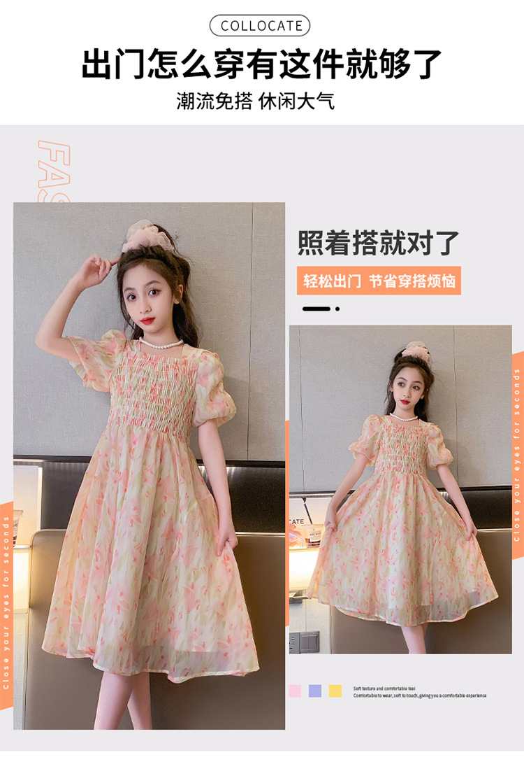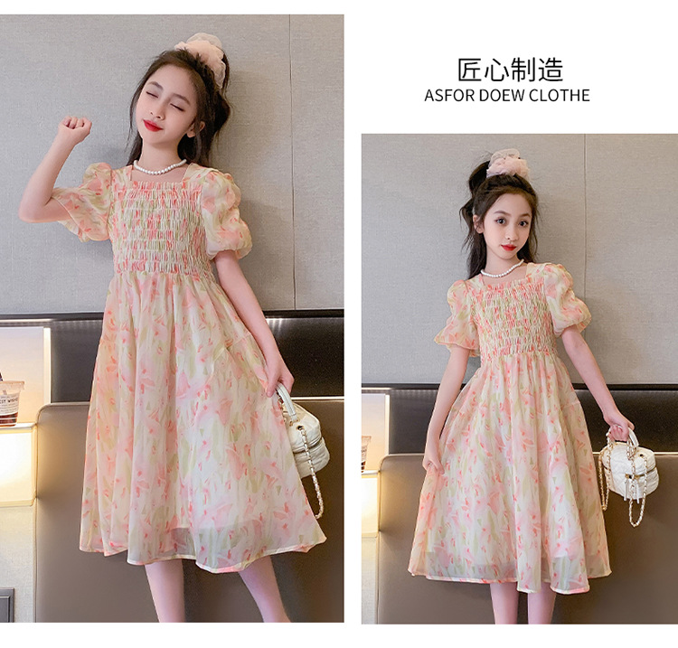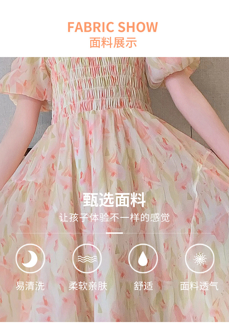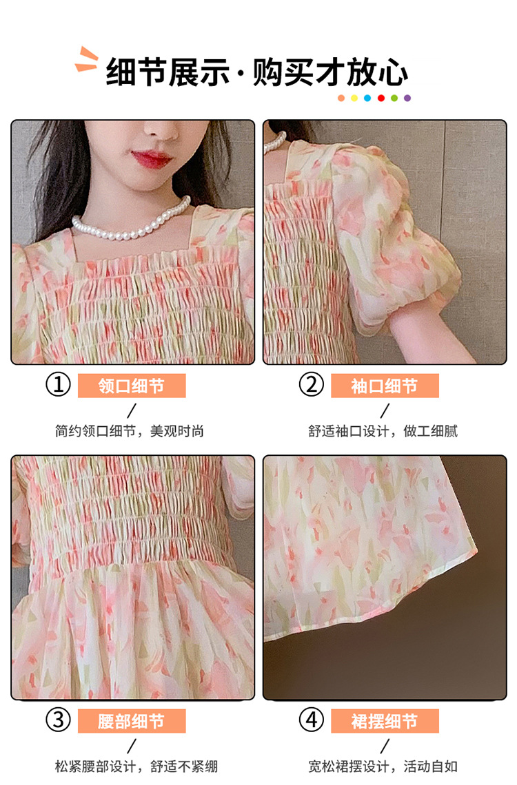 【洋气碎花休闲连衣裙,甜美舒适】休闲出街潮流免搭配休闲大气,宽松裙摆设计活动自如,松紧腰部设计舒适不紧绷女童连衣裙,夏装洋气 儿童韩版网红中大童夏季短袖公主裙子-QQ