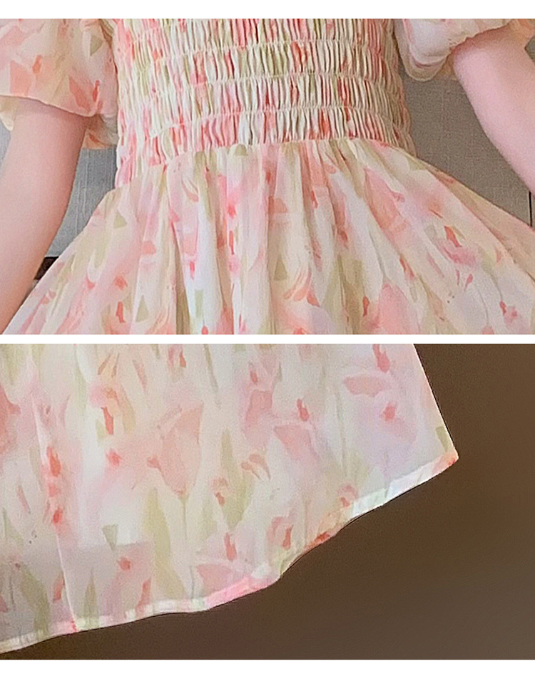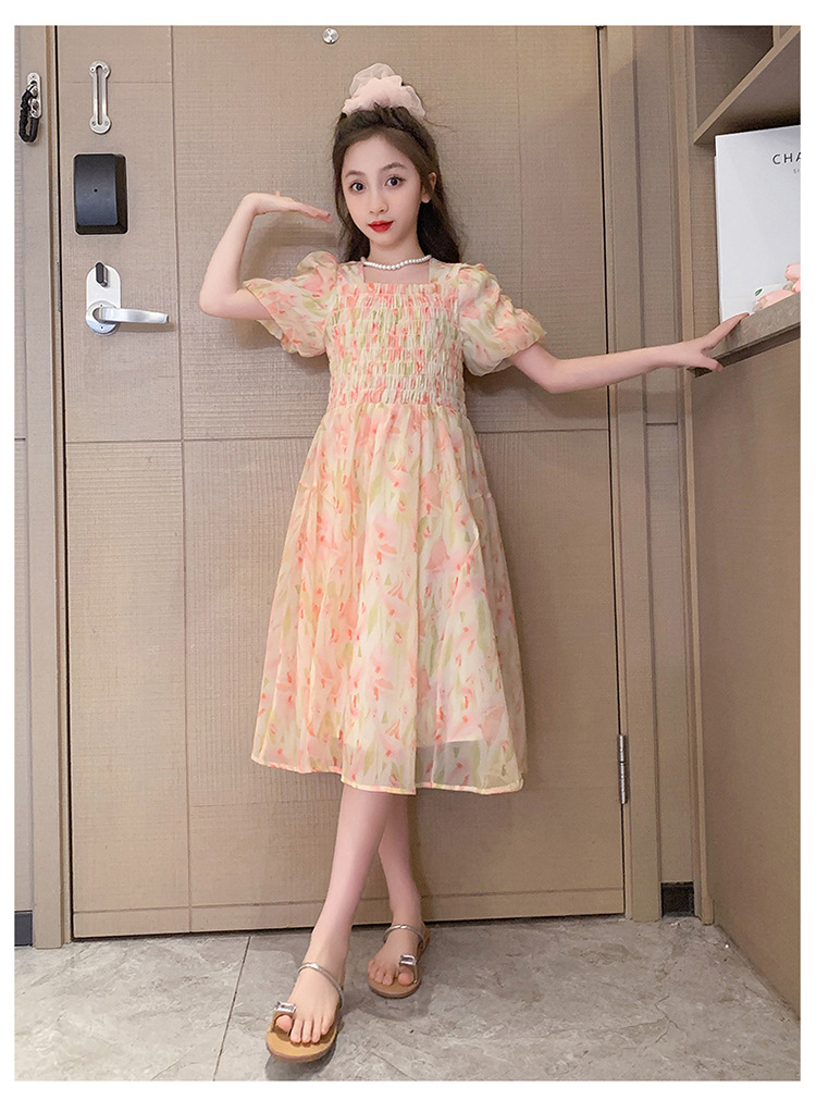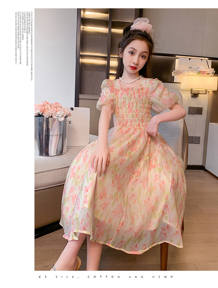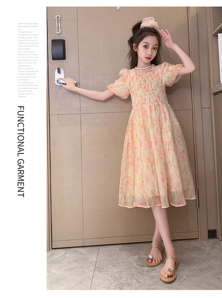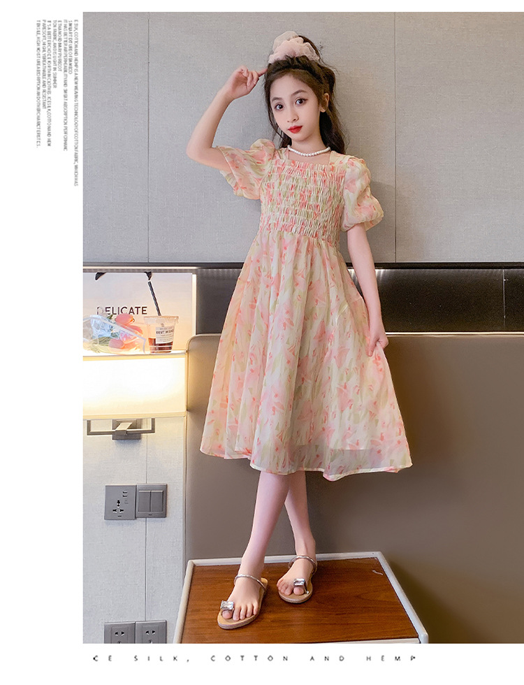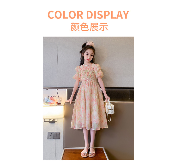 【洋气碎花休闲连衣裙,甜美舒适】休闲出街潮流免搭配休闲大气,宽松裙摆设计活动自如,松紧腰部设计舒适不紧绷女童连衣裙,夏装洋气 儿童韩版网红中大童夏季短袖公主裙子-QQ