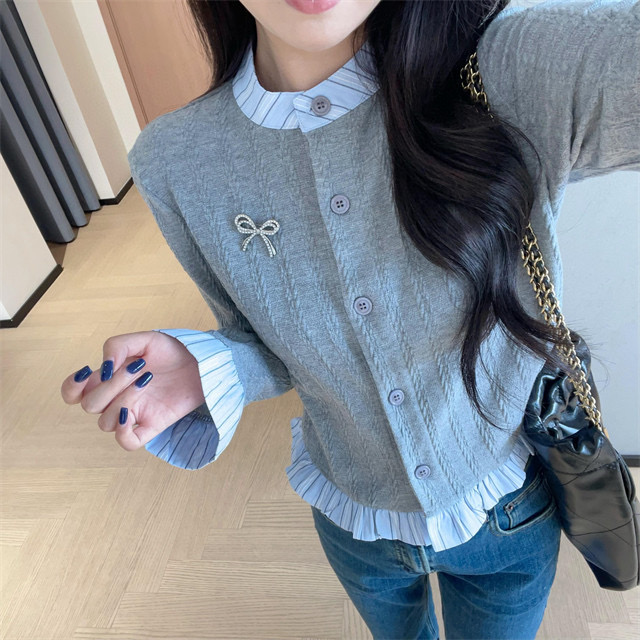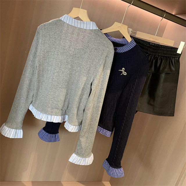 💰79元包邮, 【9512】miu系 设计感假两件法式开衫荷叶边上衣(送蝴蝶别针) 复古优雅T恤打造毫不费力的通勤穿搭颜色:灰色 藏蓝色