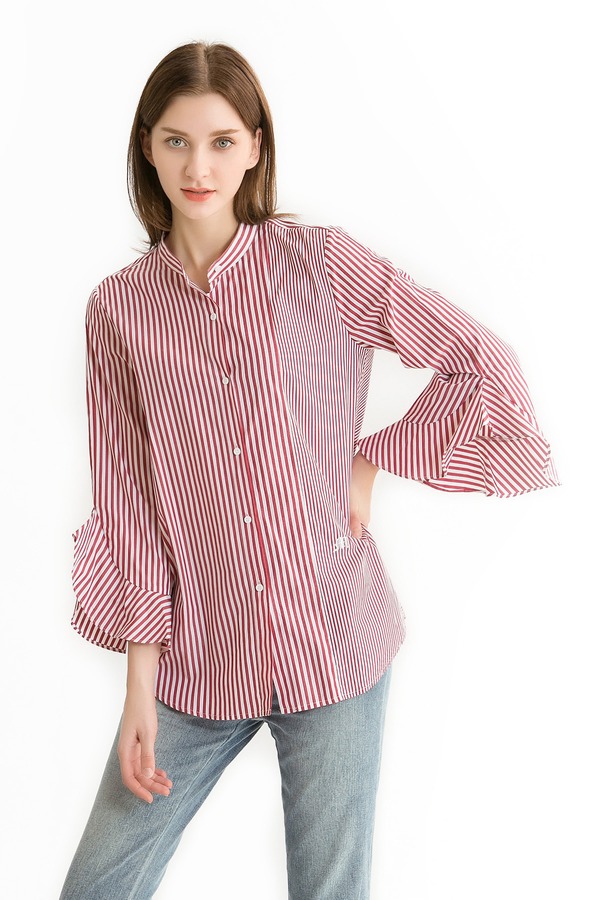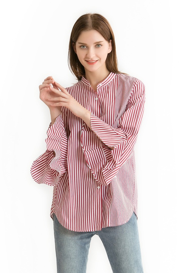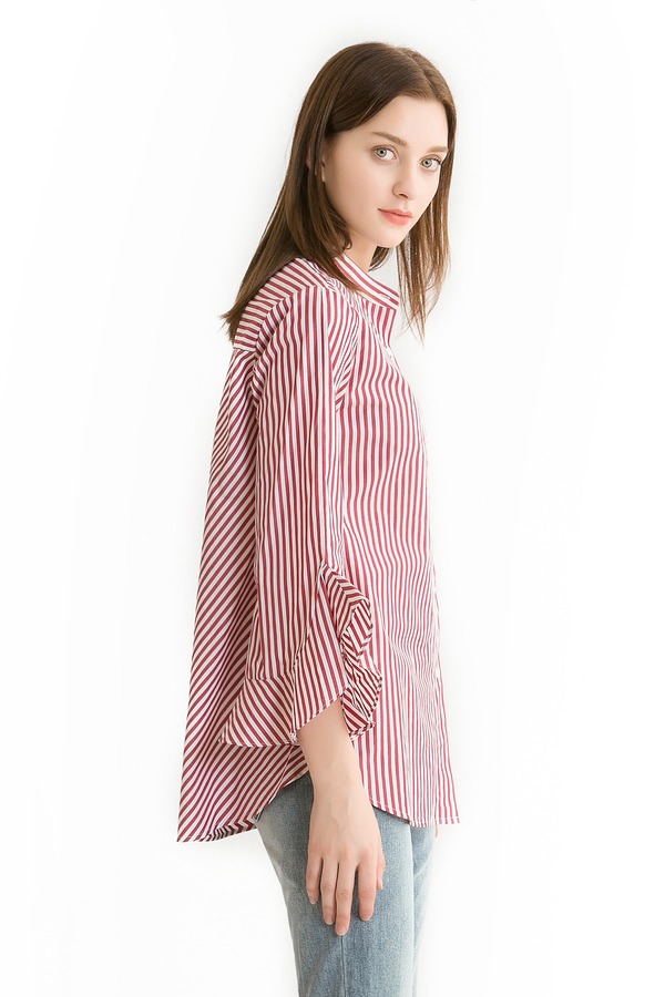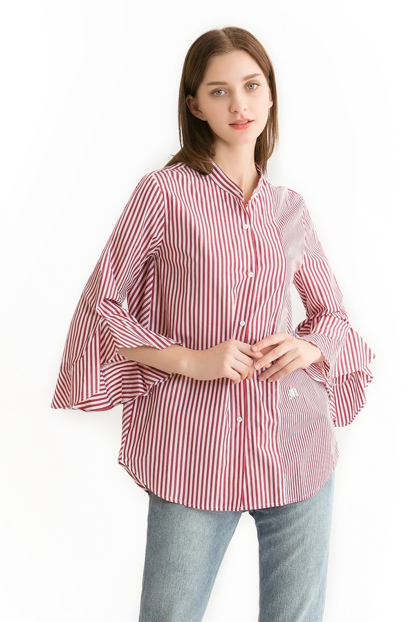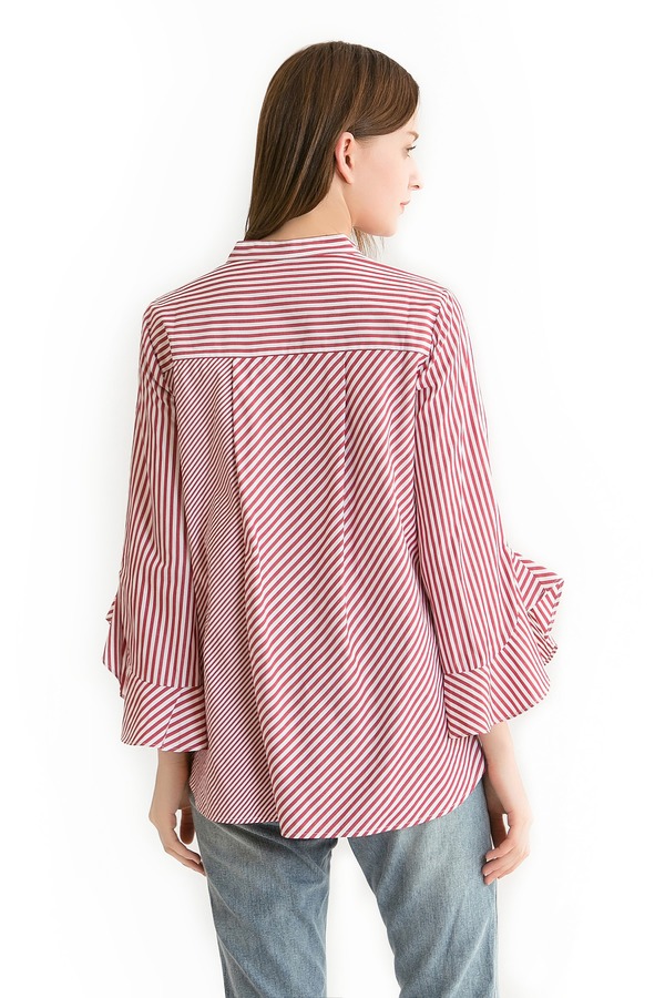 Mo&Co.摩安珂 红白条纹荷叶袖衬衫 340