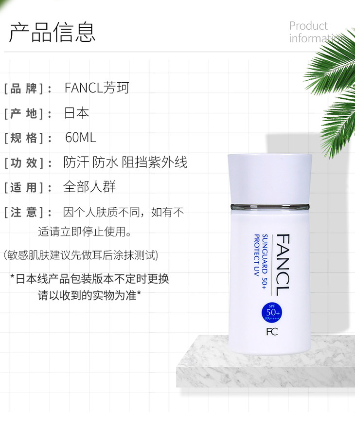 日本FANCL/芳珂物理防晒隔离乳霜防水无添加孕妇可用60ml