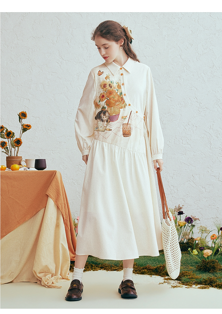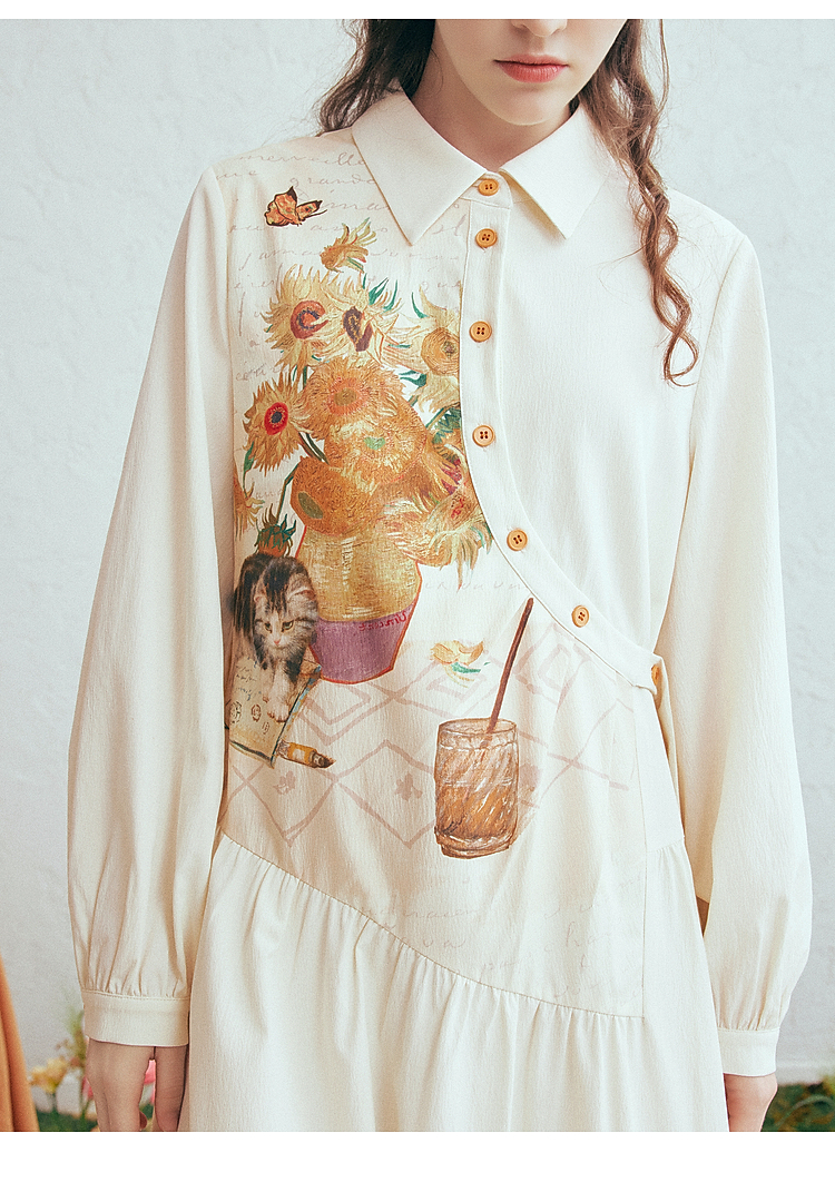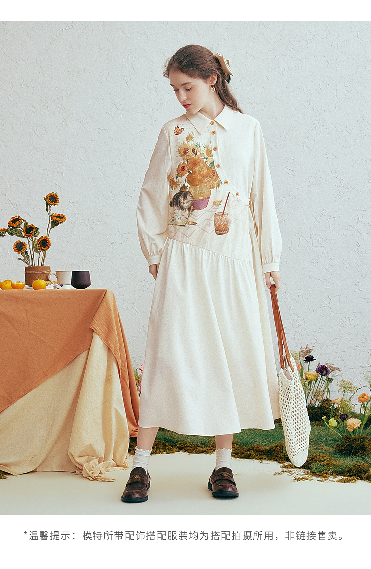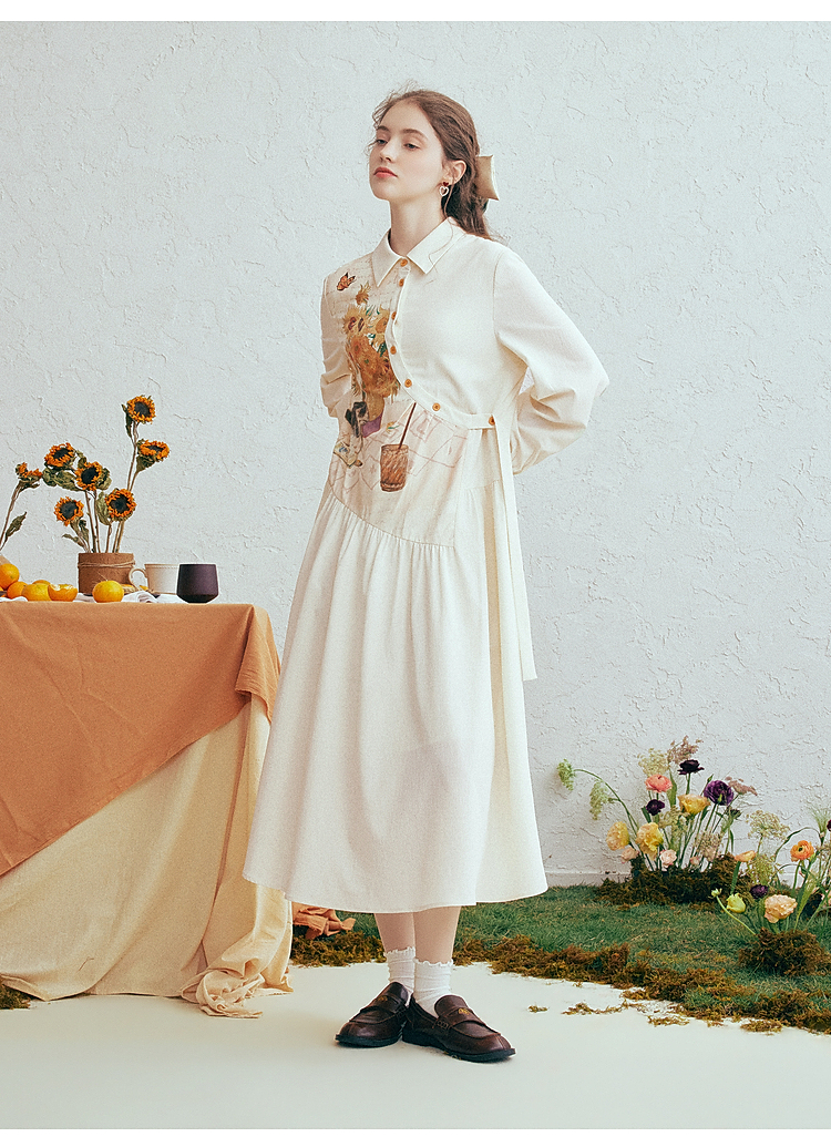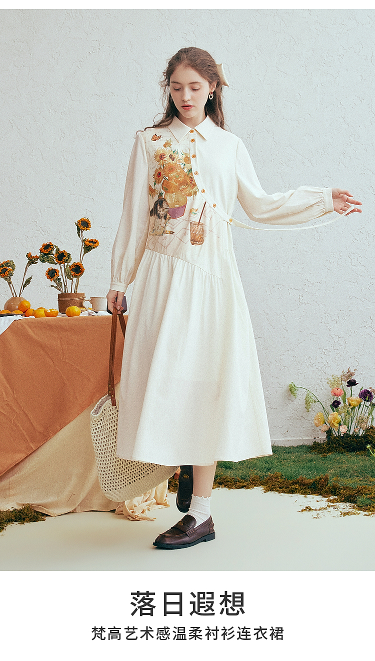 两三事梵高文艺 落日遐想 2026春季新款印花斜边纽扣绑带连衣裙