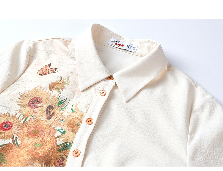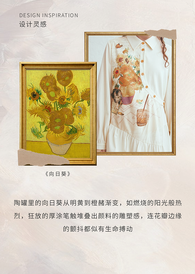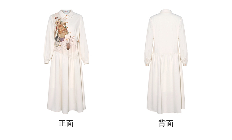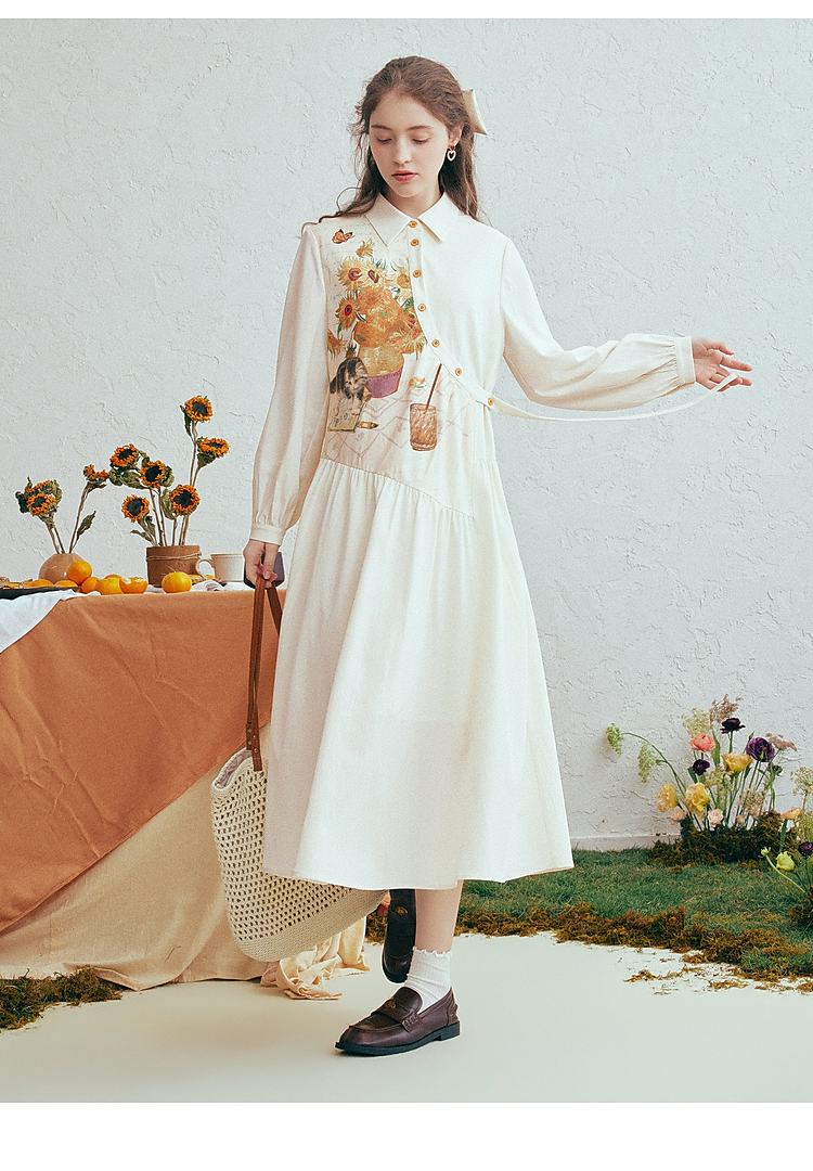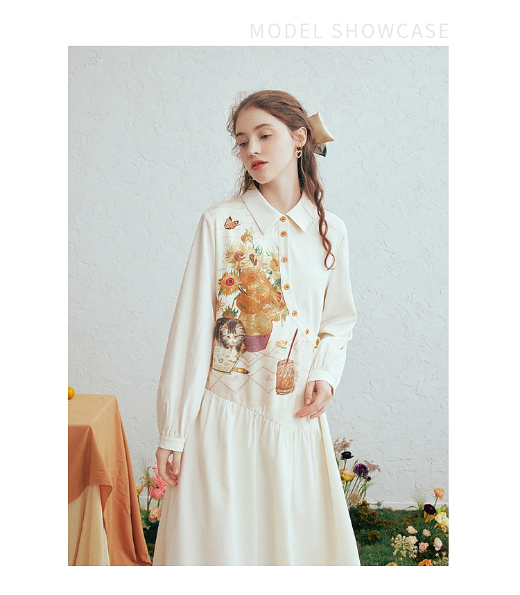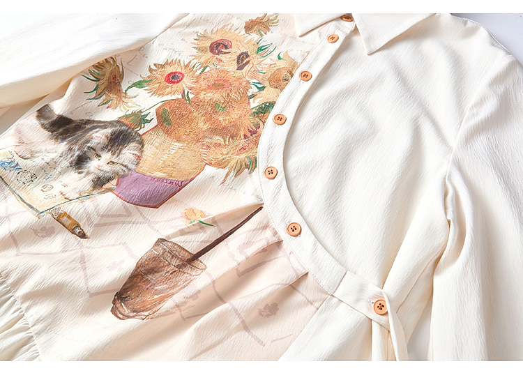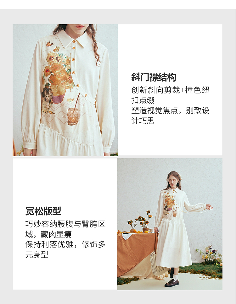 两三事梵高文艺 落日遐想 2026春季新款印花斜边纽扣绑带连衣裙