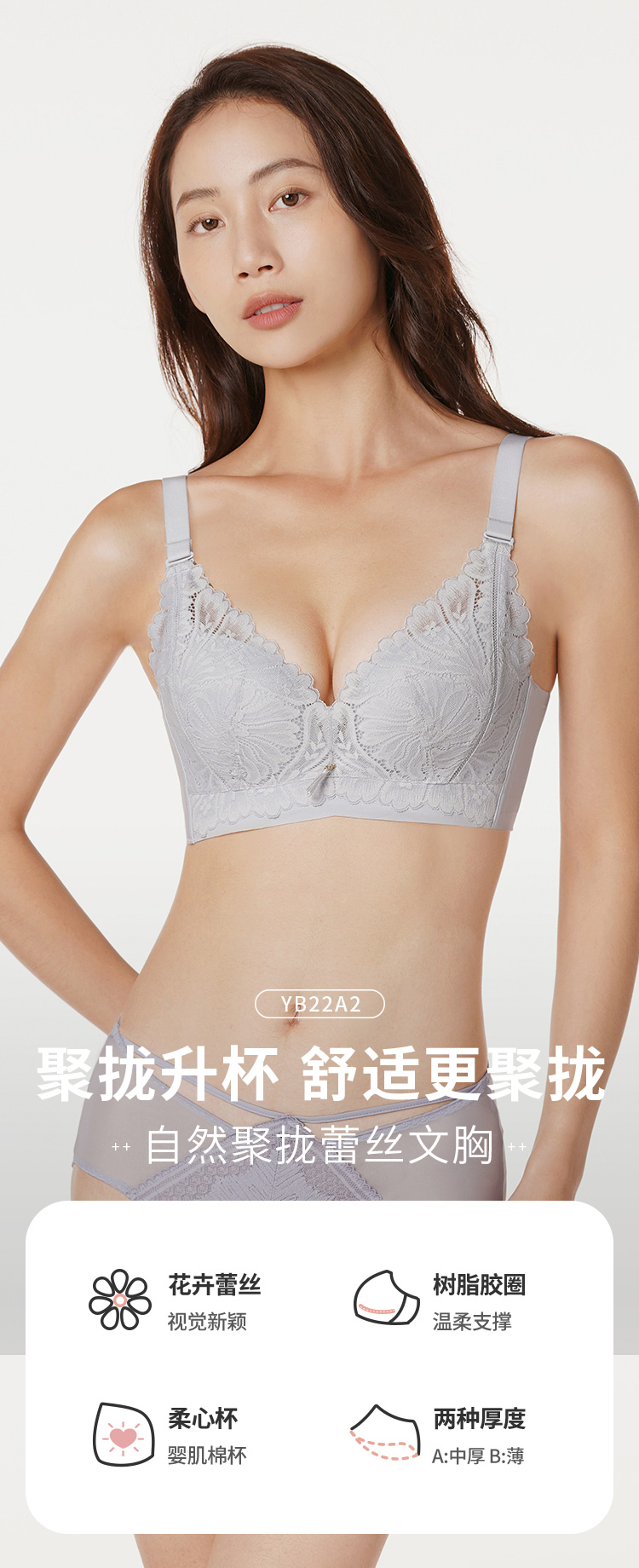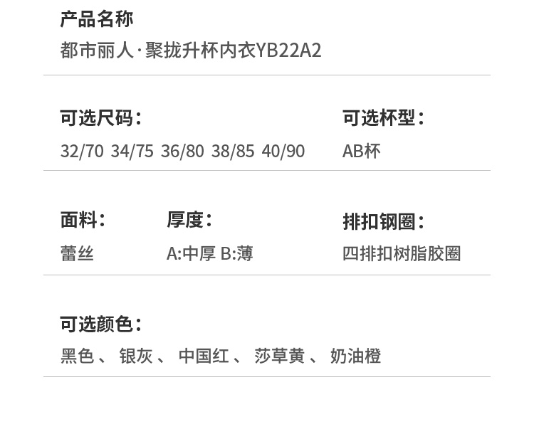 都市丽人聚拢升杯聚拢杯AB杯内衣蕾丝A:中厚B:薄3/4杯文胸四排扣树脂胶圈YB22A2