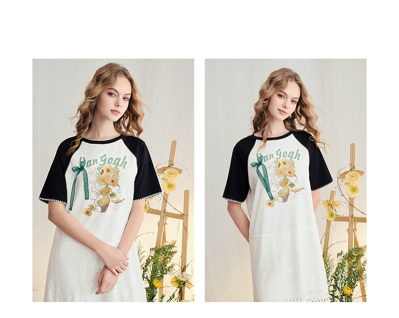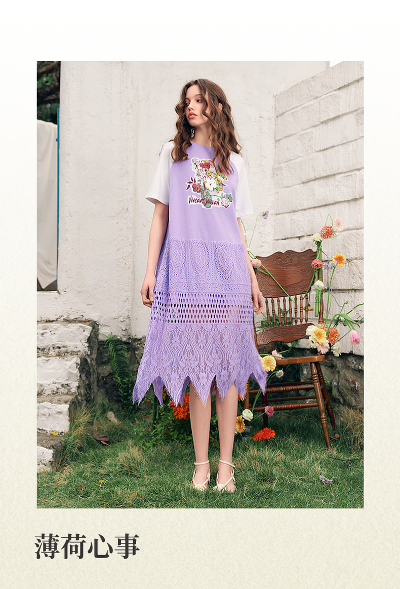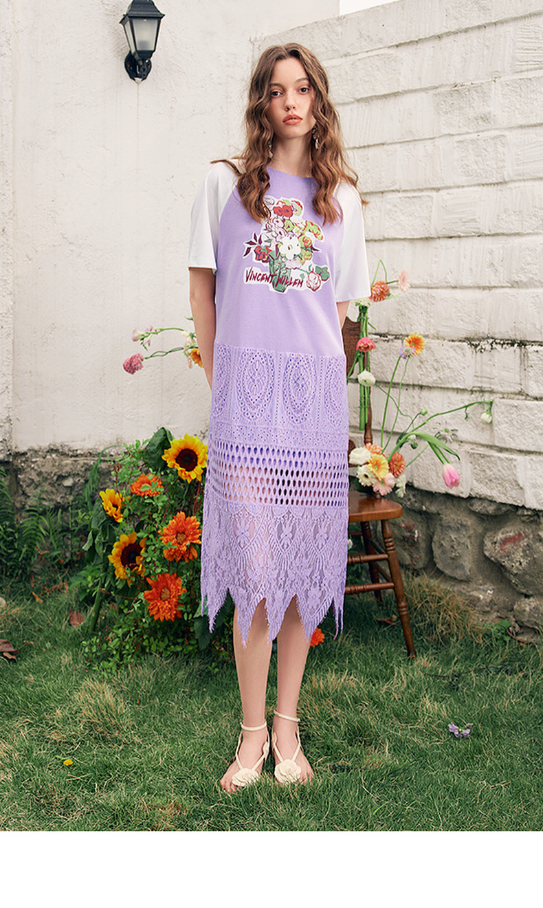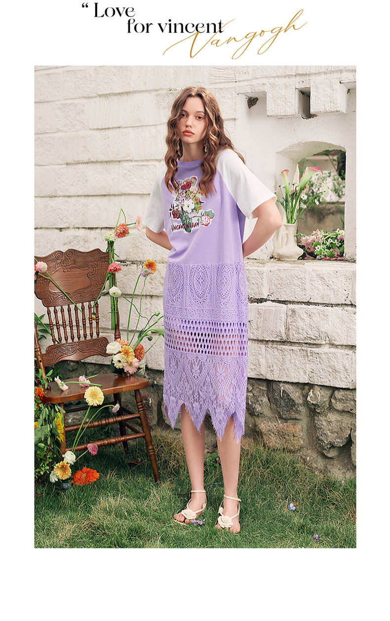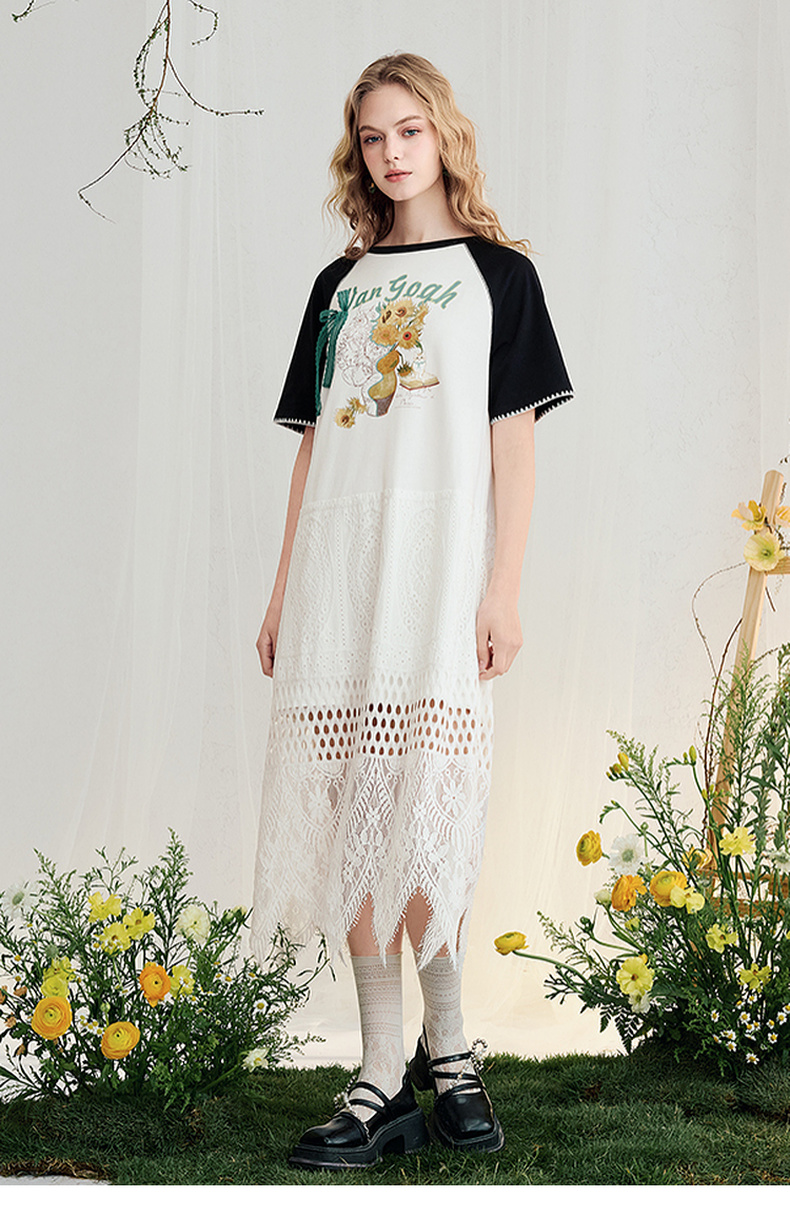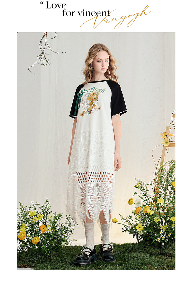 两三事梵高文艺薄荷心事2025夏新款镂空蕾丝裙摆印花t恤裙连衣裙