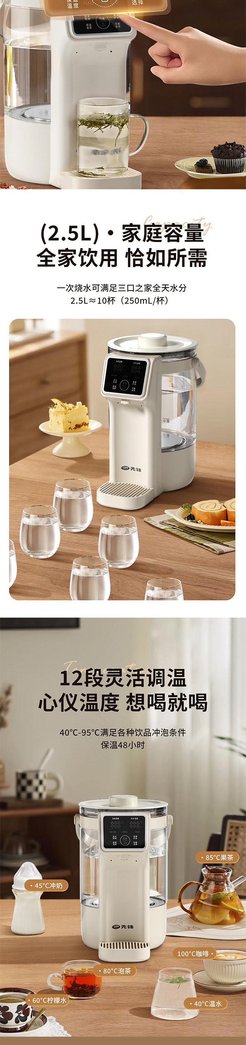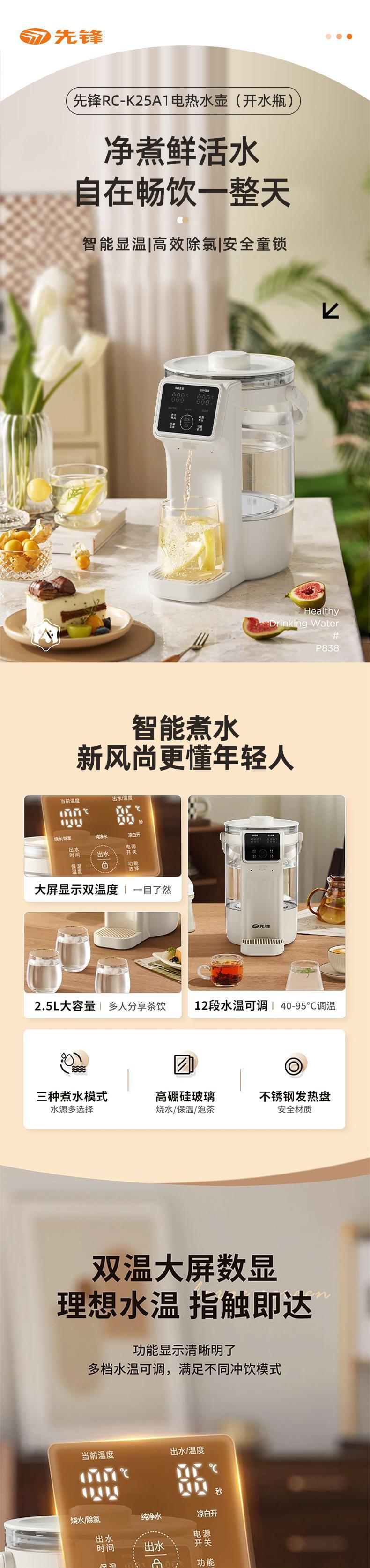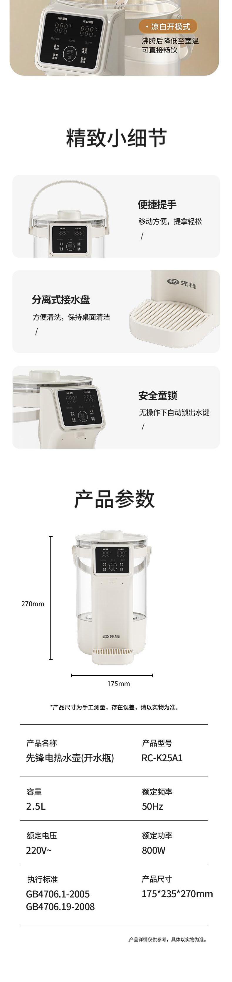 【自营】先锋RC-K25A1电热水壶(开水瓶)2.5L电热水瓶保温一键出水智能恒温大容量