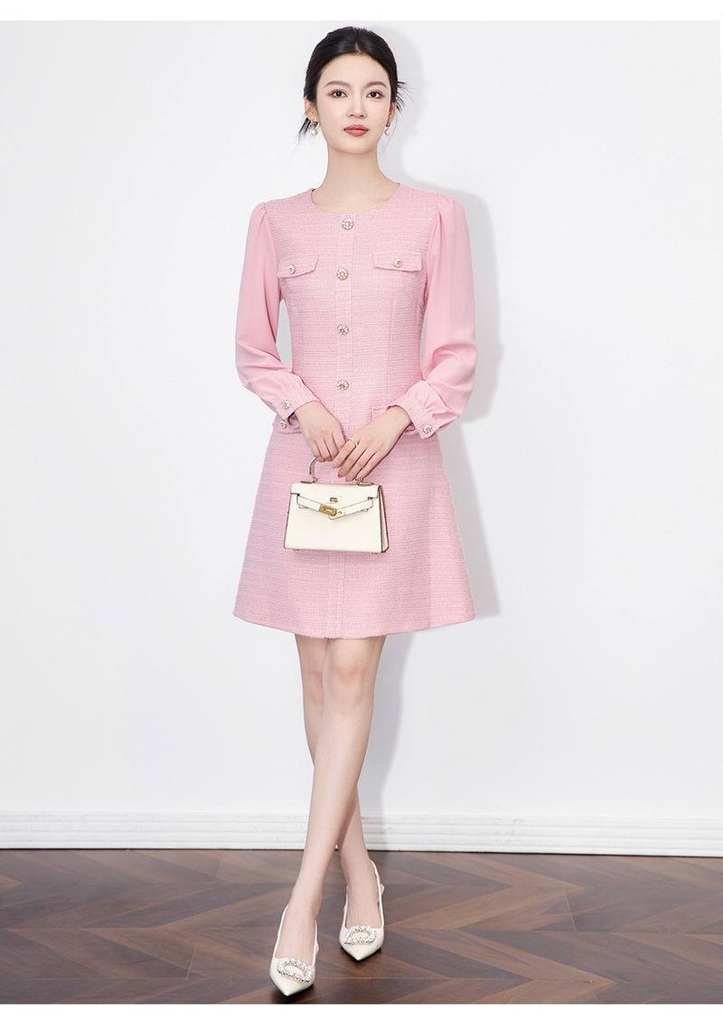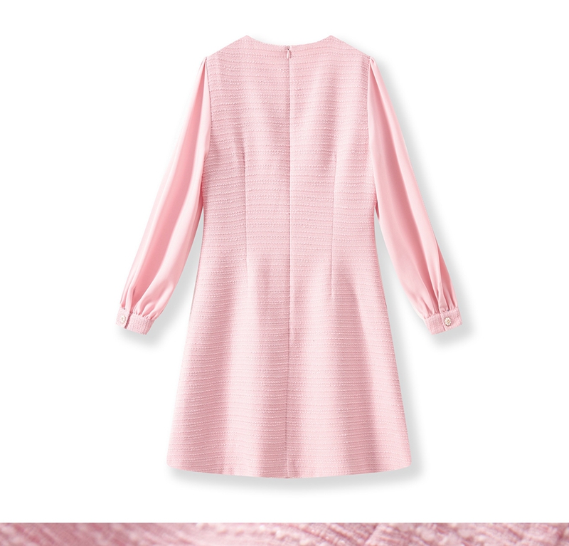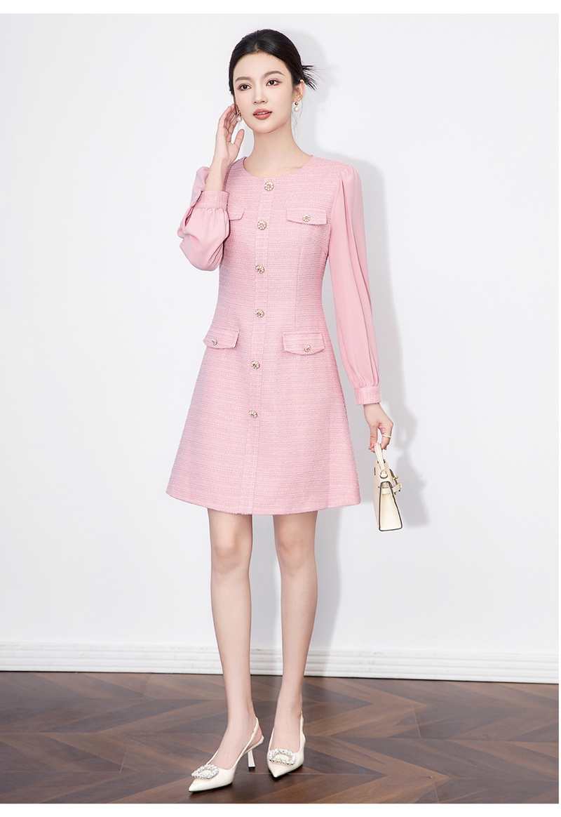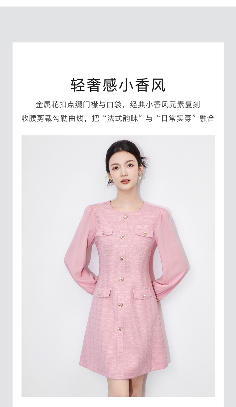 小香风优雅圆领长袖单排扣后拉链收腰连衣裙