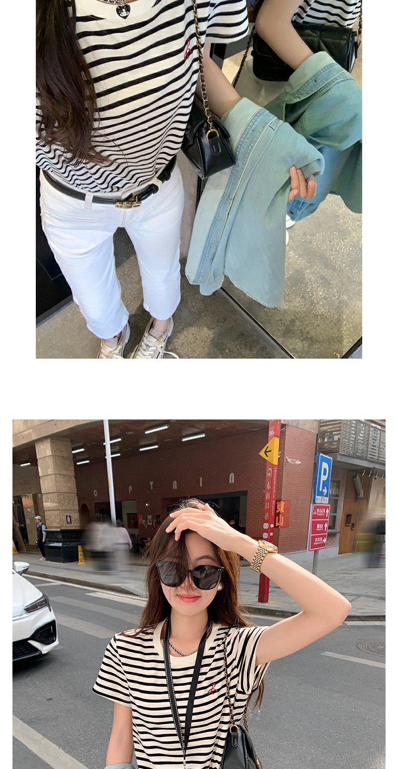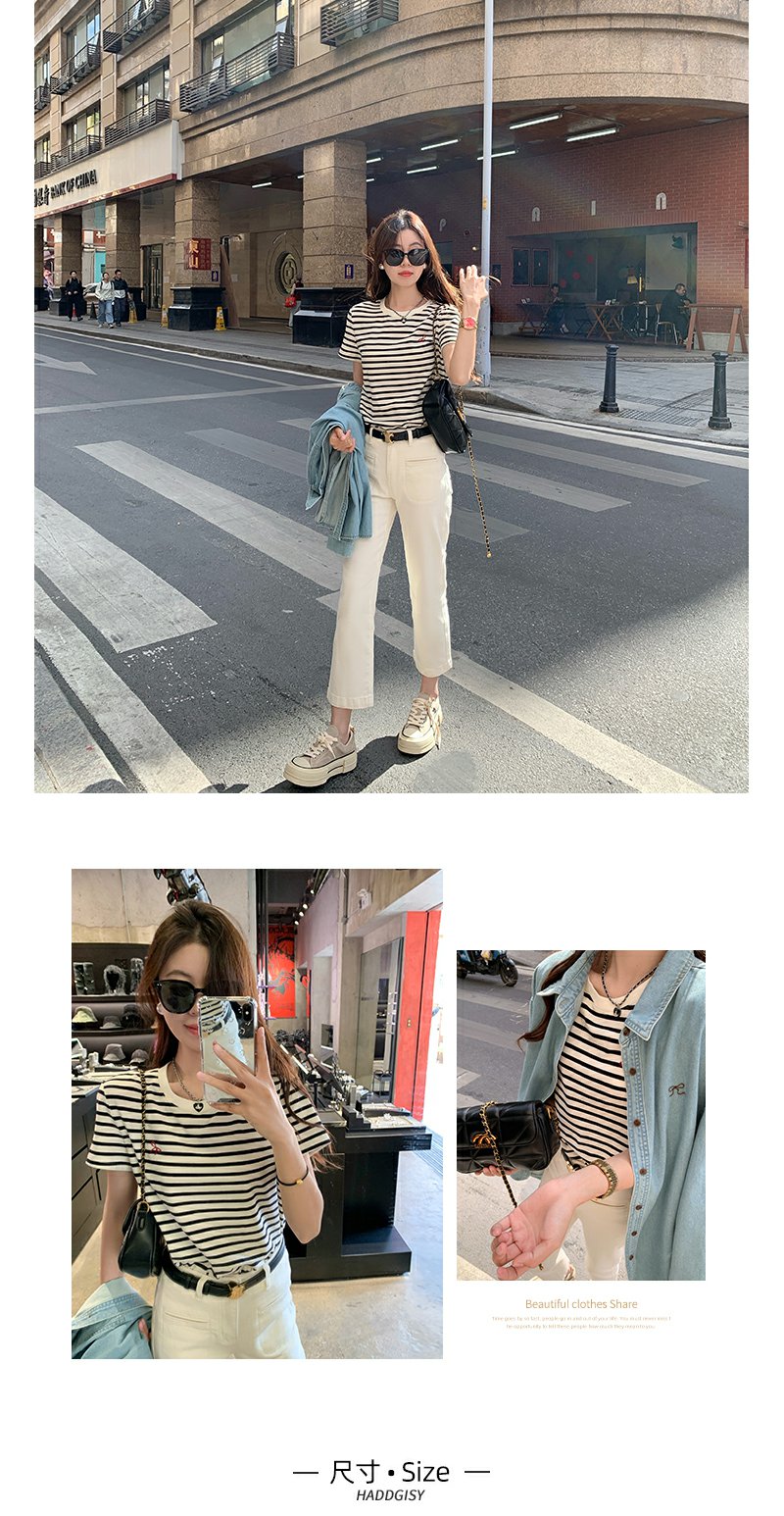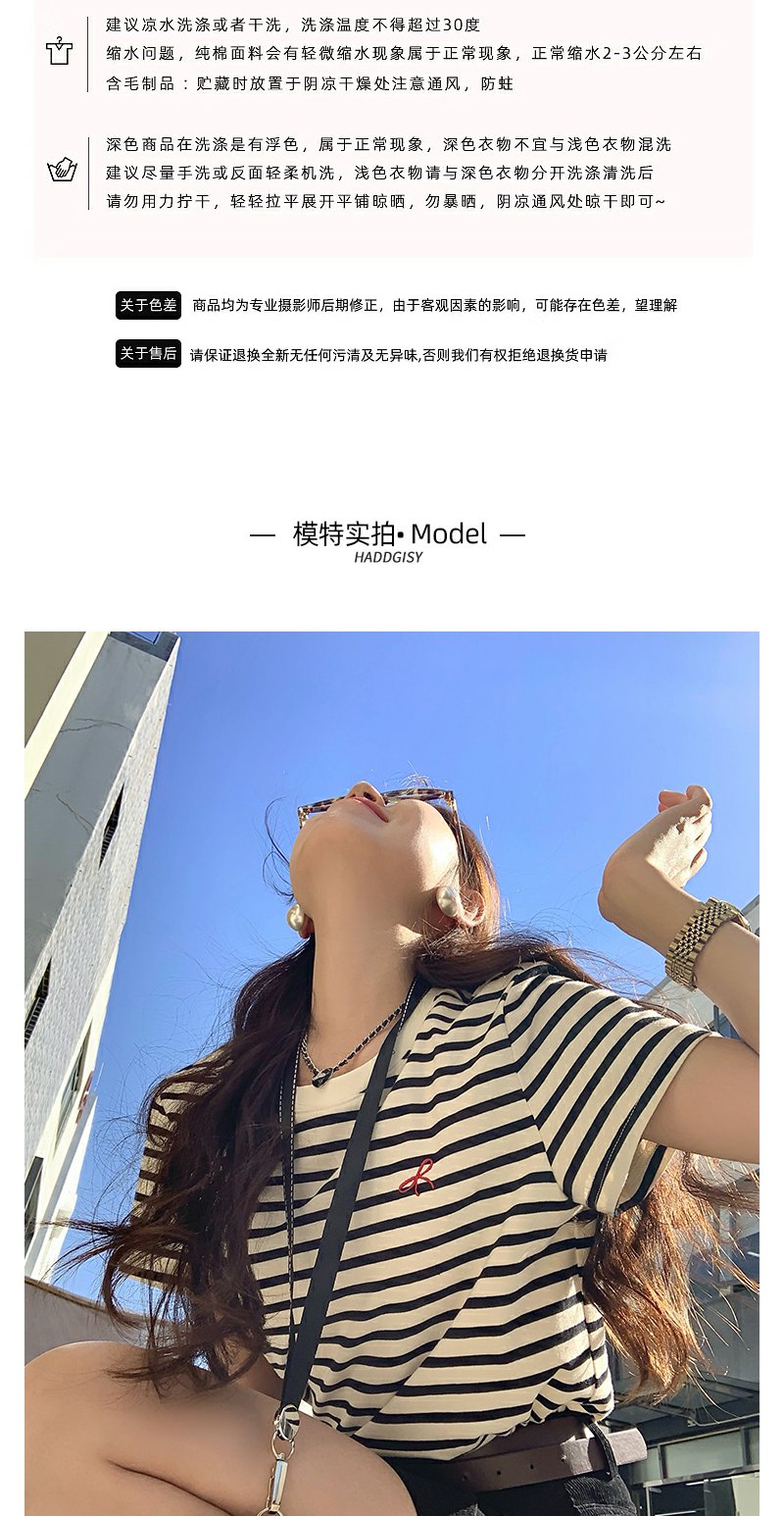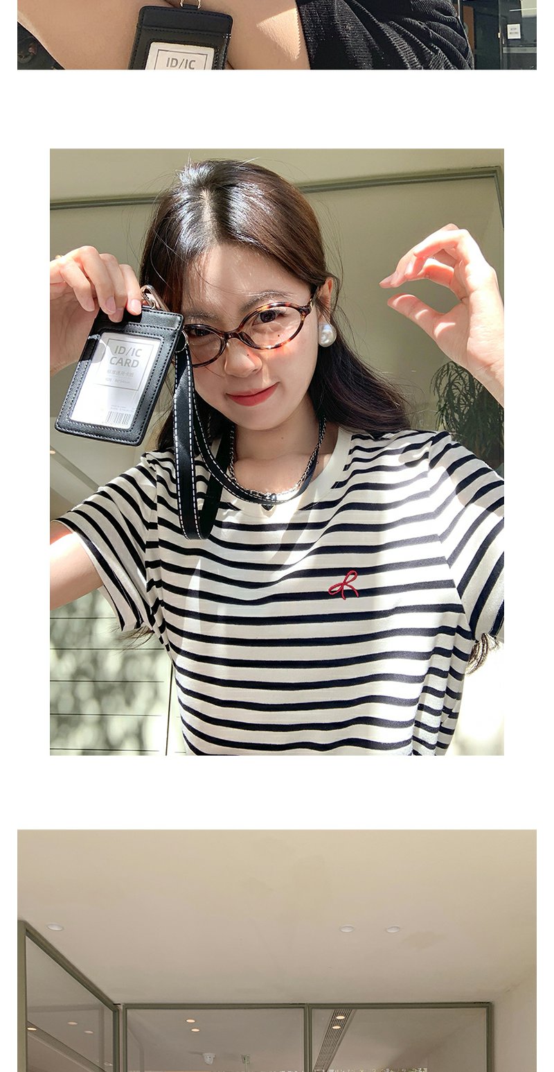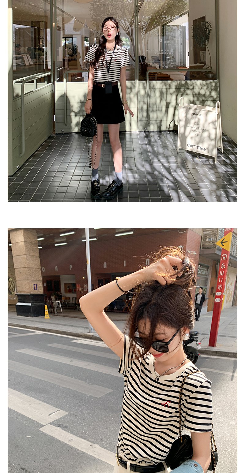 <曾小咸推荐>蝴蝶结小刺绣黑杏条纹圆领短袖T恤