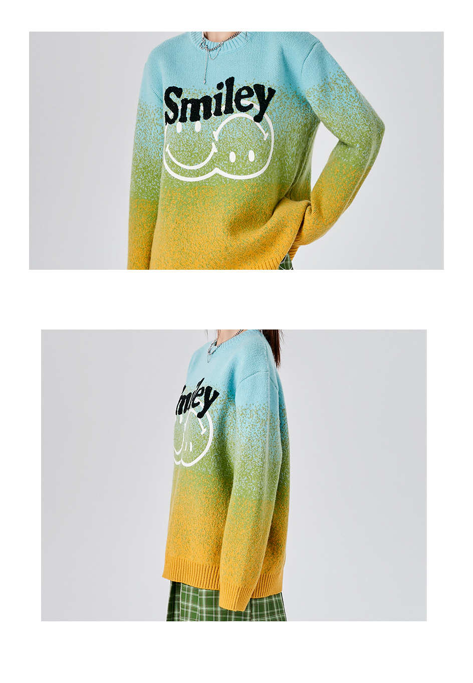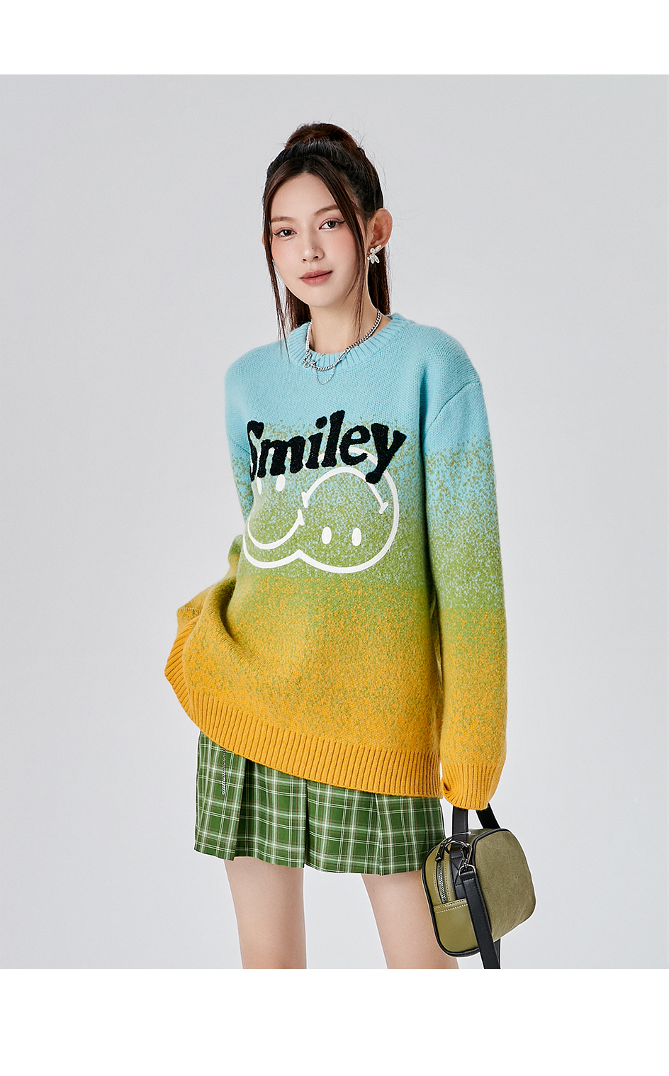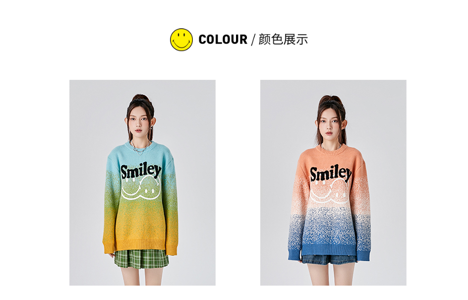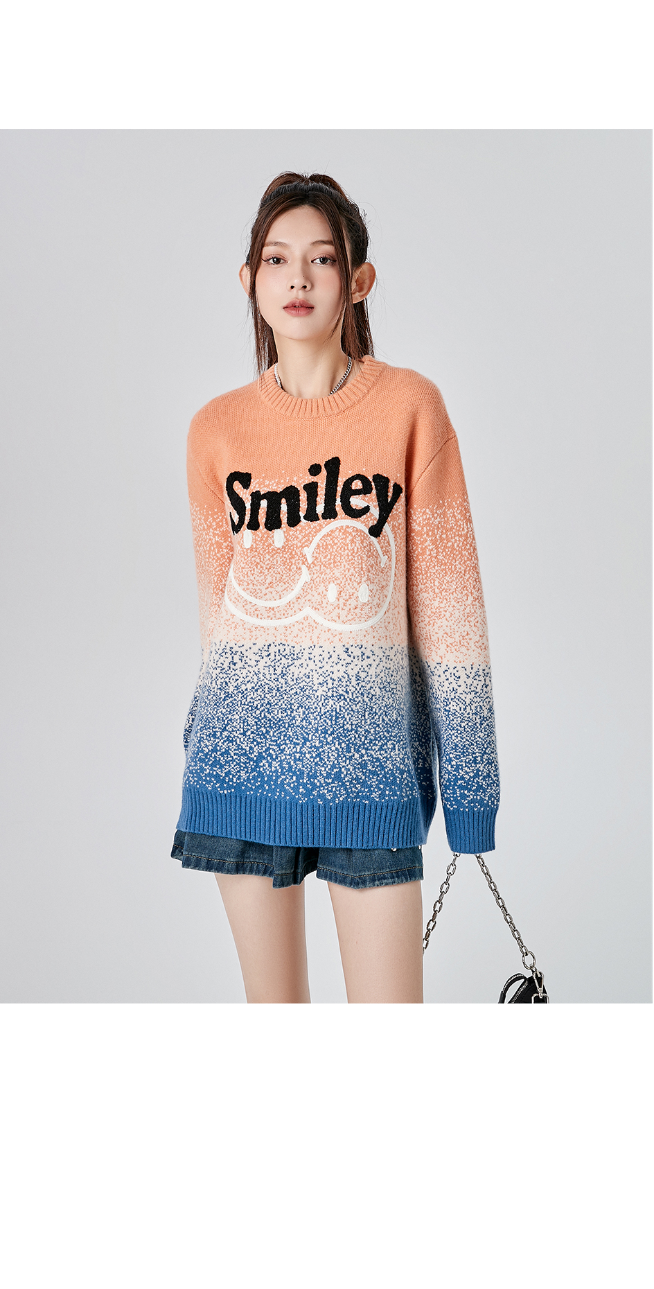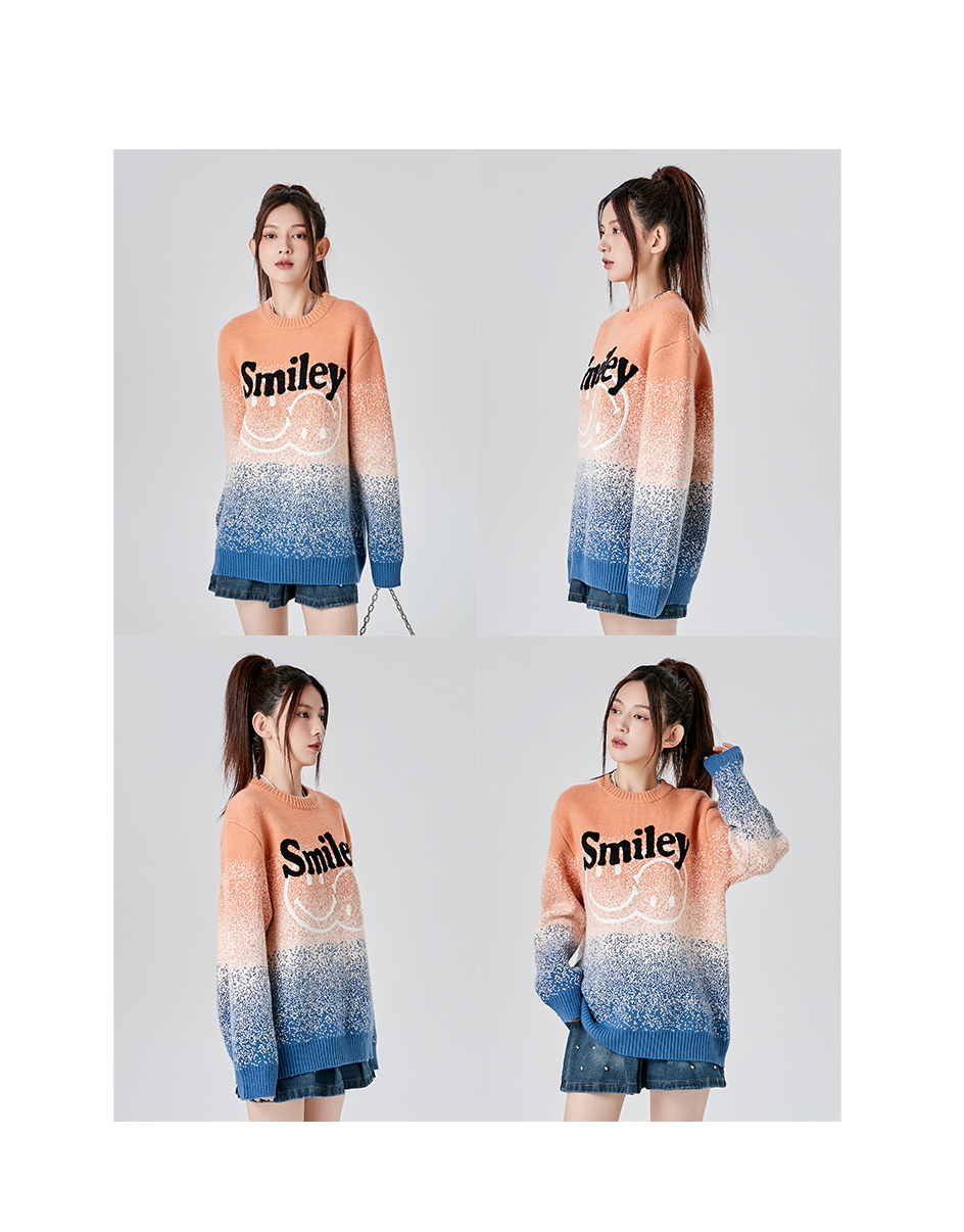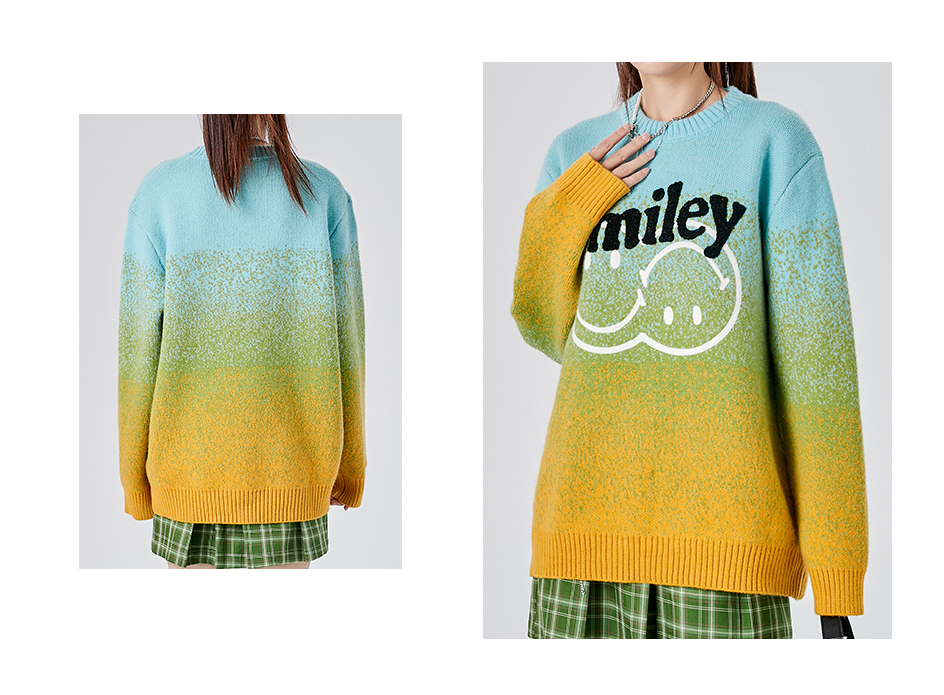 【品名】:字母毛巾刺绣渐变圆领毛衣