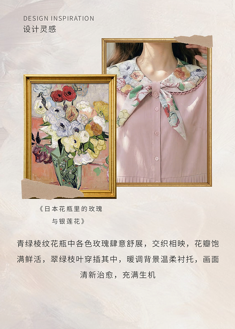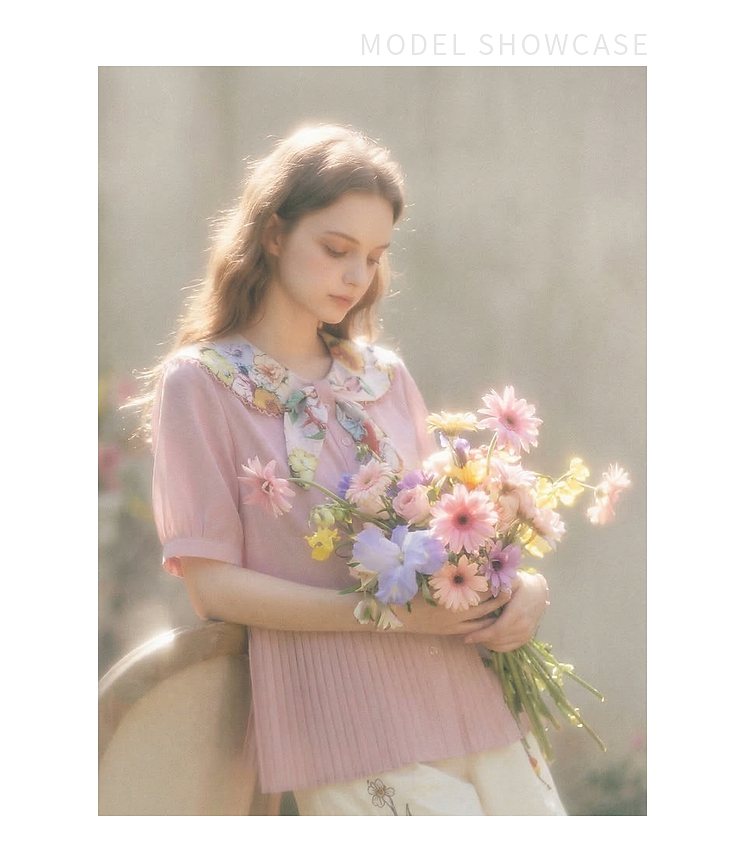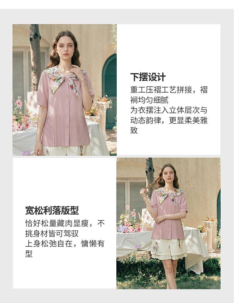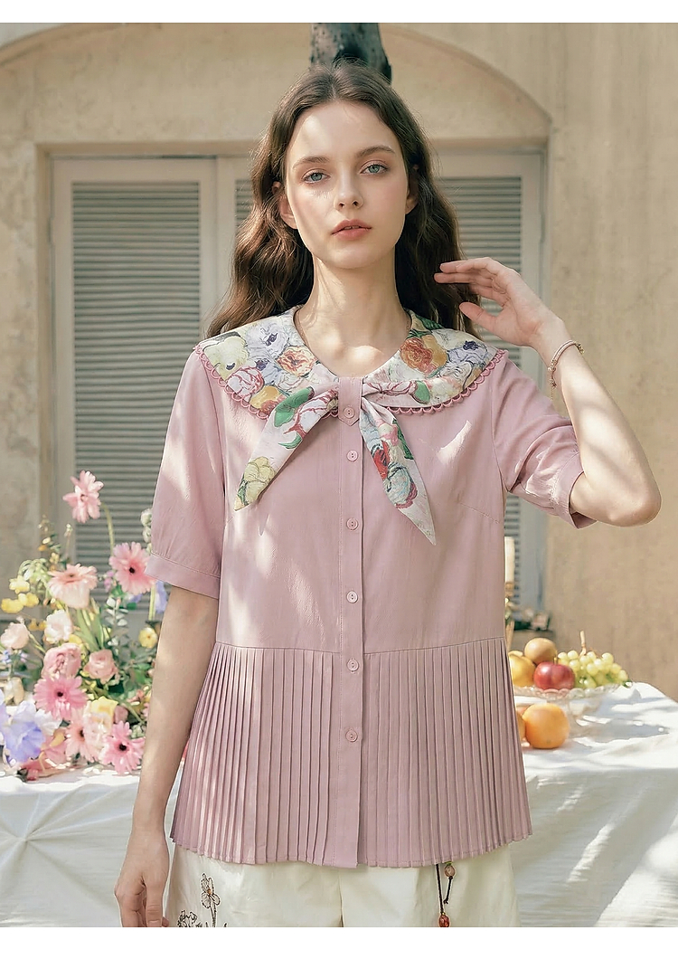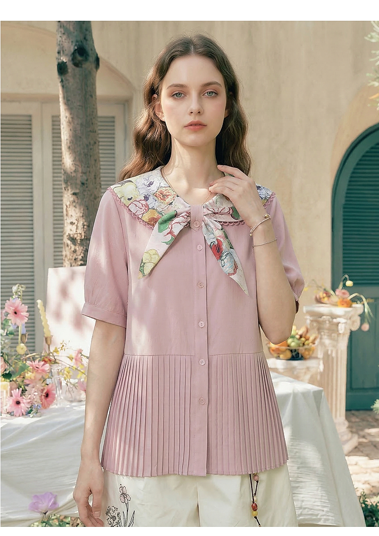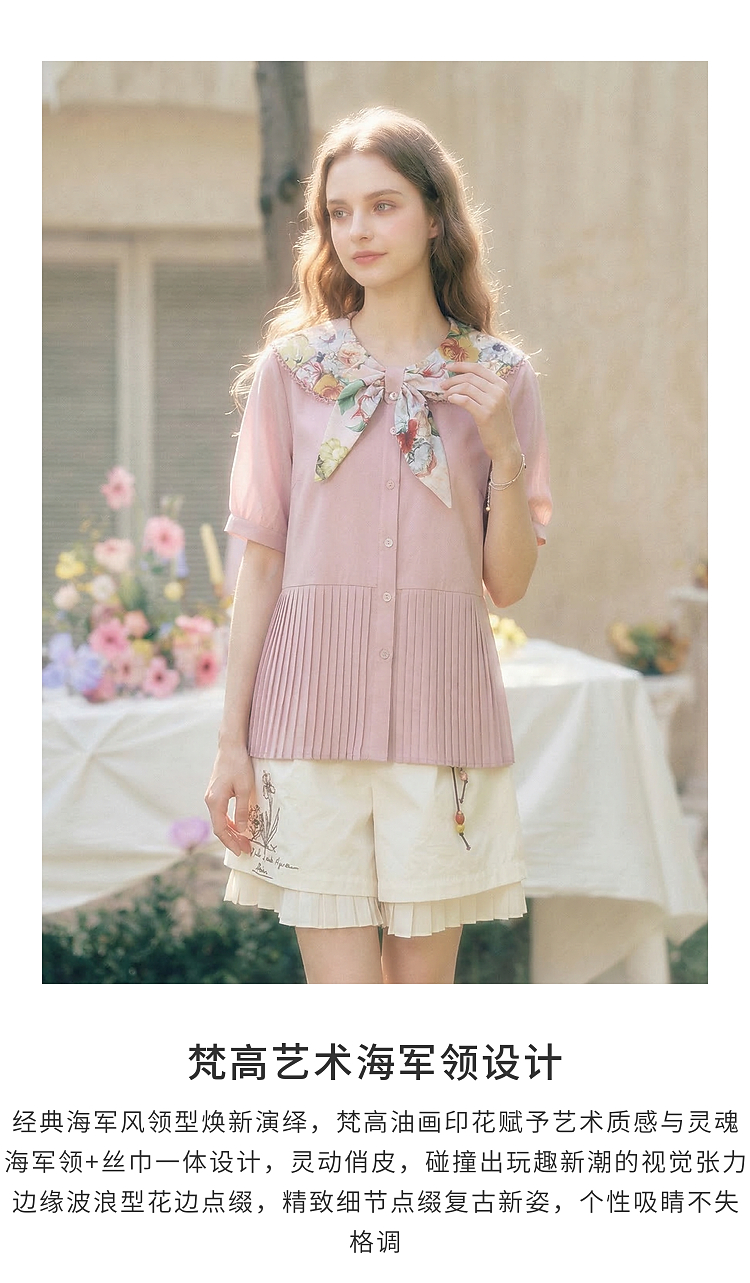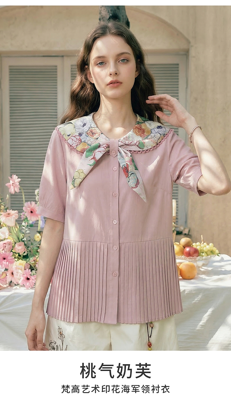 两三事梵高文艺桃气奶芙2026夏季新款印花系带海军领压褶下摆衬衫