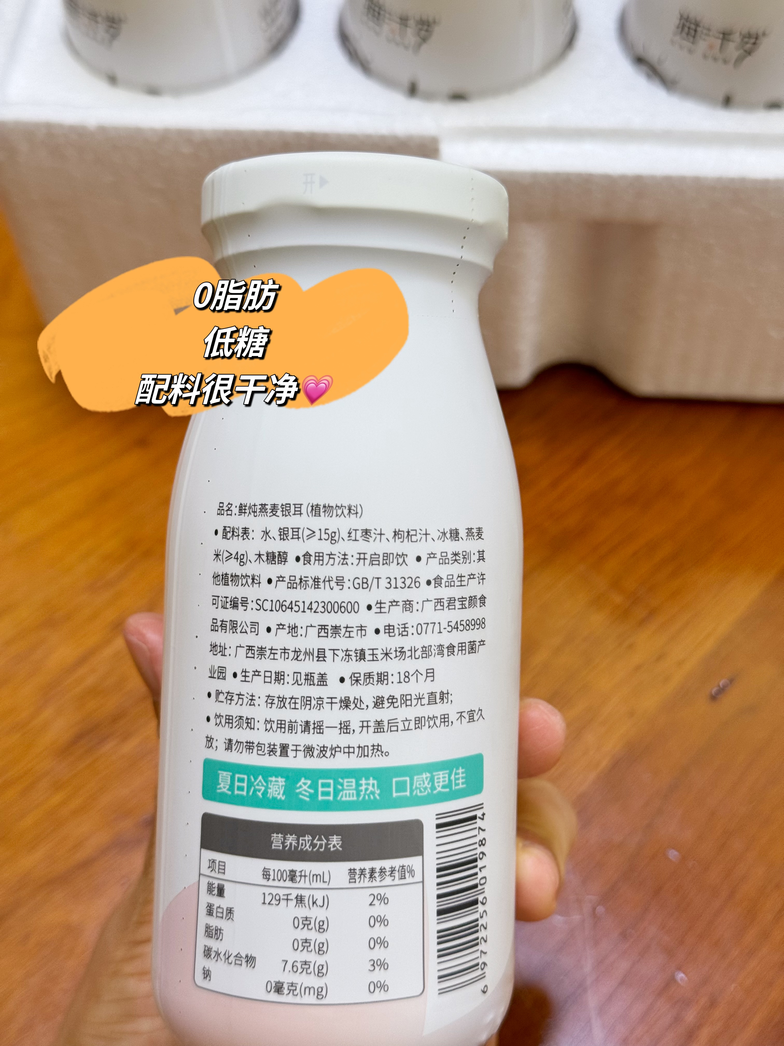 主料鲜银耳为有机认证,辅料红枣、枸杞皆为欧盟有机认证,选取优质燕麦。