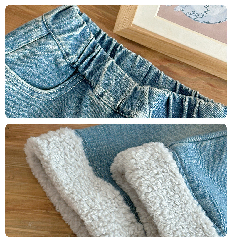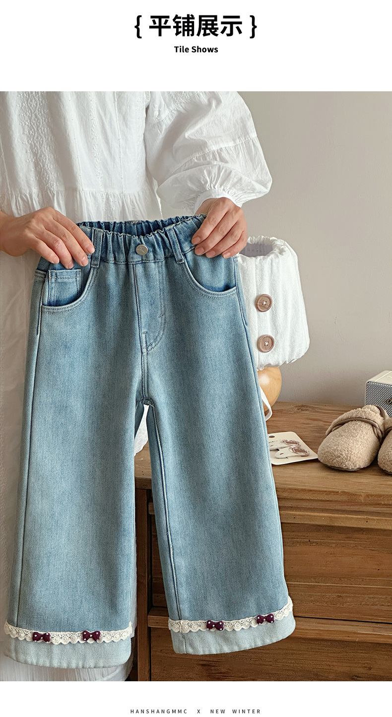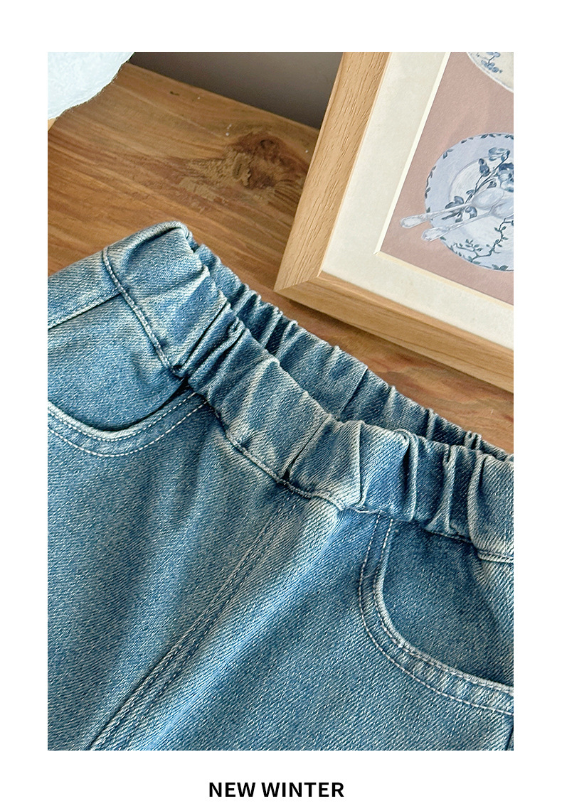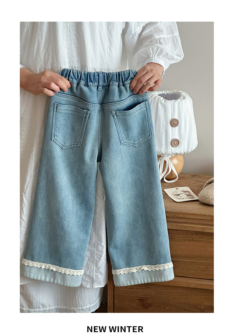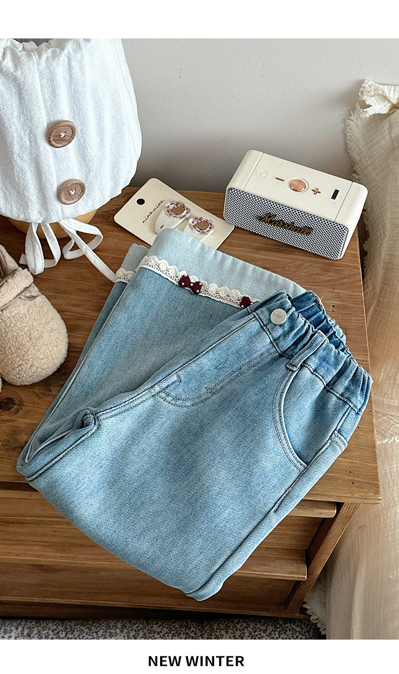 部分码数预售7天内发货!!【儿童服饰丨吾家儿童加绒牛仔裤】内里加绒面料细腻,质地柔软,高弹力松紧裤腰设计,不易挑身型,经典色系搭配花边设计简约不失时髦度,版型廓形宽松舒适,出街或上学穿搭都合适