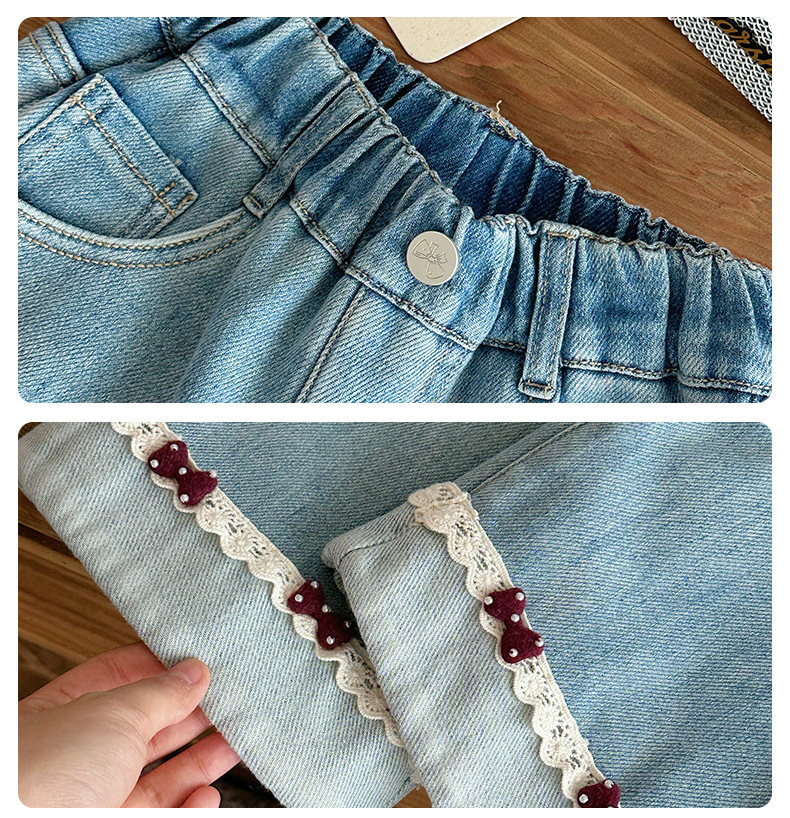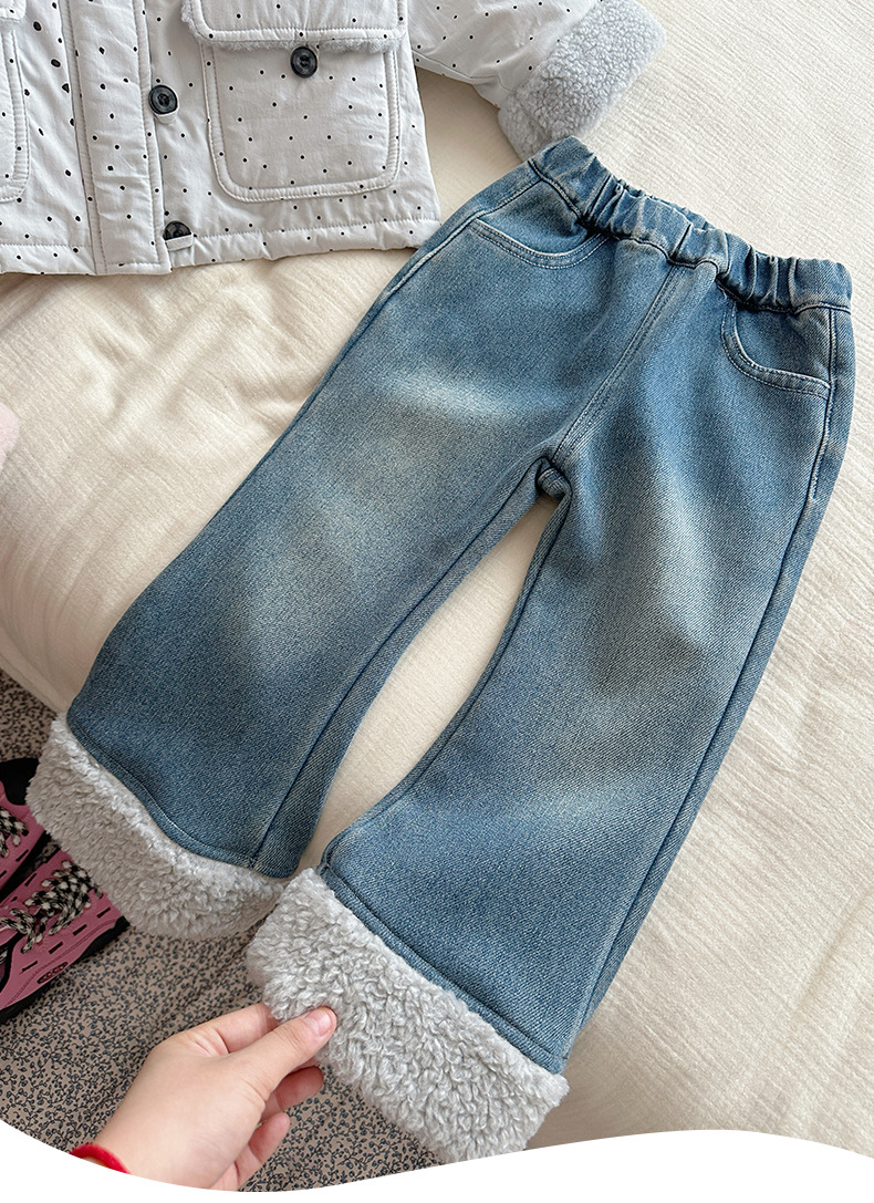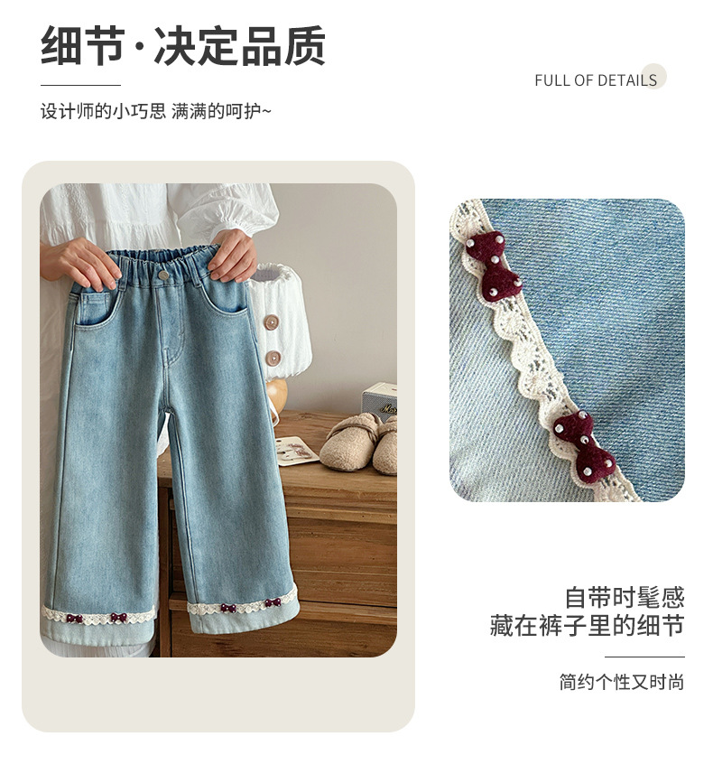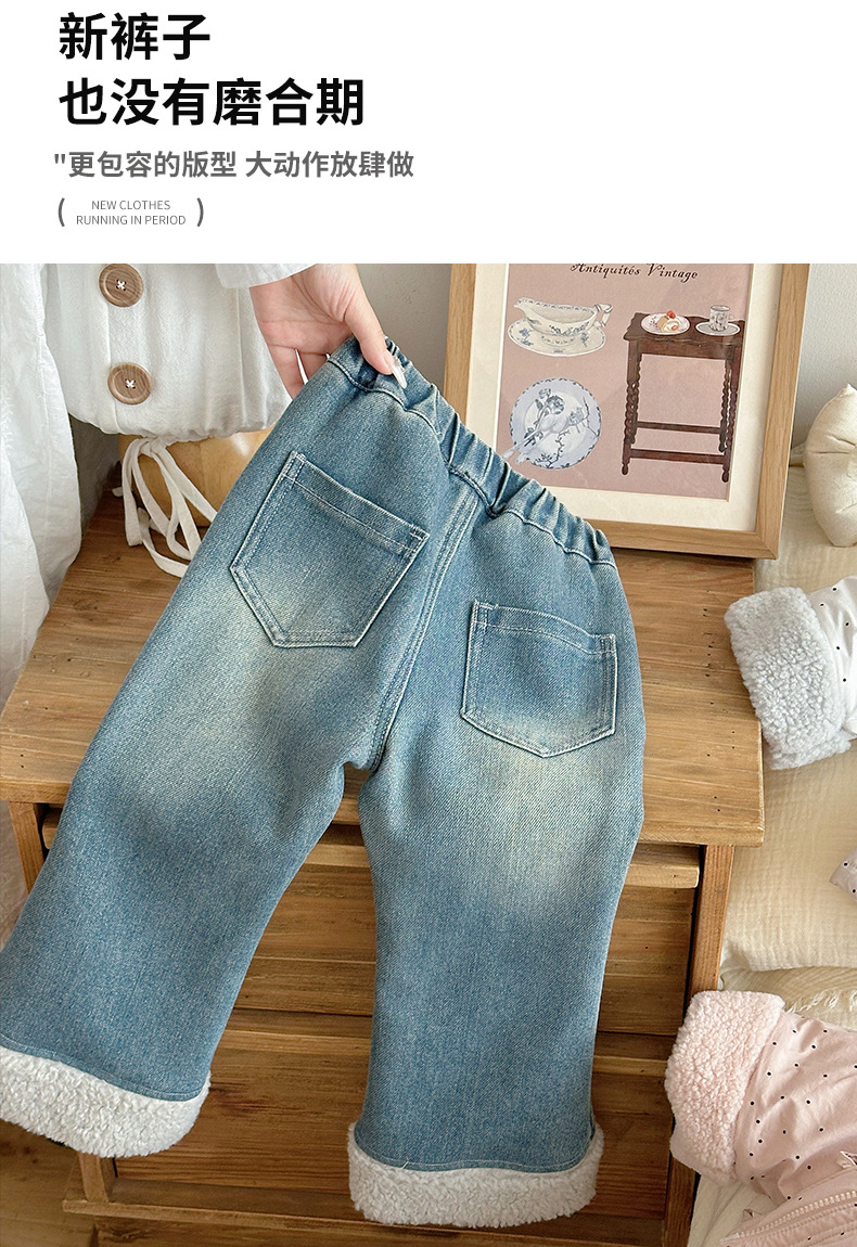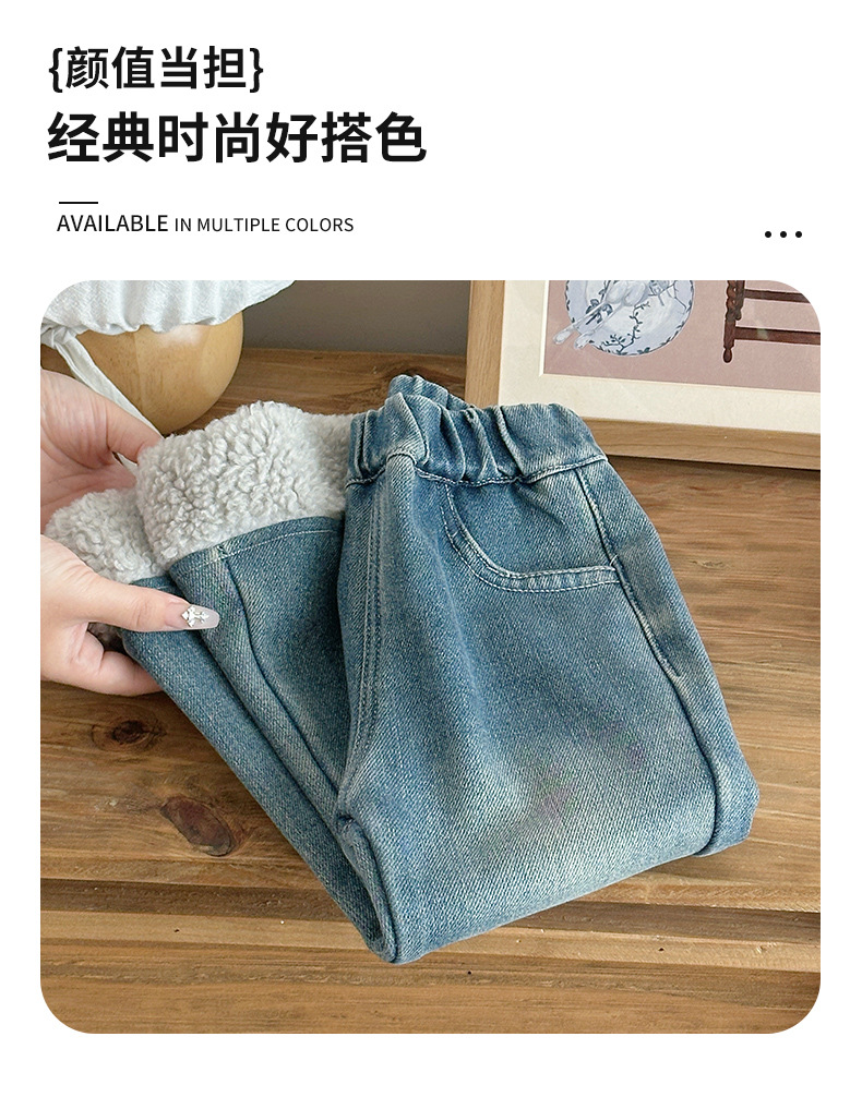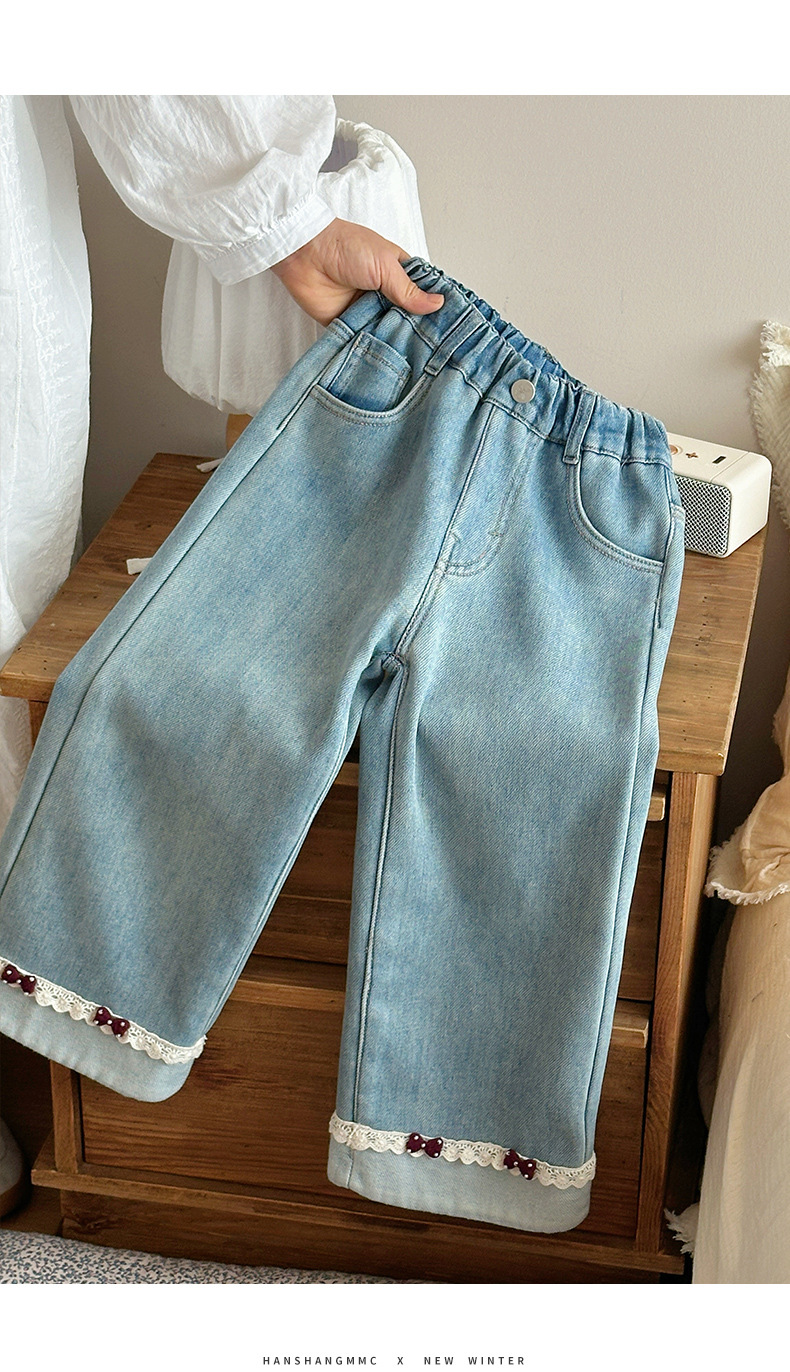 部分码数预售7天内发货!!【儿童服饰丨吾家儿童加绒牛仔裤】内里加绒面料细腻,质地柔软,高弹力松紧裤腰设计,不易挑身型,经典色系搭配花边设计简约不失时髦度,版型廓形宽松舒适,出街或上学穿搭都合适