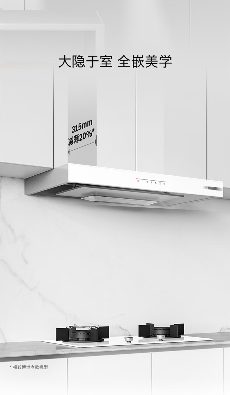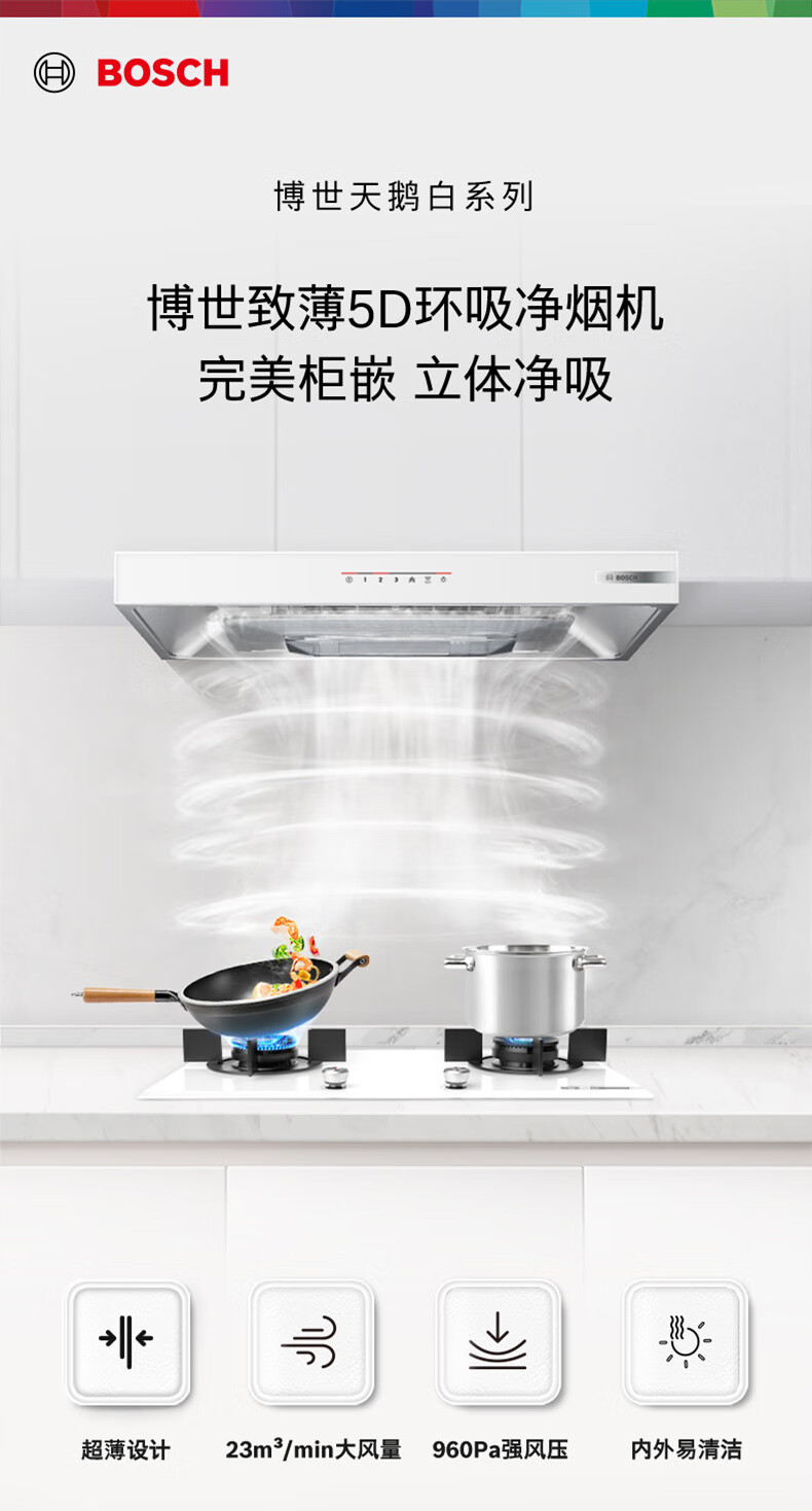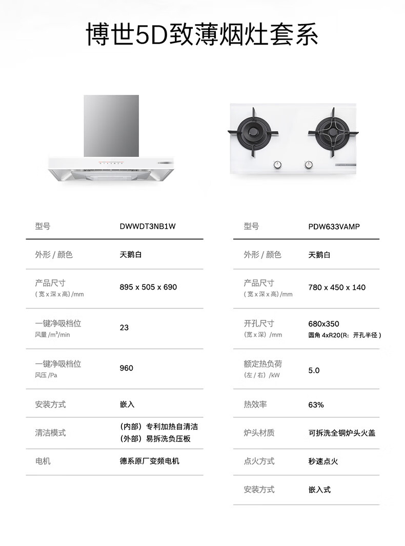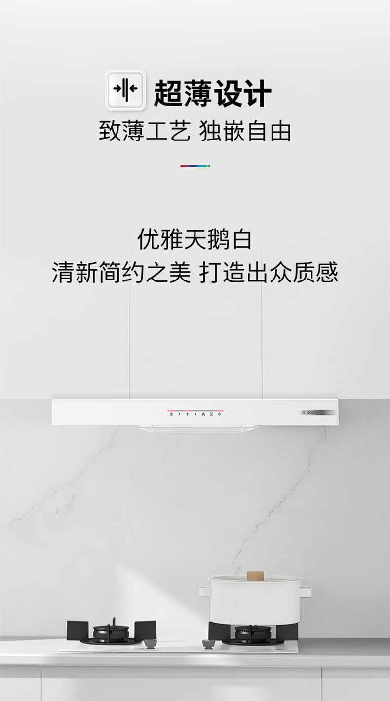 博世(BOSCH)【天鹅白系列】致薄5D烟灶套装 23立方吸抽油烟机 热风自清洁 嵌入式燃气灶 5.0kW大火力 天然气 DWWDT3NB1W+PDW633VAMP