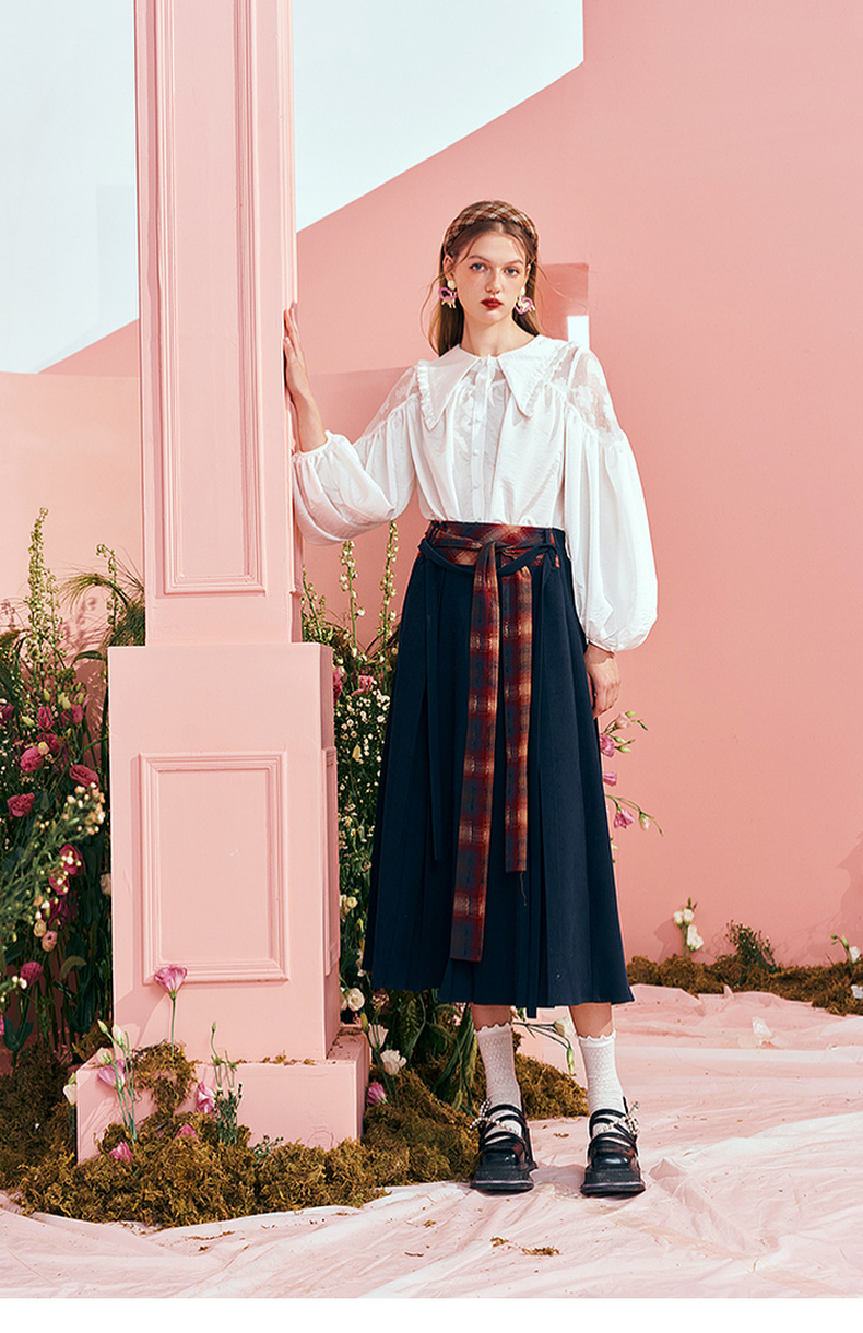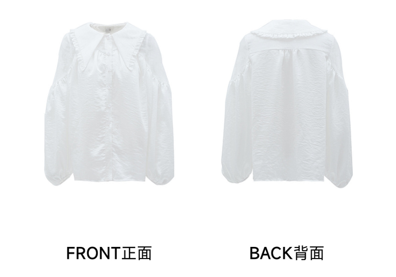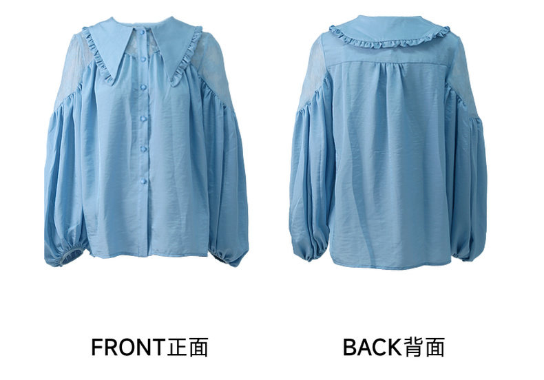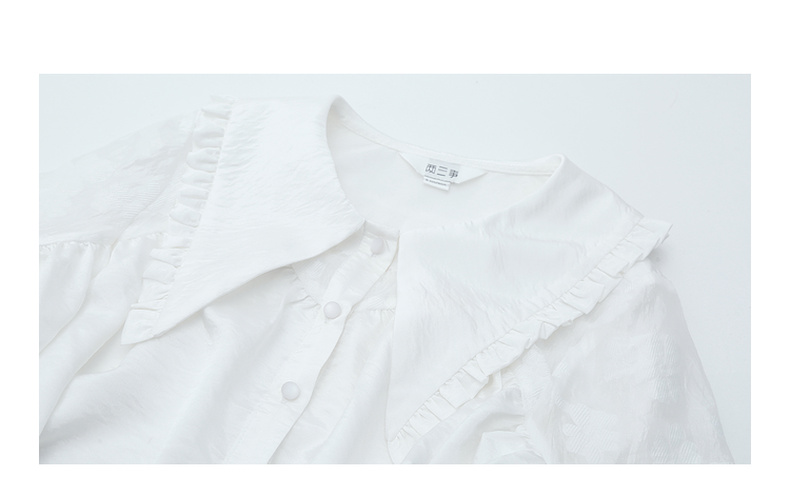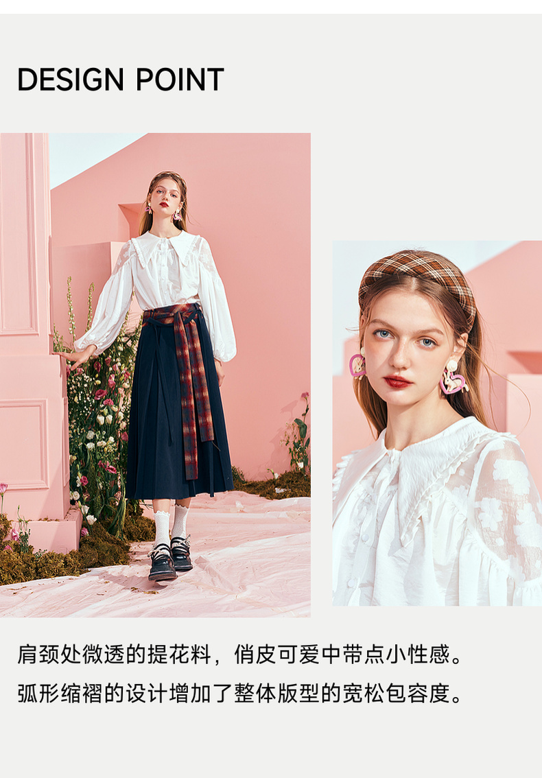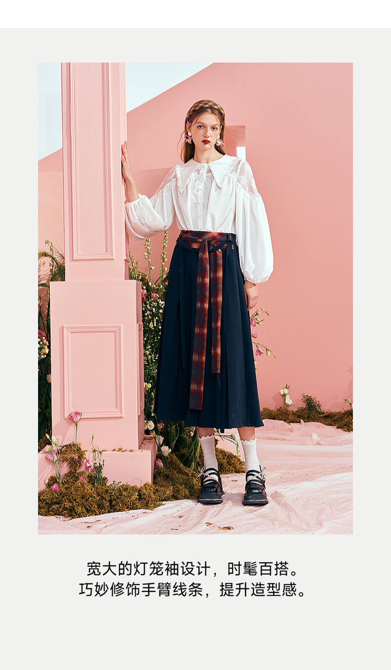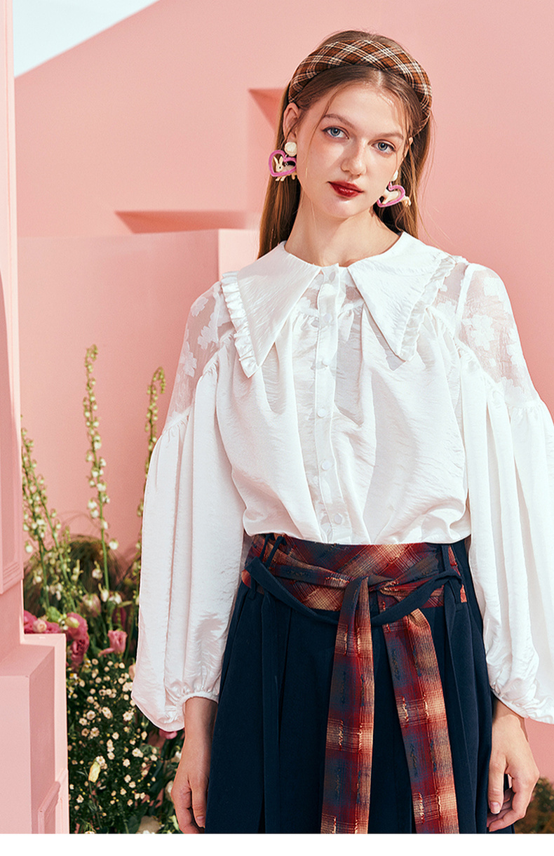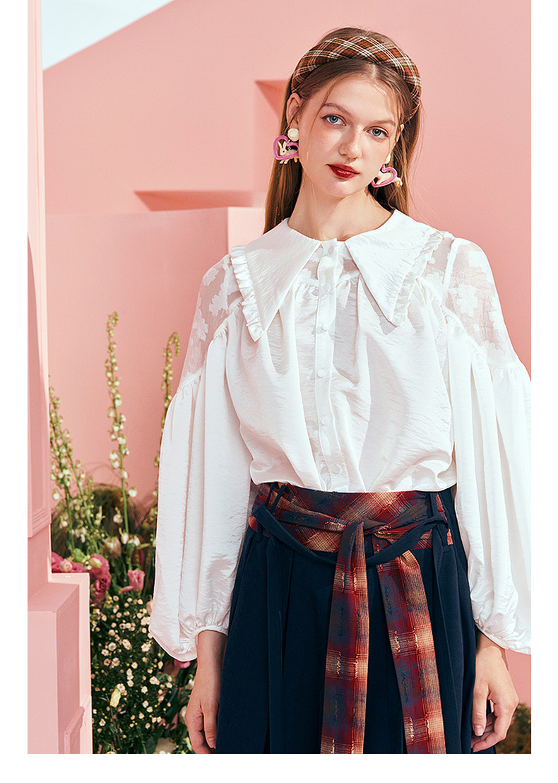 两三事比肩云彩 复古翻领透视提花拼接灯笼袖衬衫