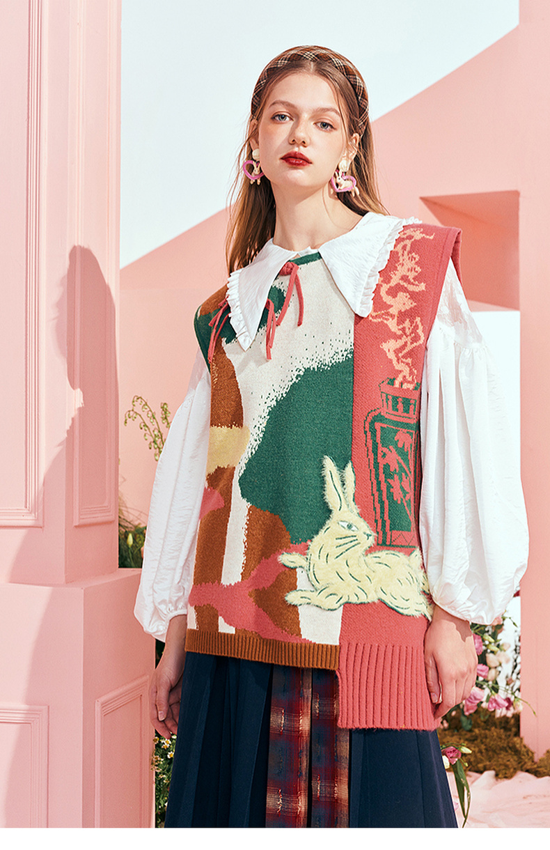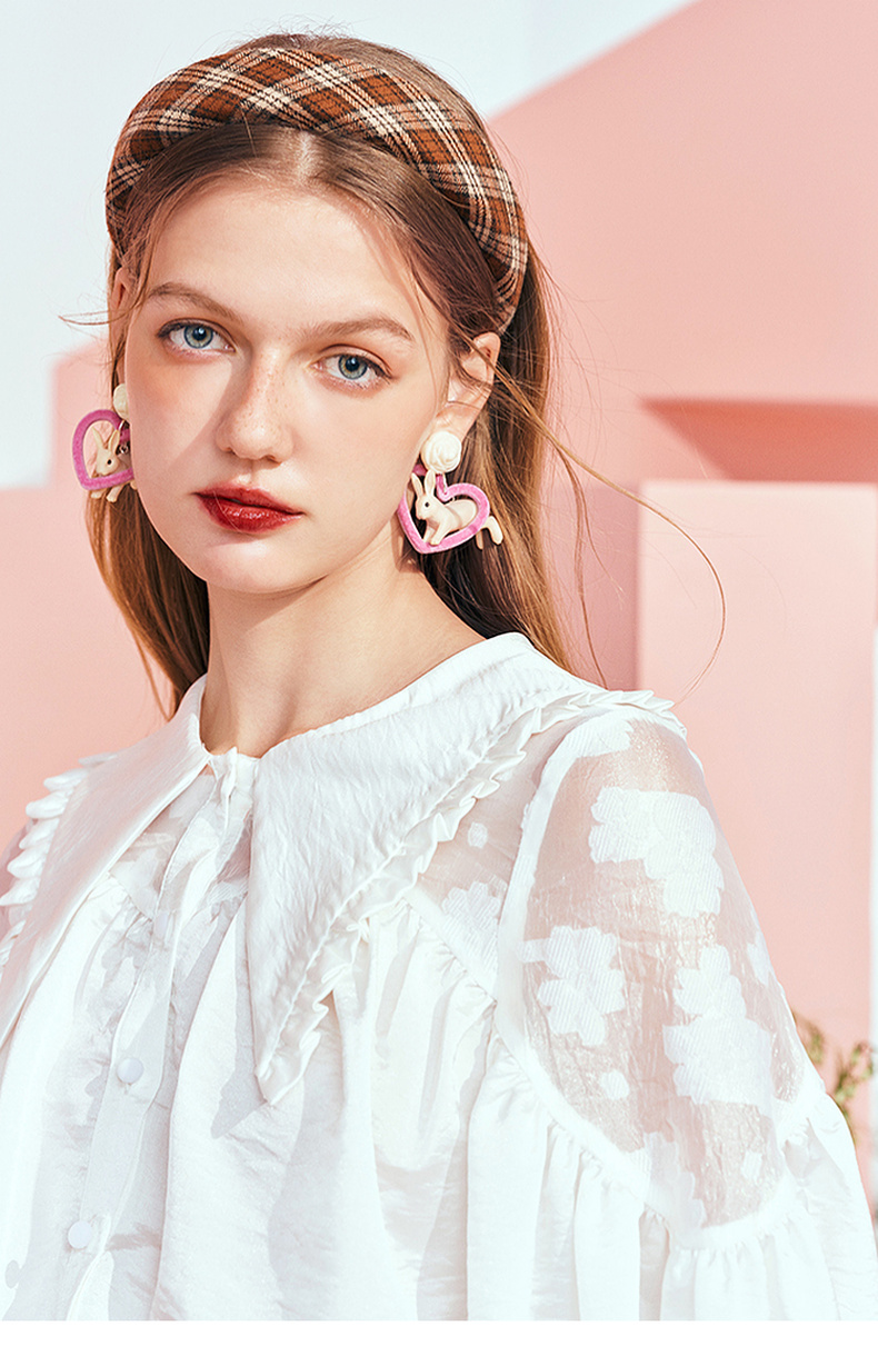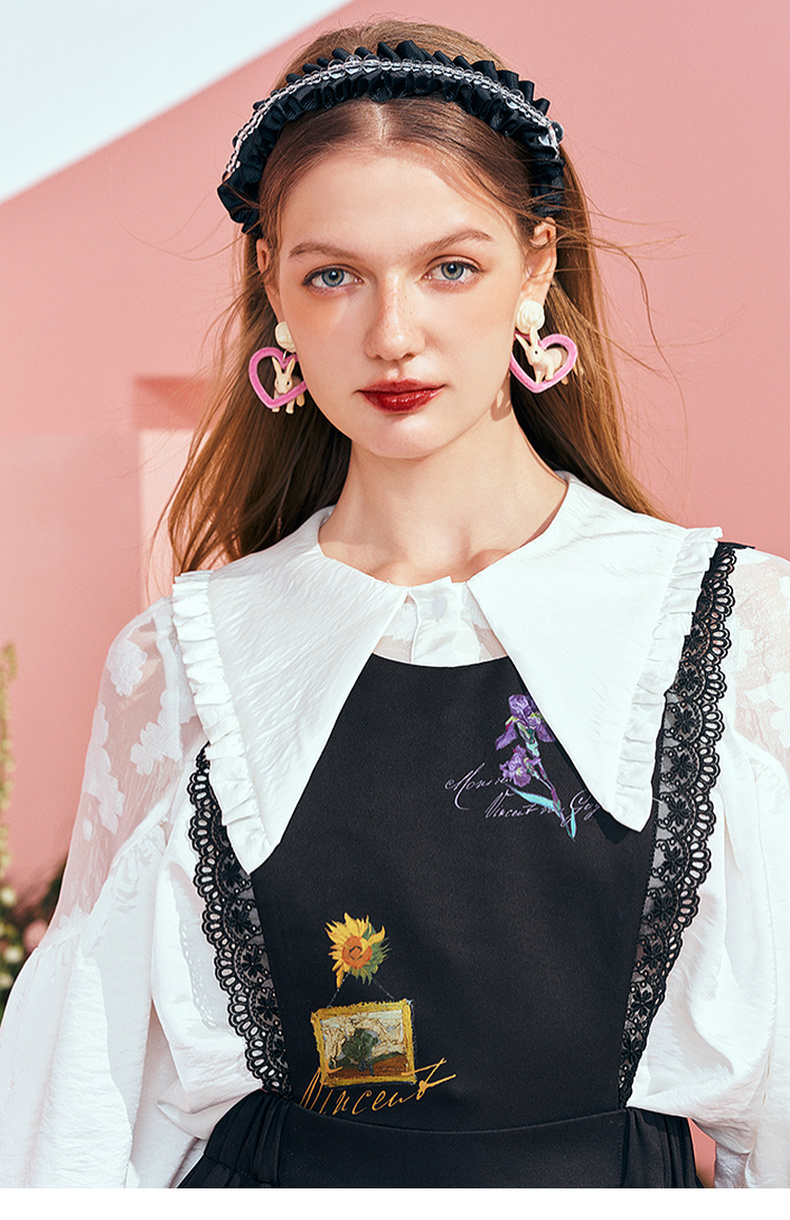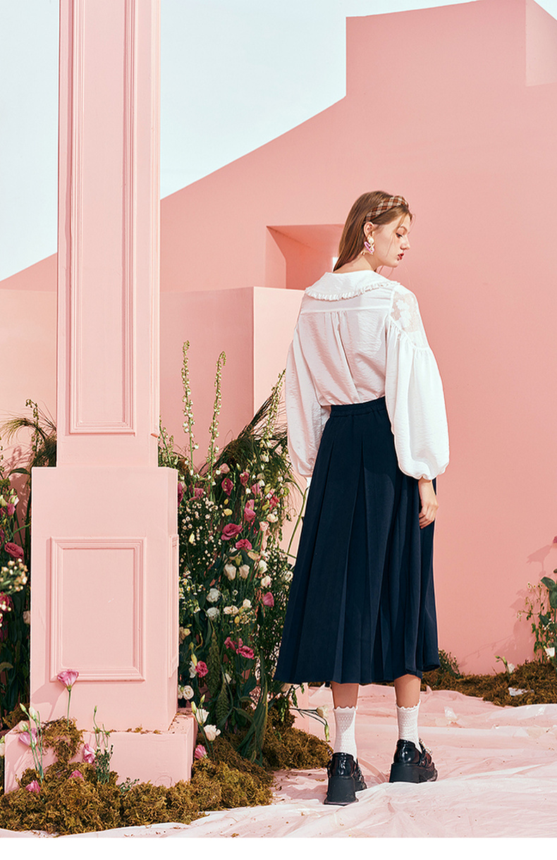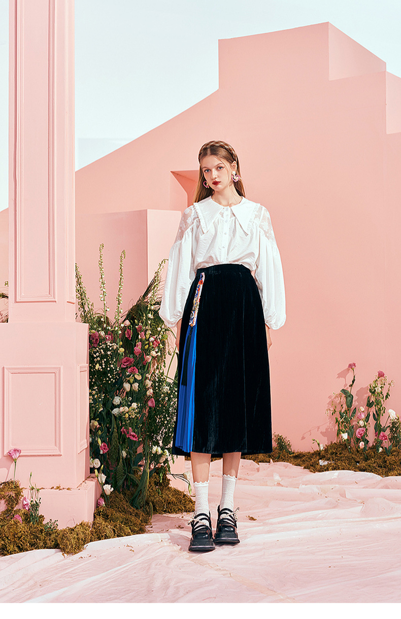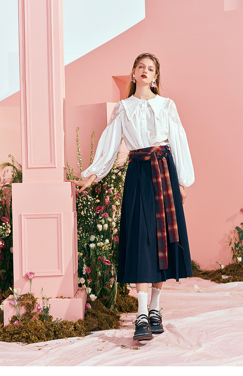 两三事比肩云彩 复古翻领透视提花拼接灯笼袖衬衫