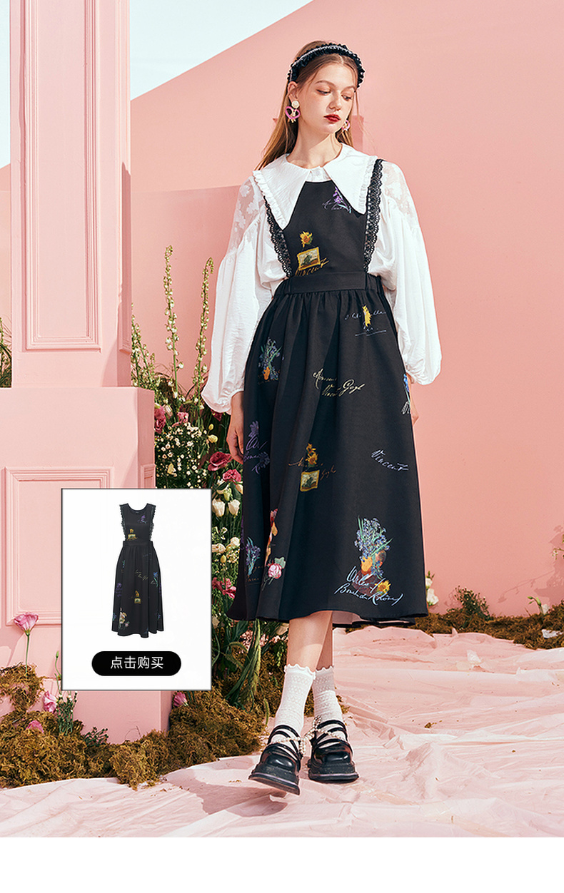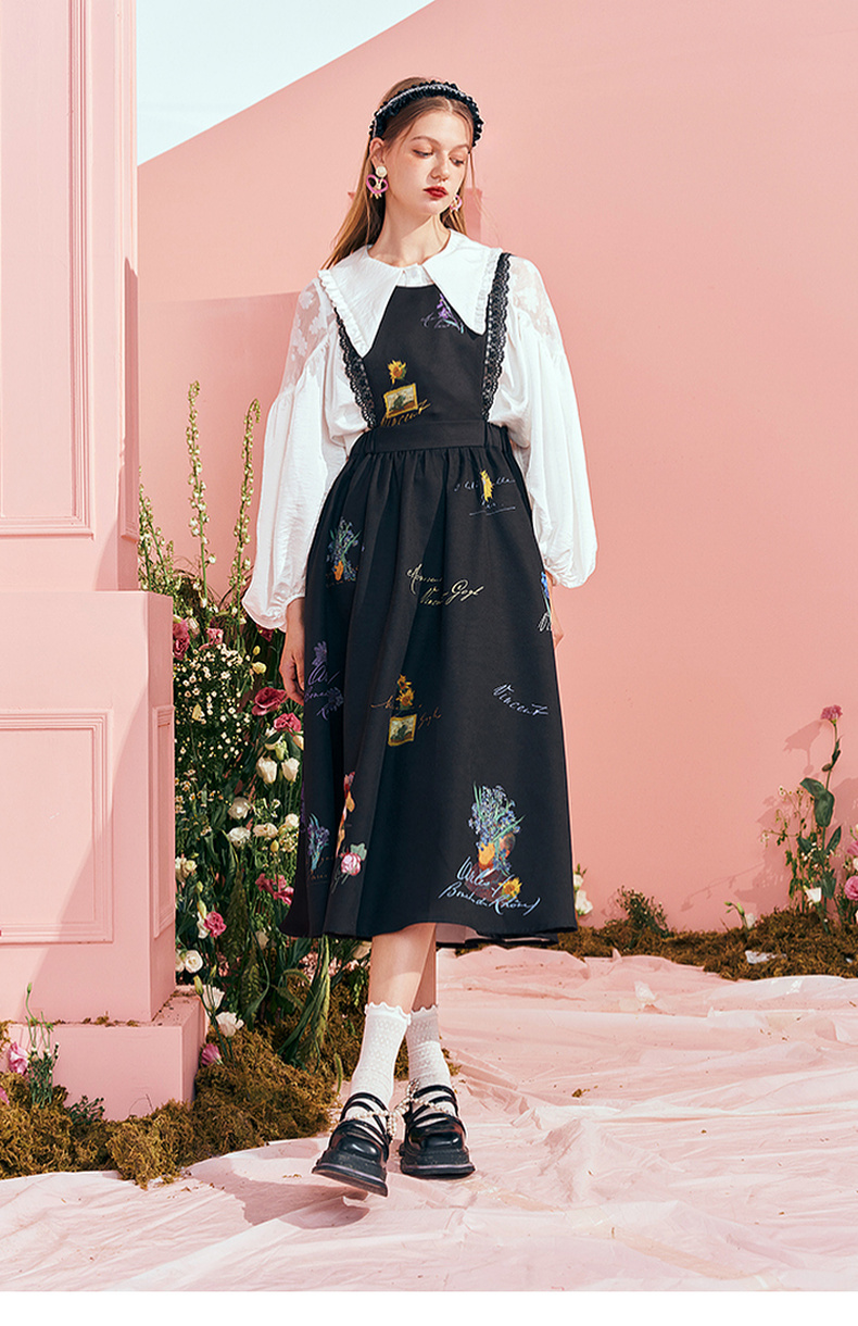两三事梵高文艺 花屿捕梦 2025夏季新款拼布印花荷叶边吊带连衣裙
