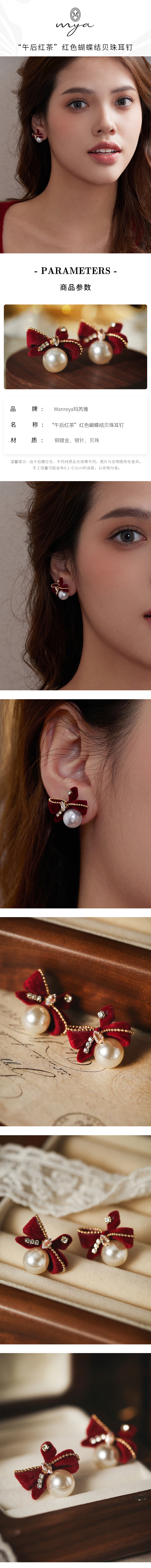 Manreya玛芮雅“午后红茶”红色蝴蝶结贝珠耳钉