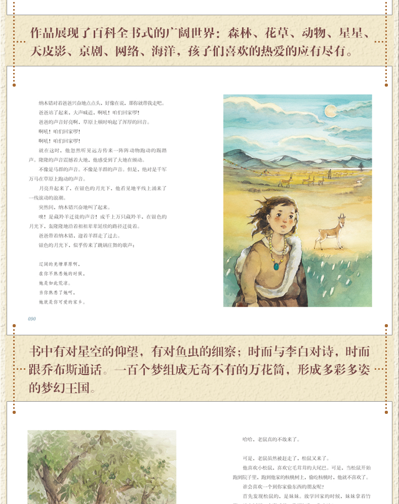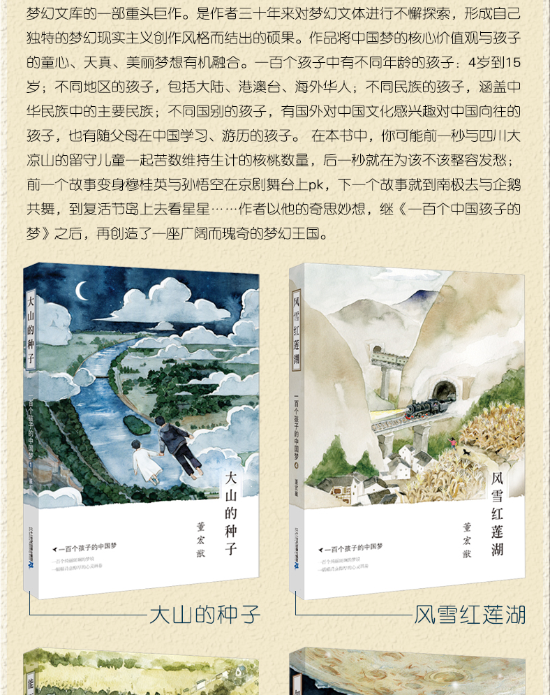 三十年前,由二十一世纪出版社策划并出版的《一百个中国孩子的梦》一经出版便引起巨大反响。三十年后,二十一世纪出版社与作家董宏猷再度联手出版《一百个孩子的中国梦》,旨在通过对不同地区4-13岁孩子梦想的真实刻画和细腻描述,反映当代儿童的生活状态和心灵世界,同时折射出多元的社会生活和深厚的民族文化内涵。在本书中,你可能前一秒与四川大凉山的留守儿童一起苦数维持生计的核桃数量,后一秒你就在为该不该整容发愁;前一个故事变身穆桂英与孙悟空在京剧舞台上pk,下一个故事就到南极去与企鹅共舞,到复活节岛上去看星星……作者时而以诗体语言铺排激情,时而用白描的文字勾勒美景,时而运用蒙太奇手法,把各种形象组合叠加产生梦境……作者以他的奇思妙想,继《一百个中国孩子的梦》之后又创造了一座广阔而瑰奇的梦幻王国。