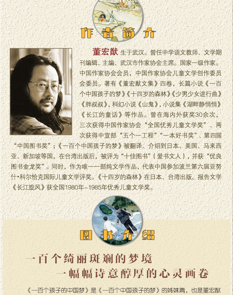 《一百个孩子的中国梦》是《一百个中国孩子的梦》的姊妹篇,也是董宏猷梦幻文库的一部重头巨作。是作者三十年来对梦幻文体进行不懈探索,形成自己独特的梦幻现实主义创作风格而结出的硕果。作品将中国梦的核心价值观与孩子的童心、天真、美丽梦想有机融合。一百个孩子中有不同年龄的孩子:4岁到15岁;不同地区的孩子,包括大陆、港澳台、海外华人;不同民族的孩子,涵盖中华民族中的主要民族;不同国别的孩子,有国外对中国文化感兴趣对中国向往的孩子,也有随父母在中国学习、游历的孩子。一百个梦展现了百科全书式的广阔世界:森林、花草、动物、星星、天皮影、京剧、网络、海洋,孩子们喜欢的热爱的应有尽有。书中有对星空的仰望,有对鱼虫的细察;时而与李白对诗,时而跟乔布斯通话。一百个梦组成无奇不有的万花筒,形成多彩多姿的梦幻王国。不仅反映了当下儿童的生活状态和心理状态,也折射、反映出多元的社会生活和深厚的文化内涵。该书荣获2016年“国家主题出版重点出版物”“总局向青少年推荐百种优秀读物”。